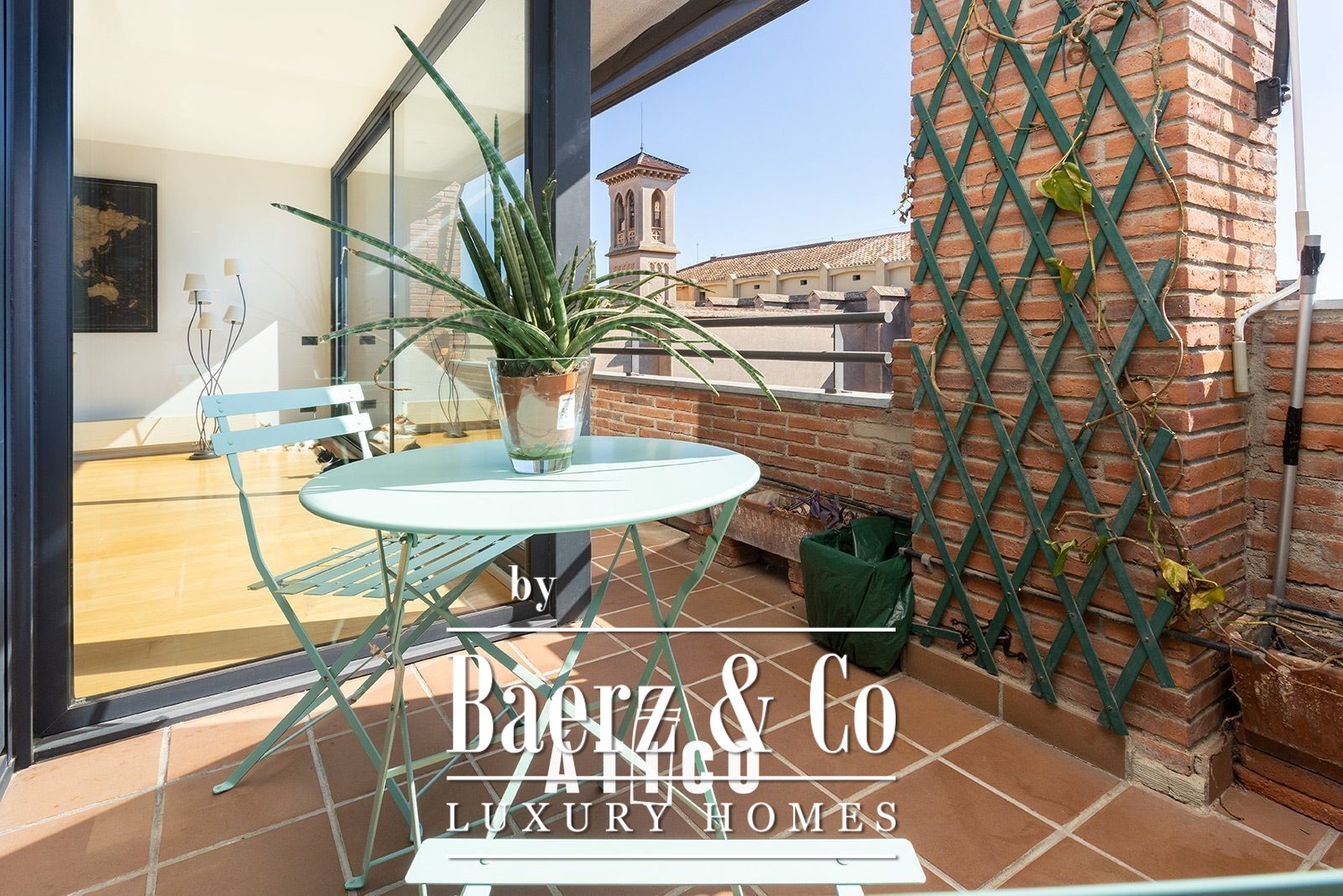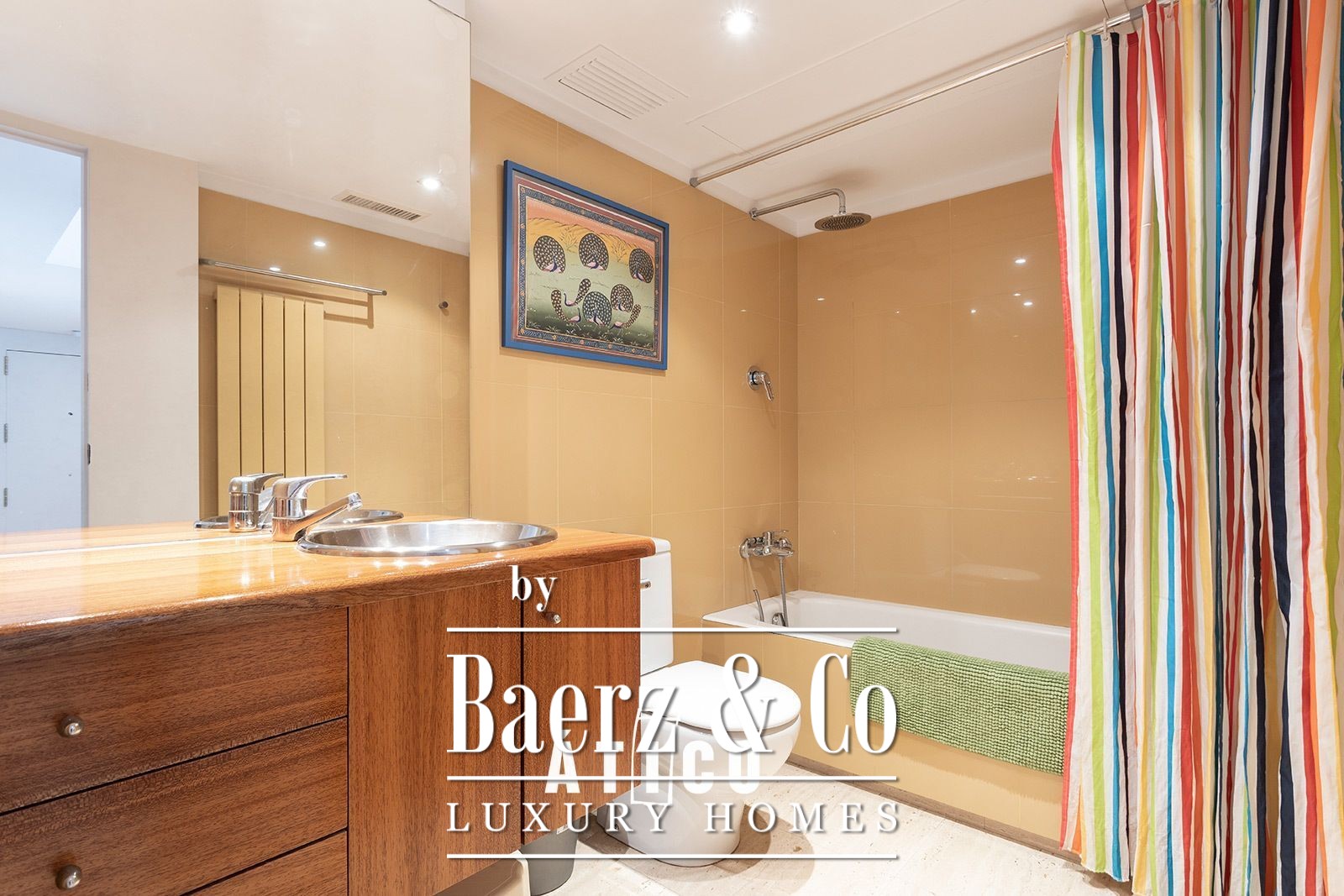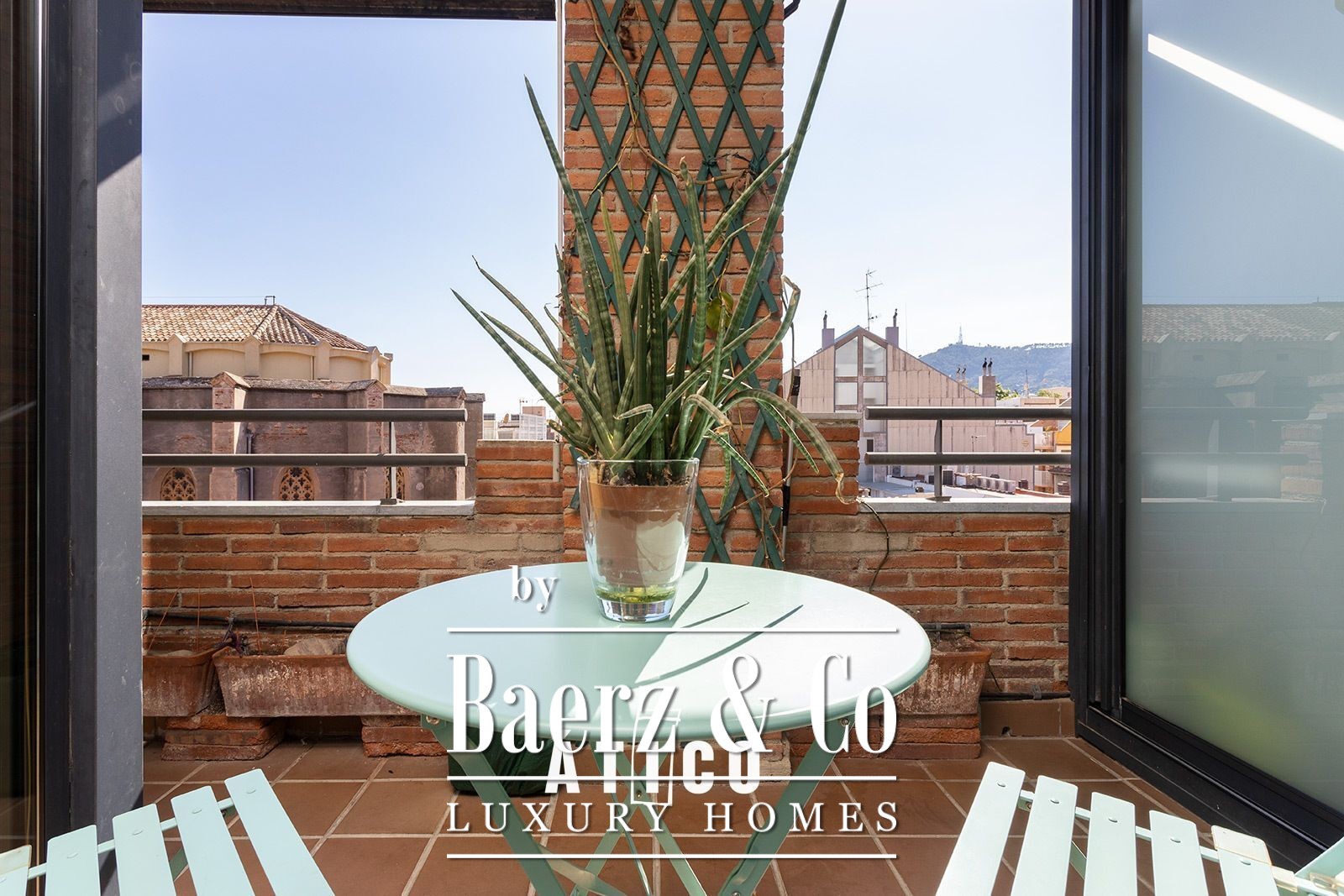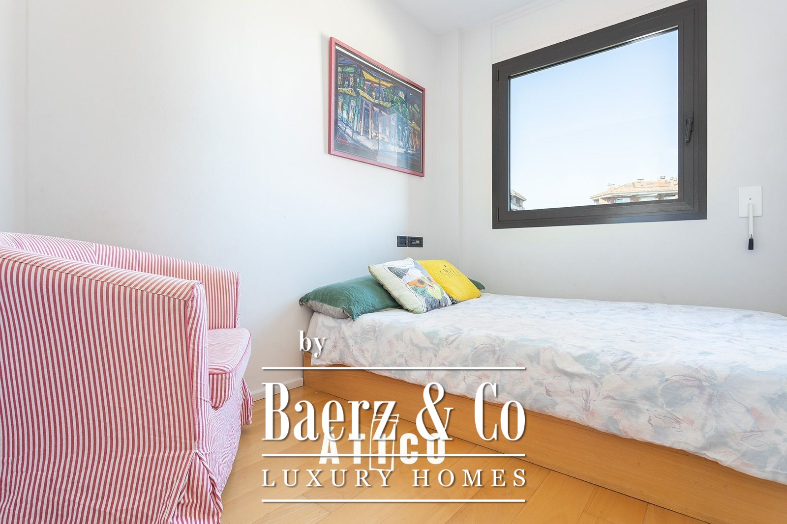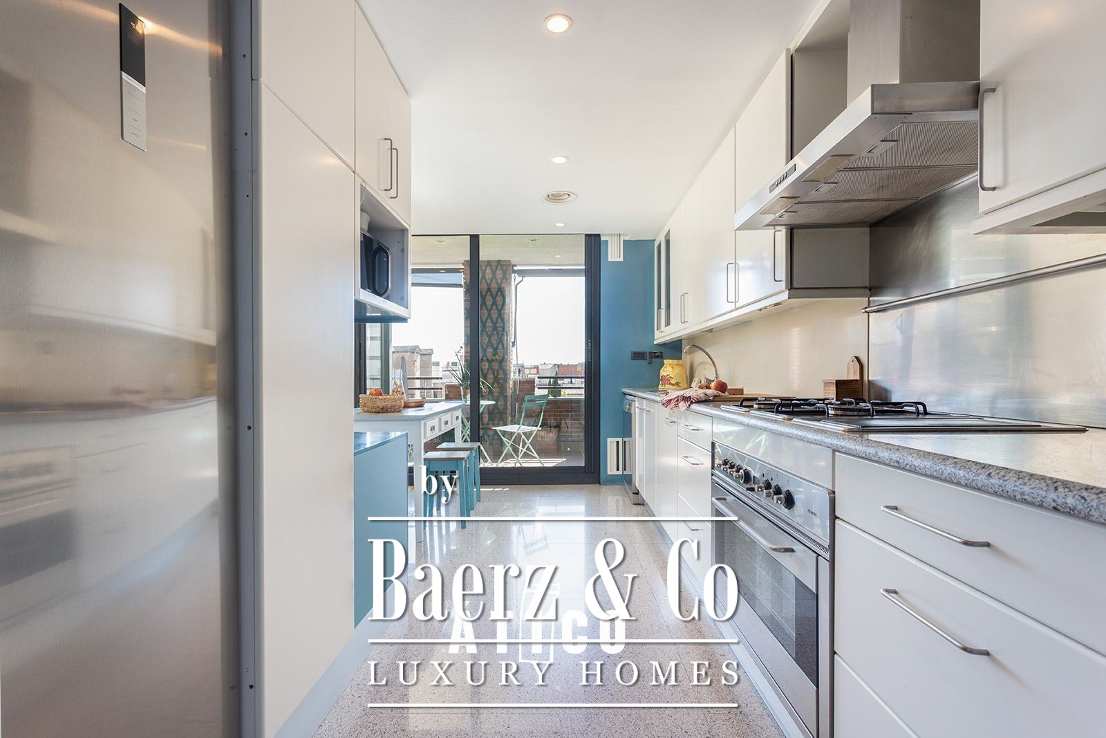 This duplex penthouse Barcelona offers 227 m² of living space across two serene levels in the tranquil Sarrià neighborhood. The first floor welcomes you with a spacious living and dining area, a kitchen adaptable with sliding doors, and generous light filtering in from its elevated orientation. Two double bedrooms share a bathroom, providing a quiet rhythm for daily life.