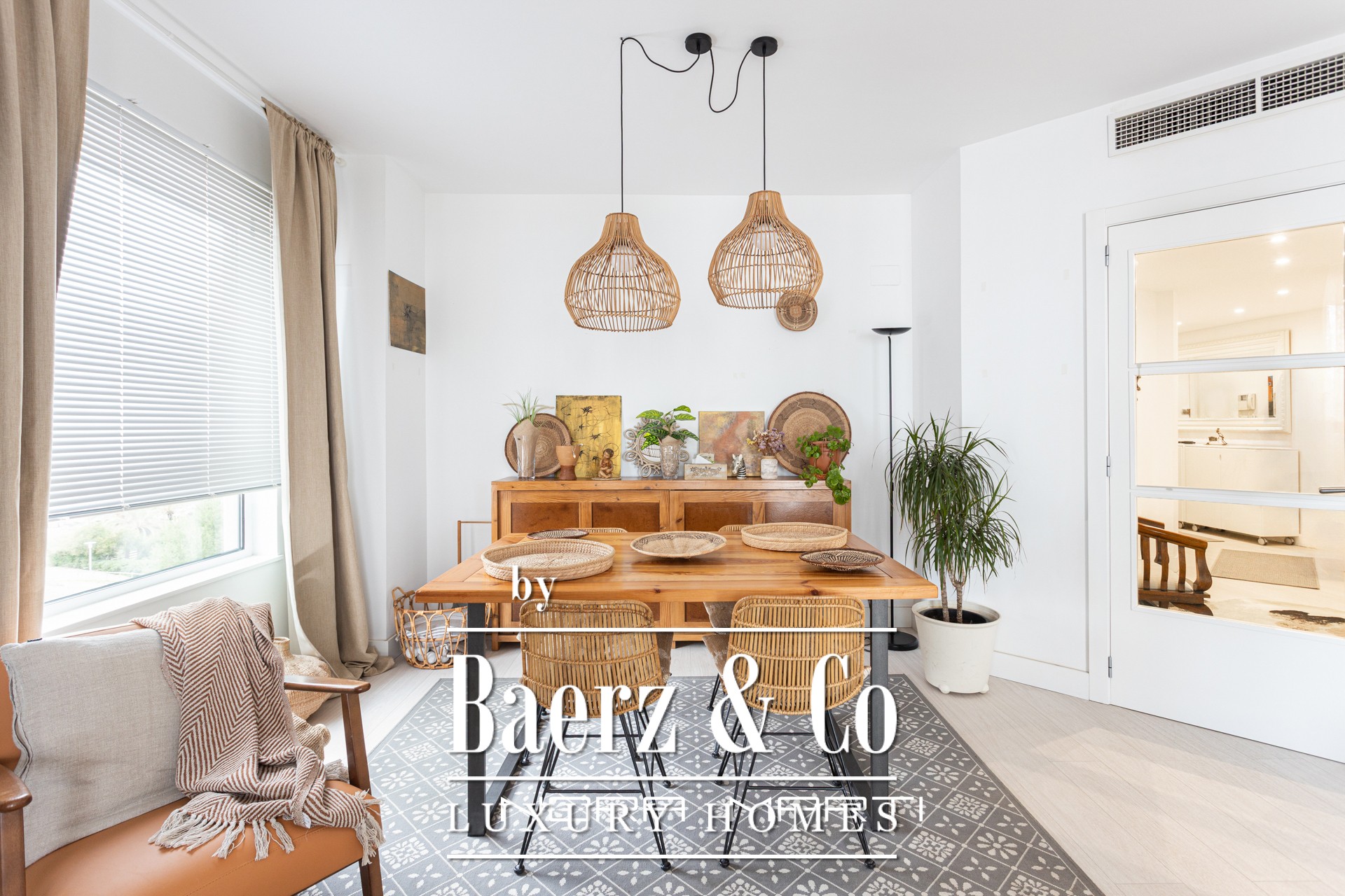 The layout is thoughtfully functional, with four bedrooms and two bathrooms, including a secluded primary suite featuring an en suite bath, dressing room, and direct access to the terrace. The generous living-dining space opens seamlessly onto the terrace, maintaining a temperate rhythm of daylight throughout, while the kitchen integrates an office zone and dedicated laundry area with exterior access.