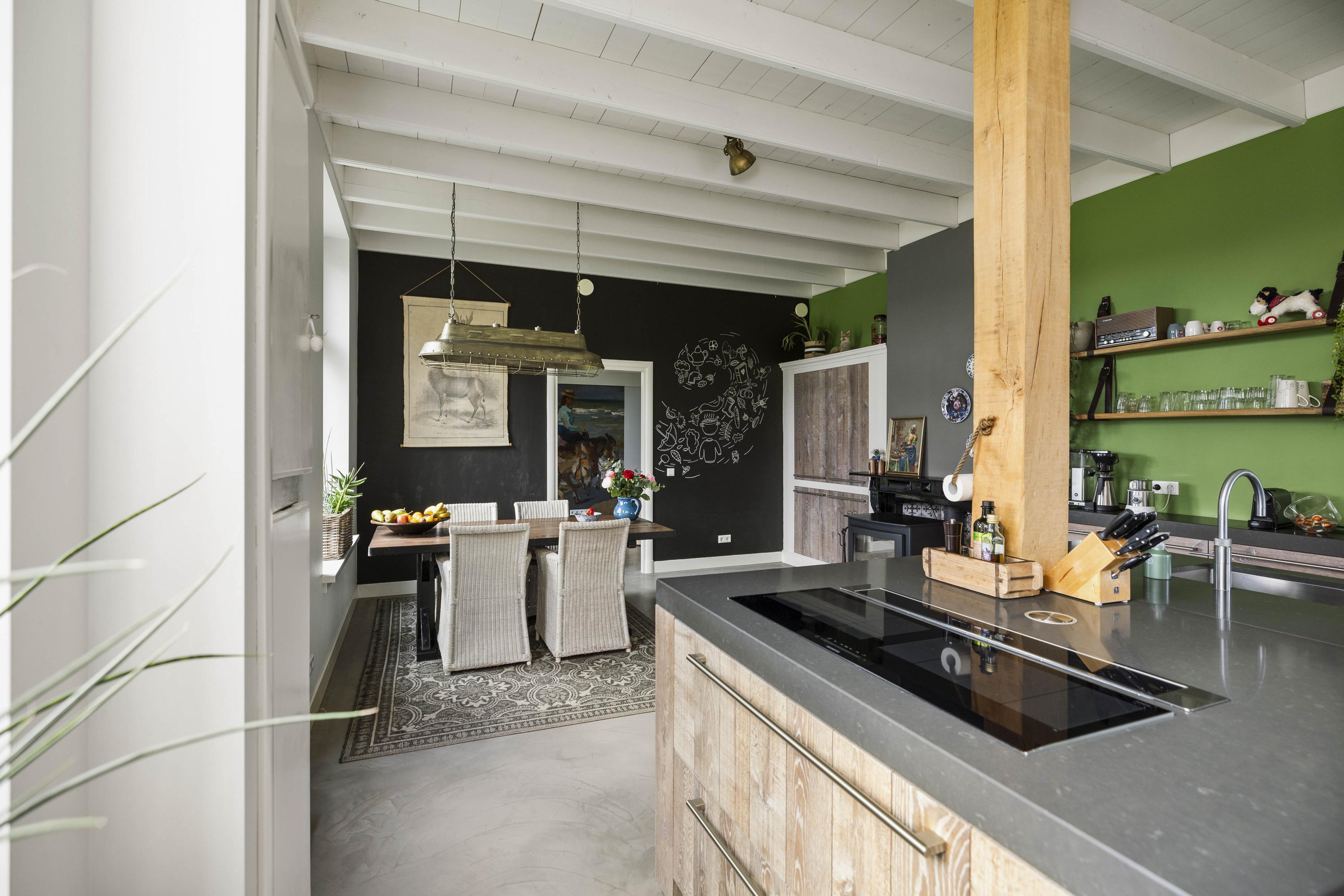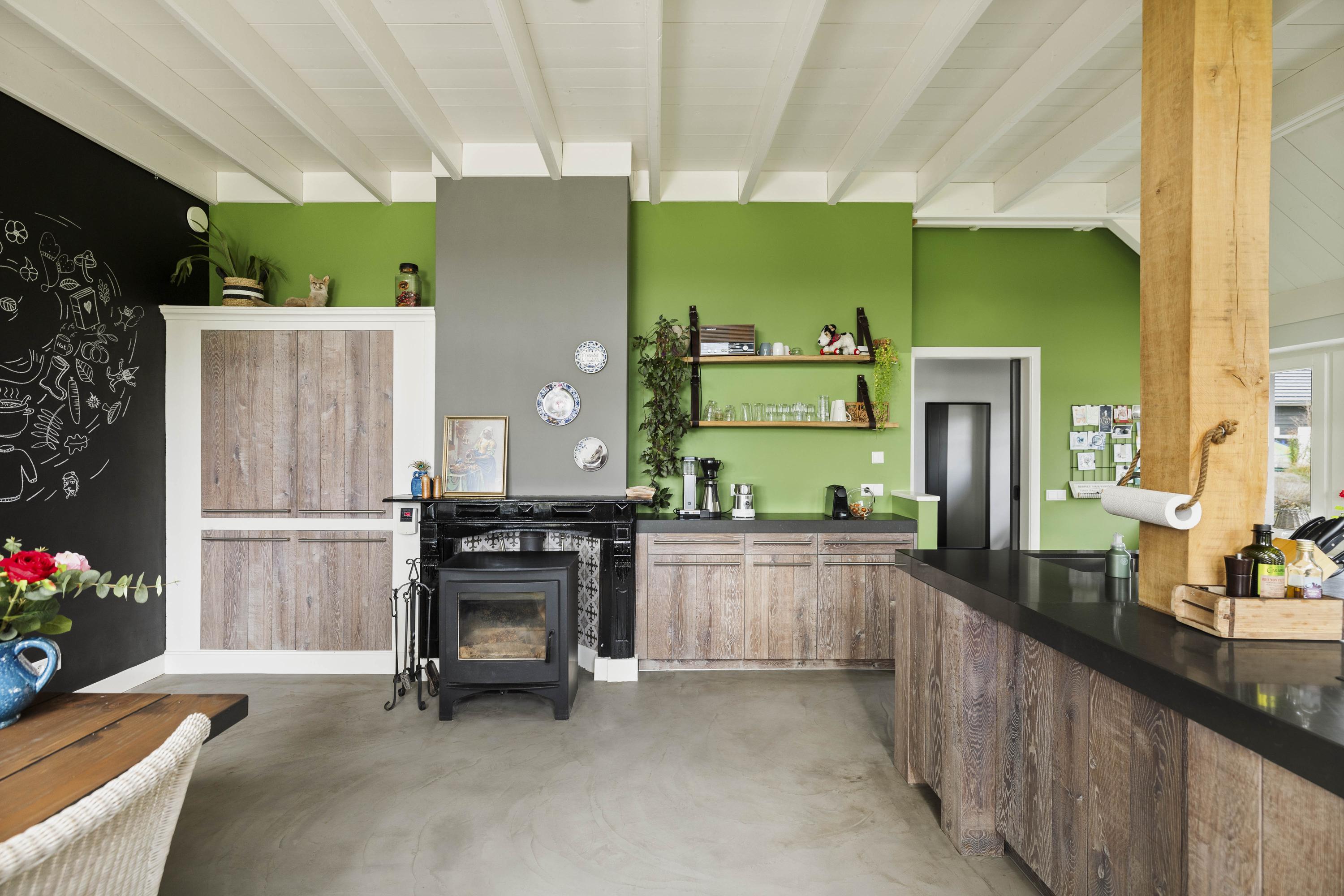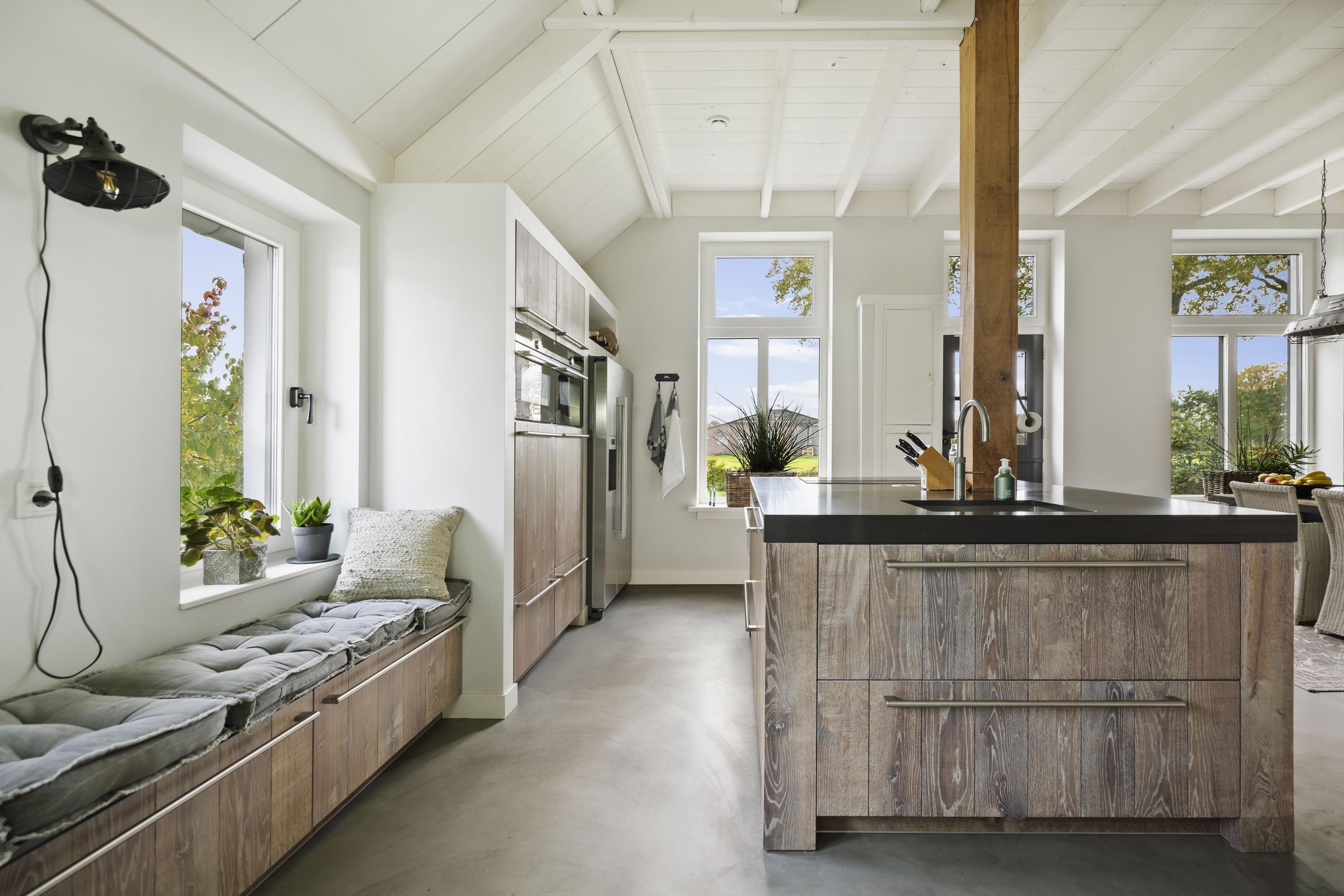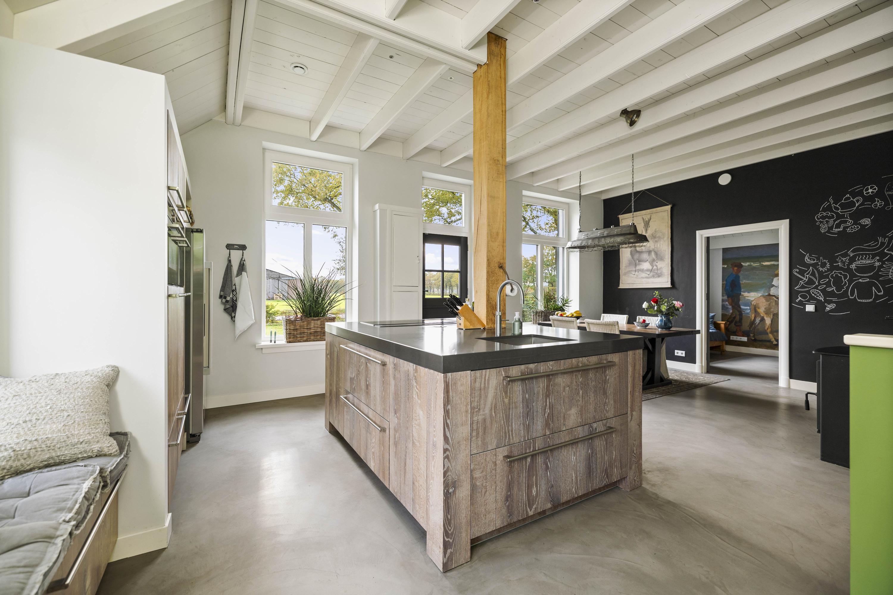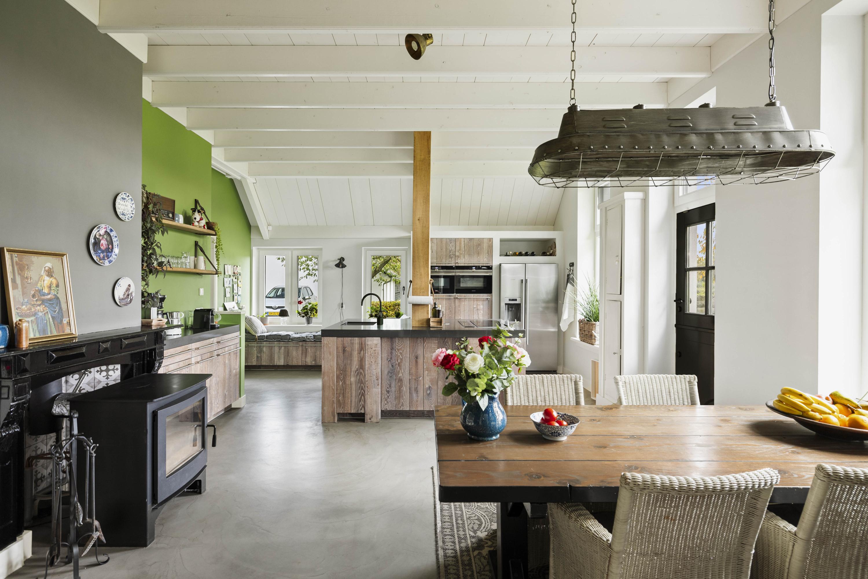 The kitchen is custom-made by Scheffer Keukens Zelhem and is nothing short of impressive; with a thick composite worktop, robust solid oak fronts and all modern built-in appliances – from induction hob to Quooker – it is a wonderful place to indulge your inner chef. The old fireplace still has a sturdy Nordic Fire wood-burning stove, which provides the kitchen with extra atmosphere and warmth.