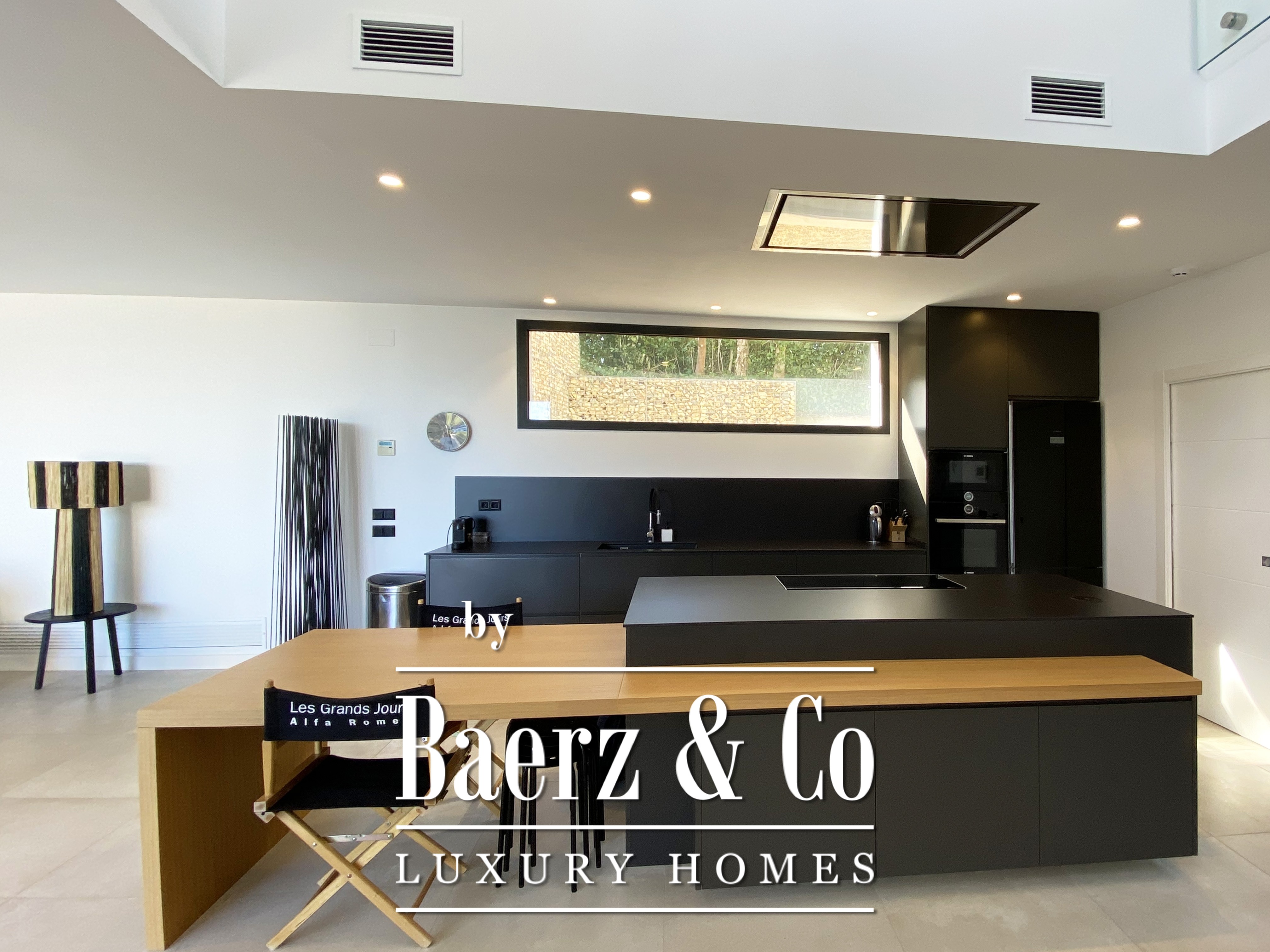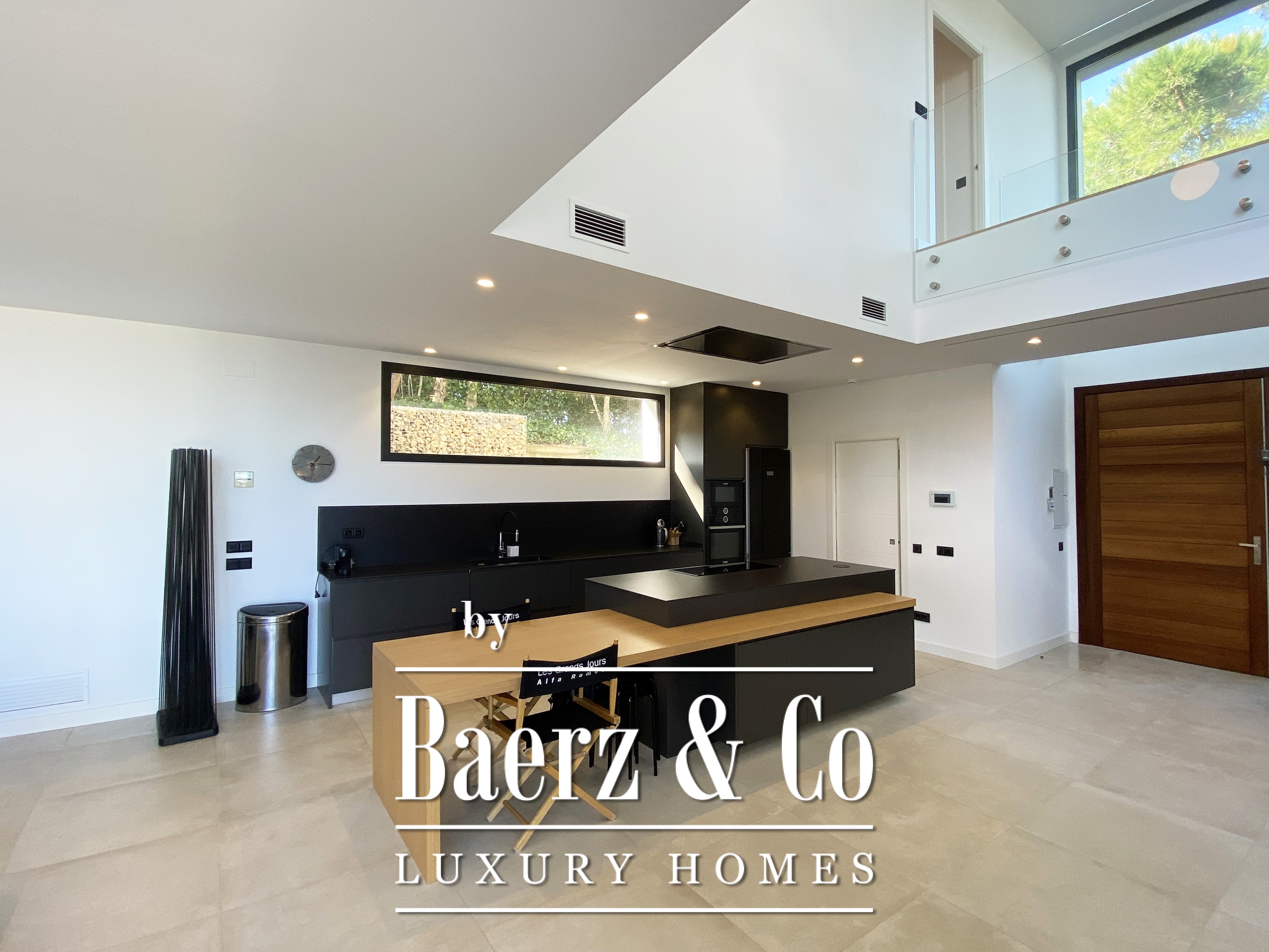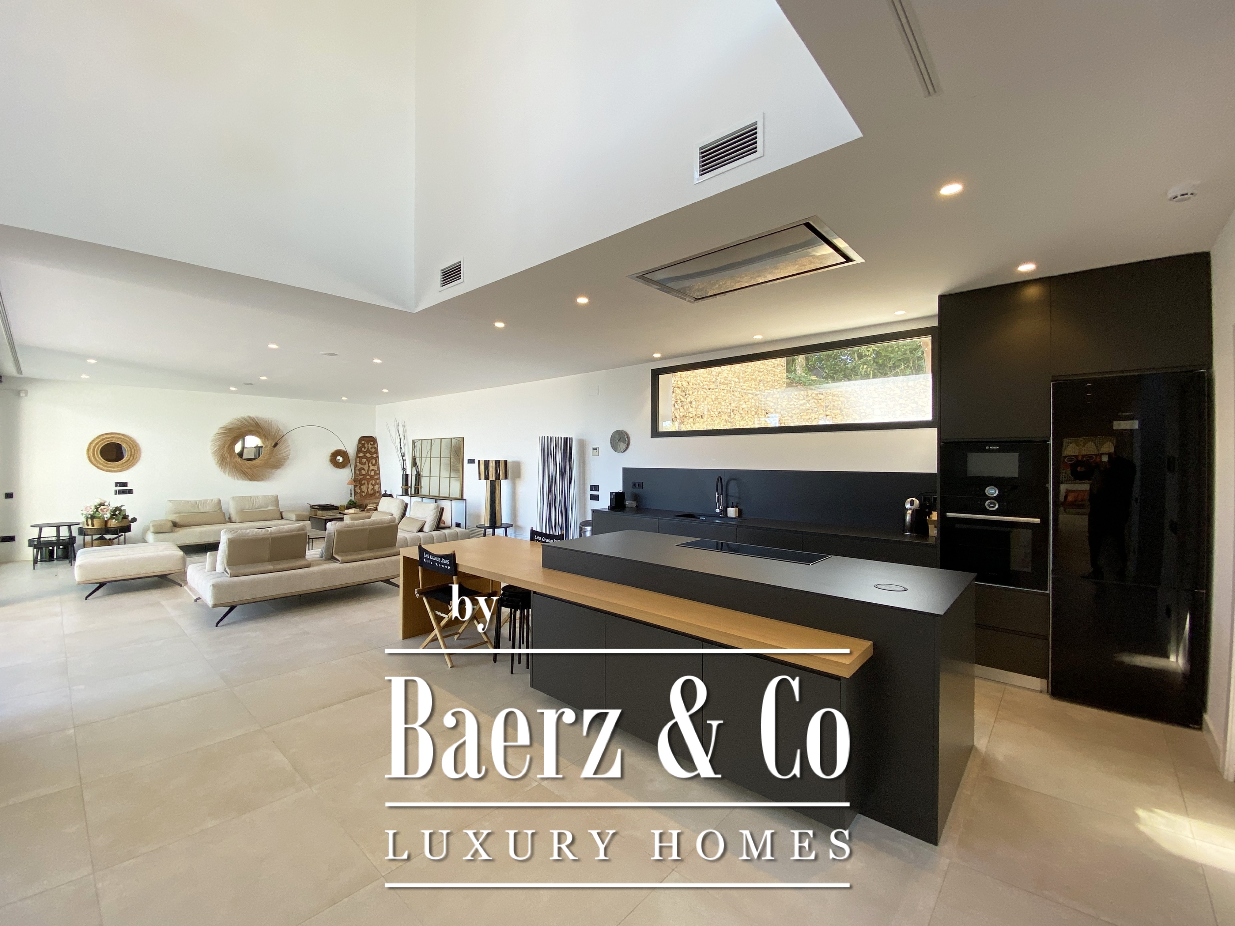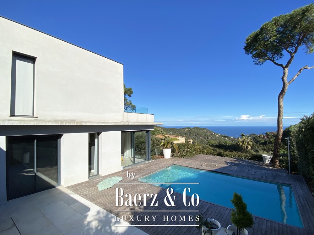 Contemporary villa Begur offers a refined coastal retreat with sweeping sea views and a commanding presence in this Mediterranean setting. The main floor welcomes with an impressive pivoting door, leading into a luminous open-plan space designed for both relaxation and sophisticated gatherings. The modern American kitchen includes a central island, breakfast bar, and integrated dining, unfolding seamlessly into the spacious living and dining area, all oriented towards the terrace and the saltwater pool. Full-length glass doors frame uninterrupted views of the sea, creating a continuous dialogue between indoors and outdoors.