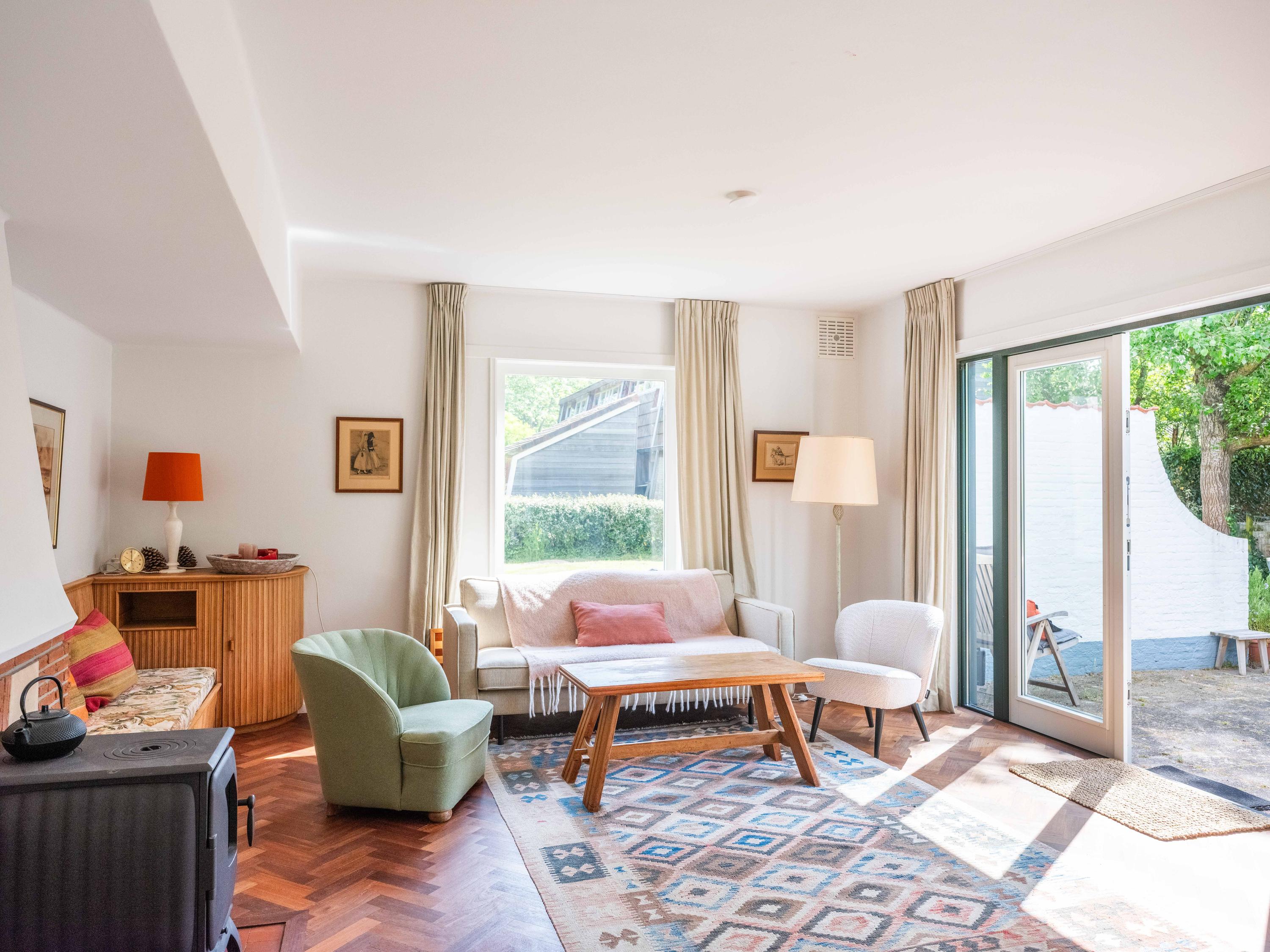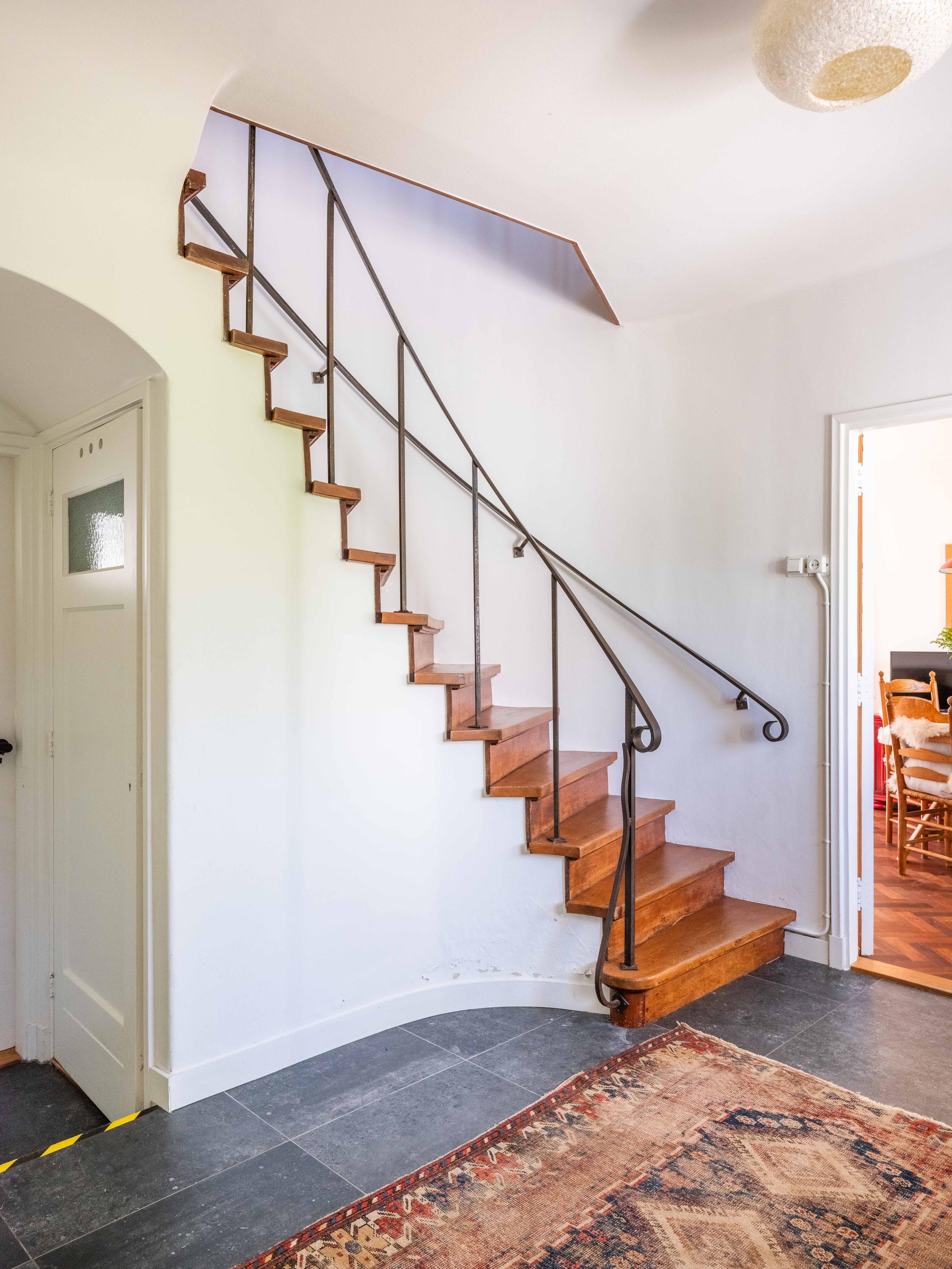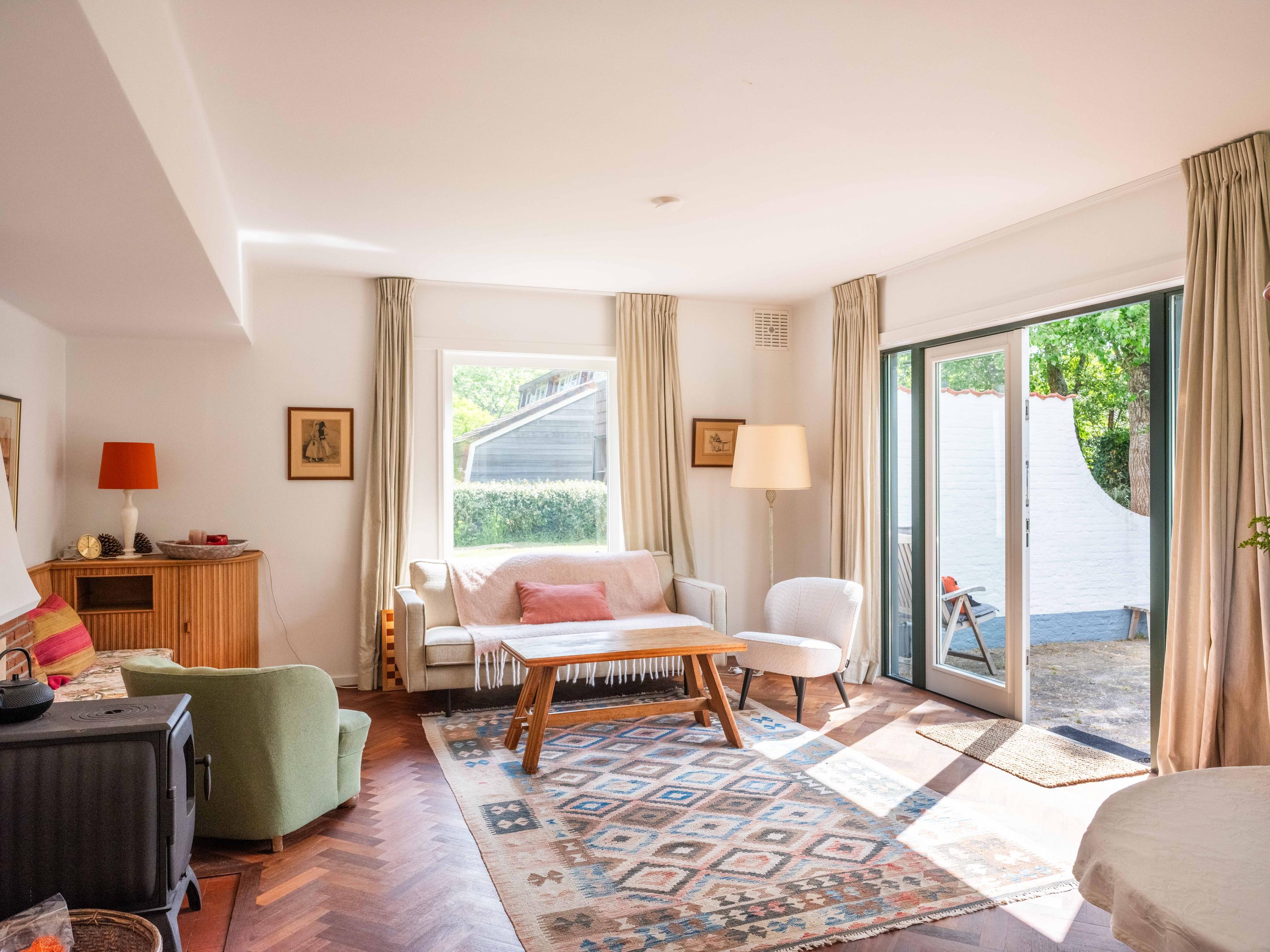 We take you inside. Upon entering, you immediately notice the beautiful entrance hall with a stylish staircase with wrought-iron banister, a modern toilet and a handy cellar cupboard. The living room is bright and cosy with an original wooden parquet floor, a wood-burning stove and French doors to the green garden. Built-in bespoke wooden cupboards add charm as well as storage space.