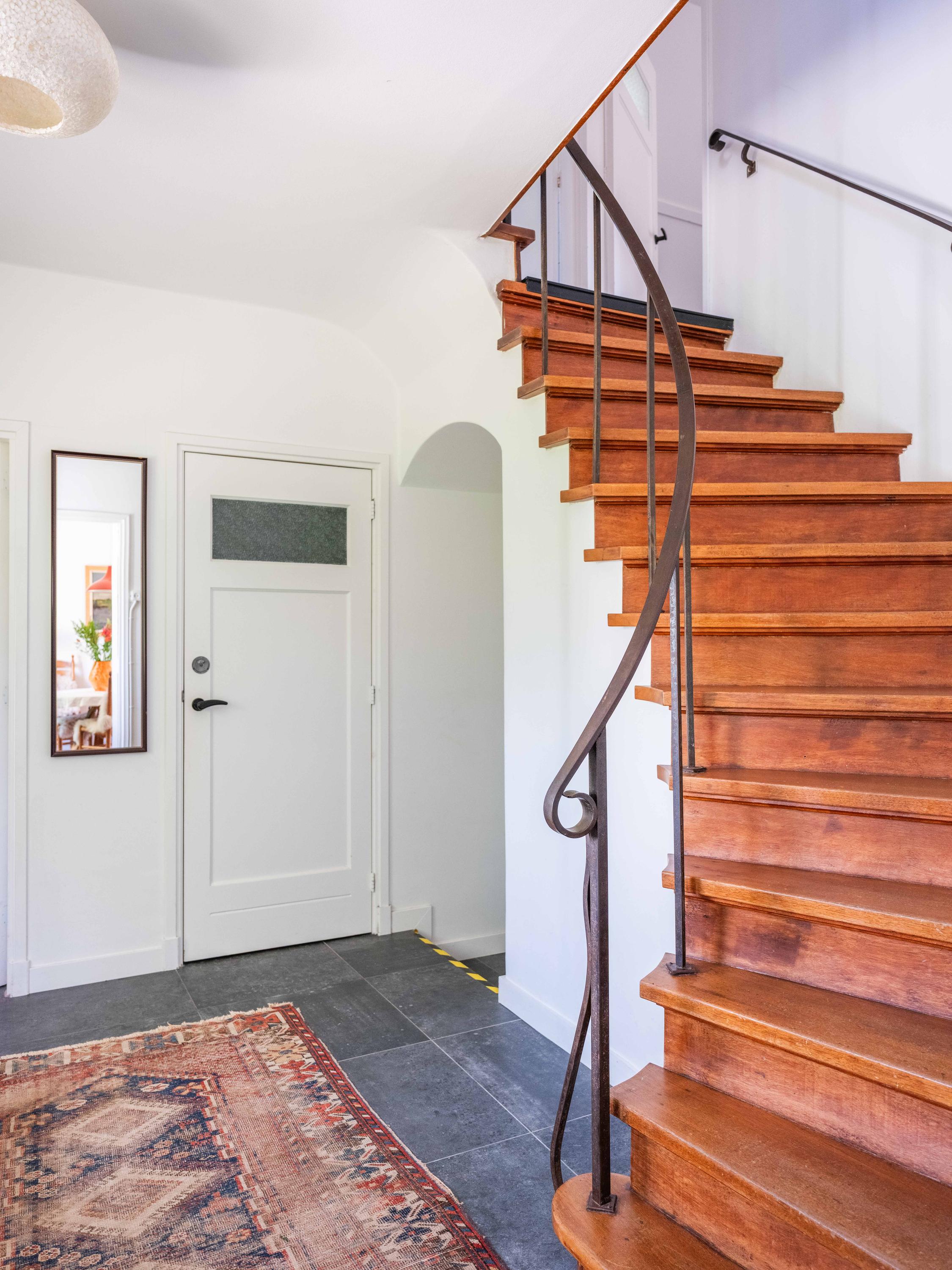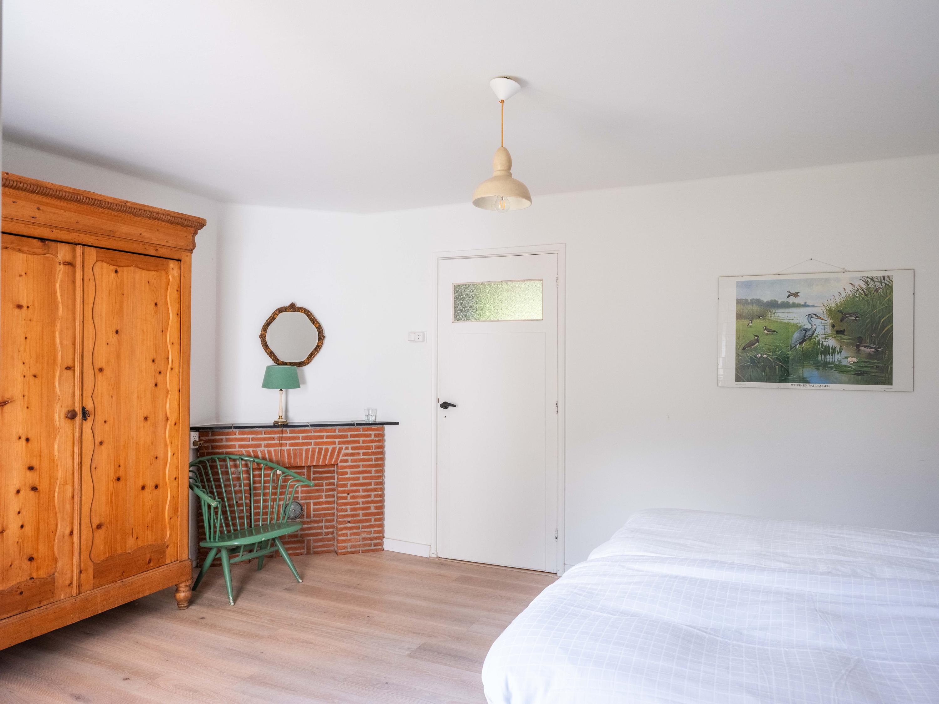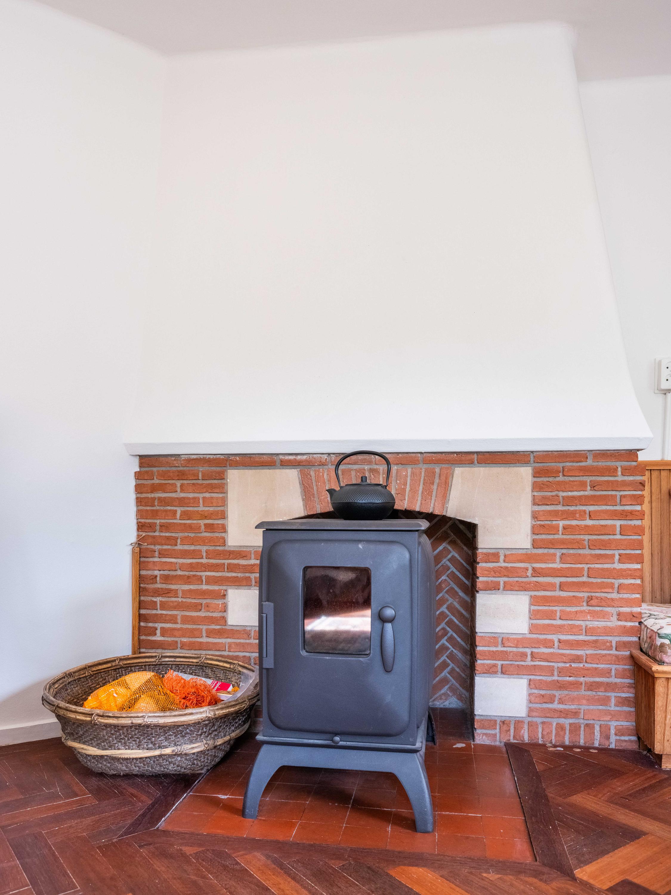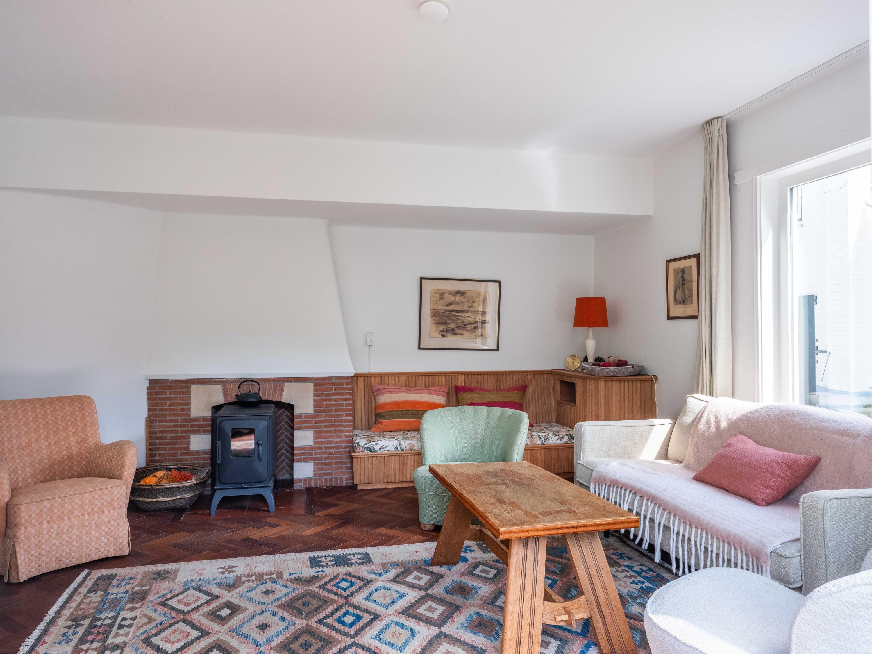 We take you inside. Upon entering, you immediately notice the beautiful entrance hall with a stylish staircase with wrought-iron banister, a modern toilet and a handy cellar cupboard. The living room is bright and cosy with an original wooden parquet floor, a wood-burning stove and French doors to the green garden. Built-in bespoke wooden cupboards add charm as well as storage space.