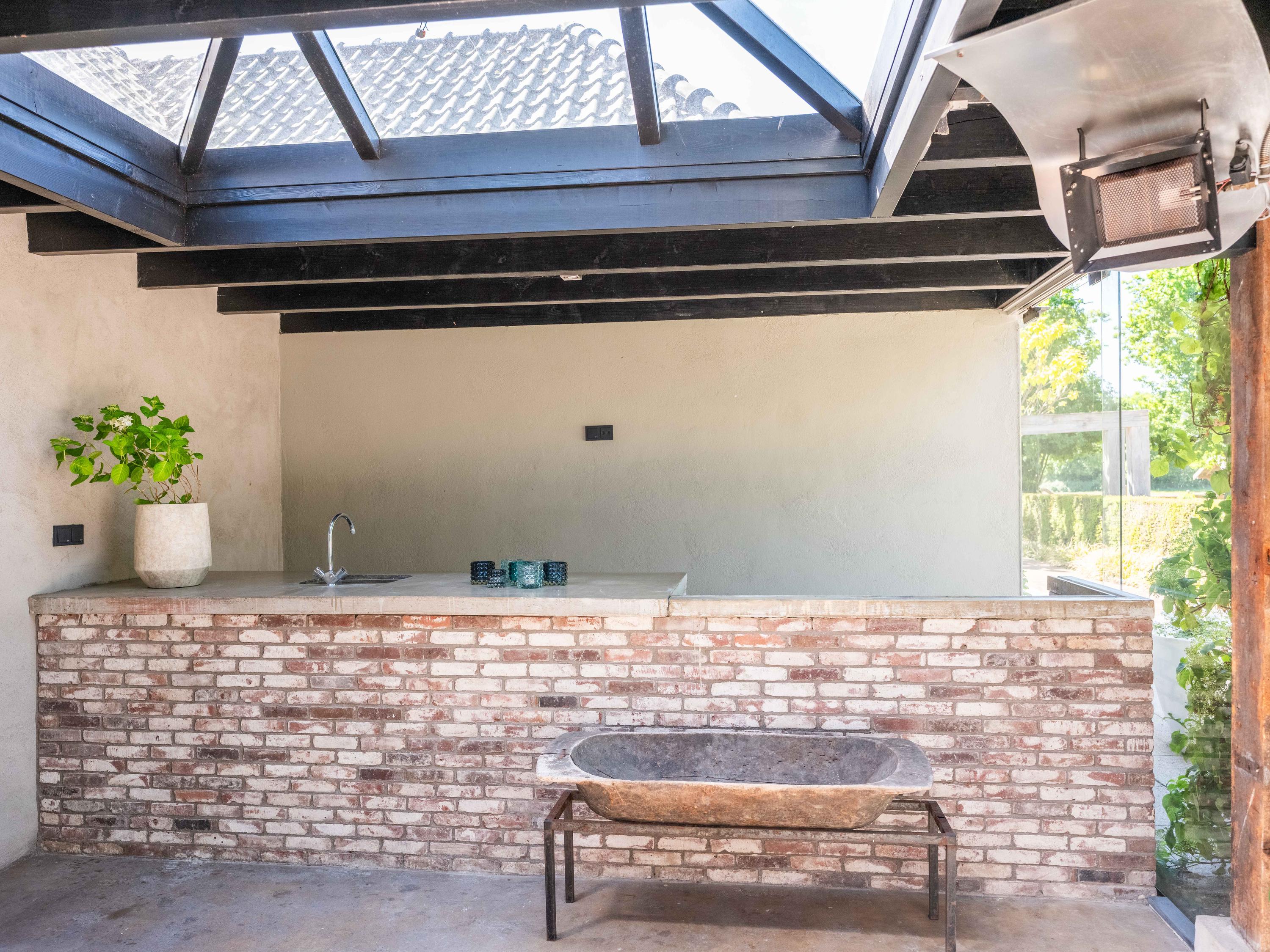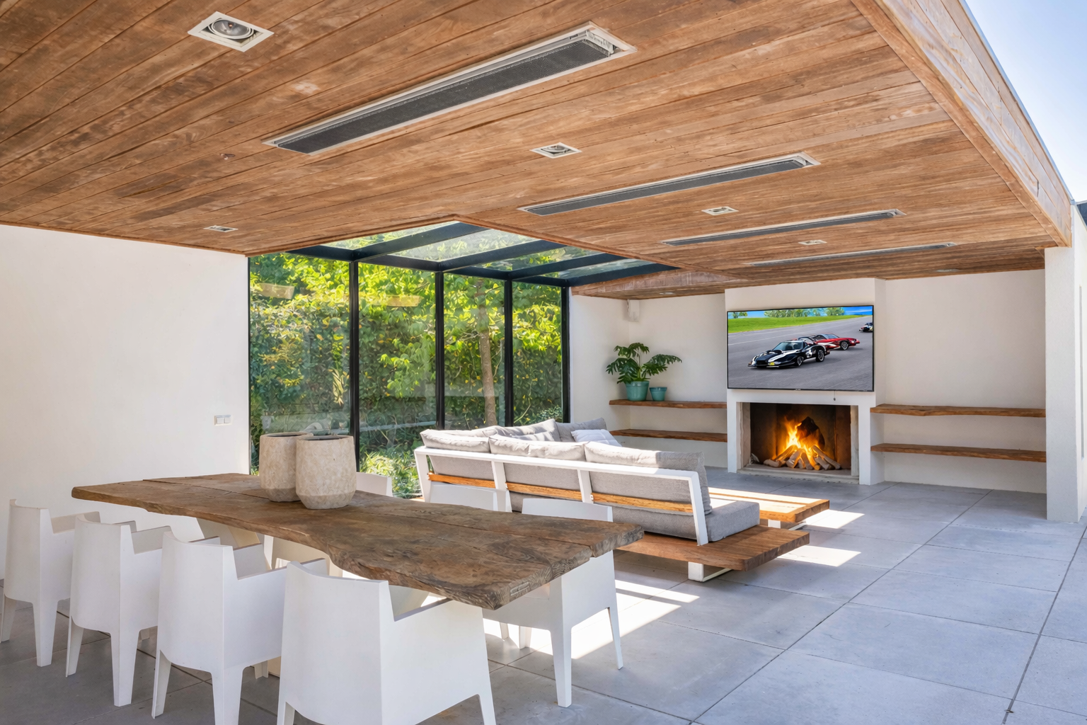 The living room where the ceiling, which reaches to the ridge, immediately catches the eye. The contrast of colours in the house enhance its sturdy character. This very spacious living room has a fireplace and French doors to the garden. The modern open kitchen is equipped with various built-in appliances, including a Boretti 8-burner cooker, an American fridge with coffee maker and plate warmer, oven, built-in fridge and dishwasher.