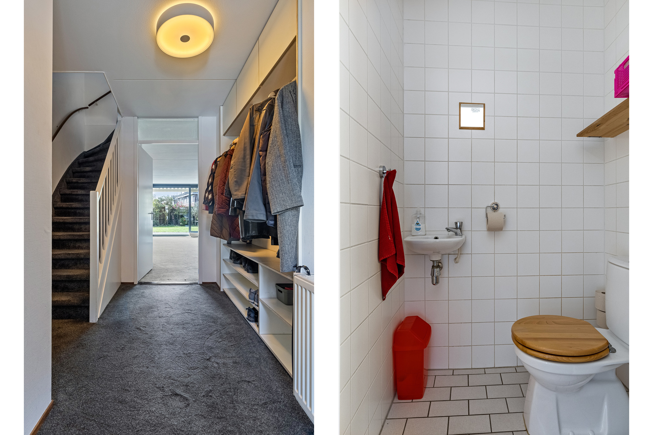 Entrance/hallway with stairs to the first floor, meter cupboard, toilet, access to the garage, and the living room.