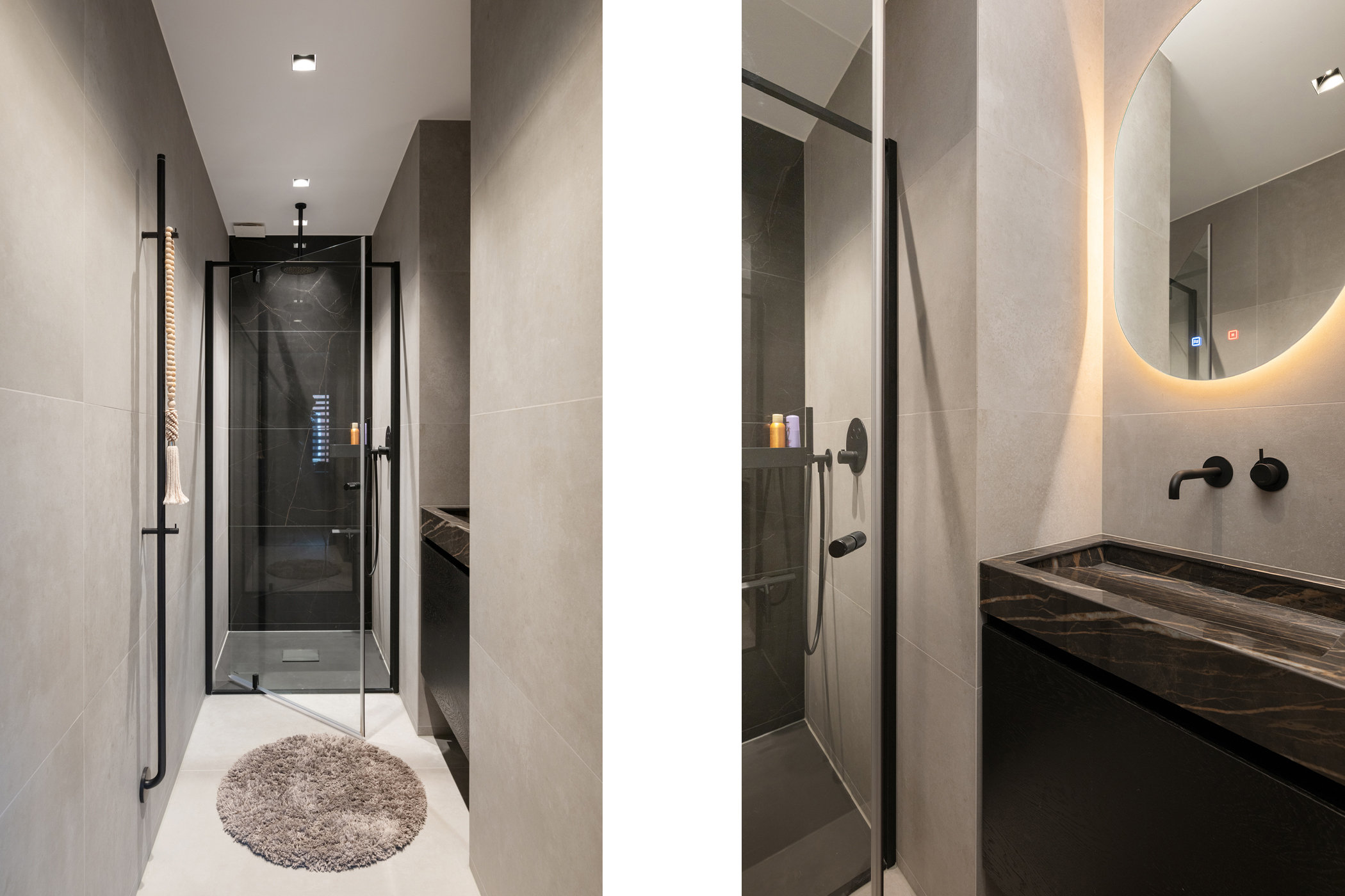 The second modern bathroom includes a shower, washbasin, mirror with lighting and heating, towel warmers and underfloor heating.