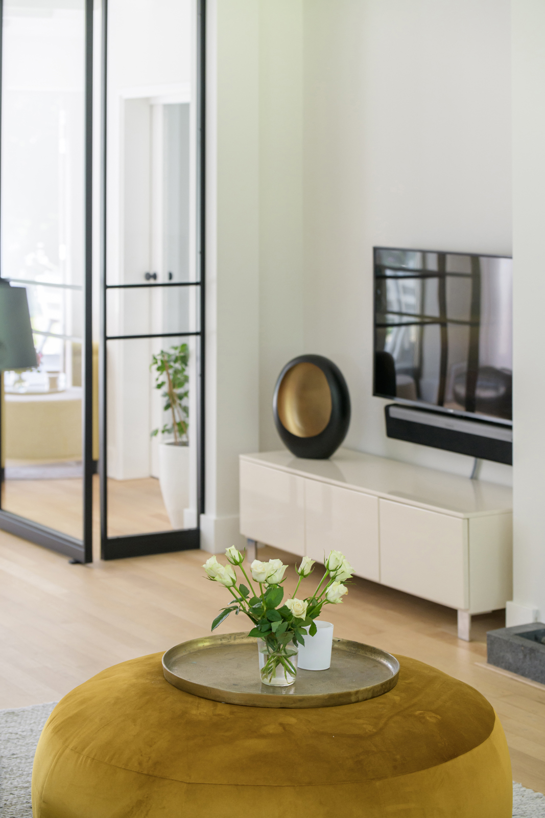 Living room with beautiful natural light and a view of the front garden. The living room is equipped with a fireplace, built-in cupboards, and a (solid) wooden floor.