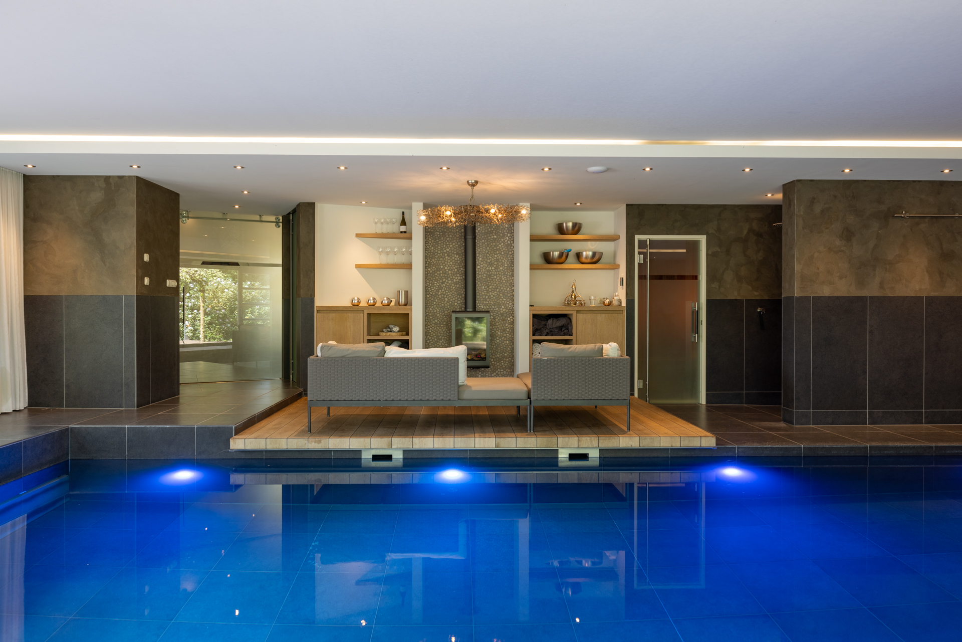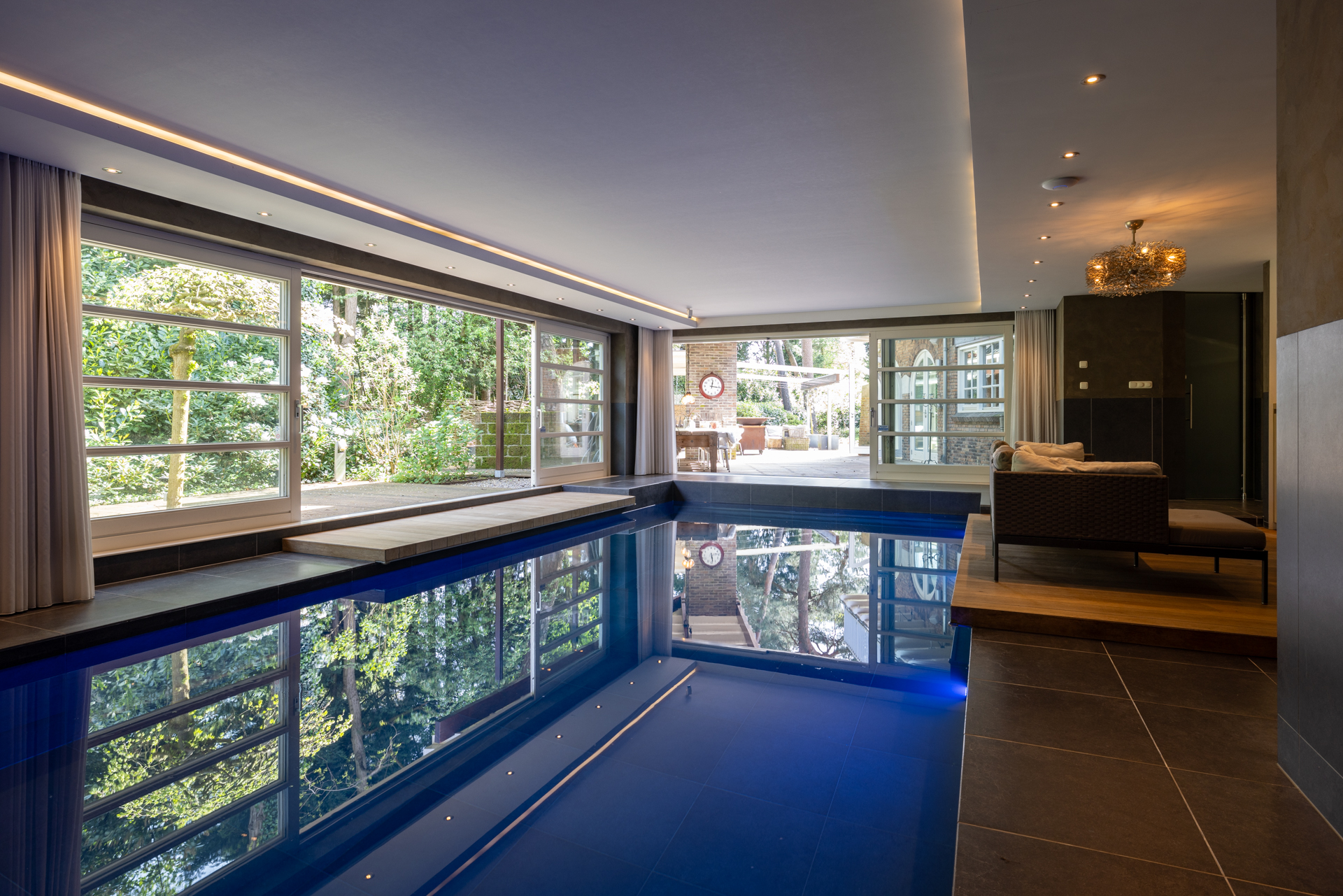 This space is equipped with two large sliding doors that can be opened, giving you the feeling of an outdoor swimming pool. This also creates a beautiful integration with the terrace, the great outdoor space and the garden.