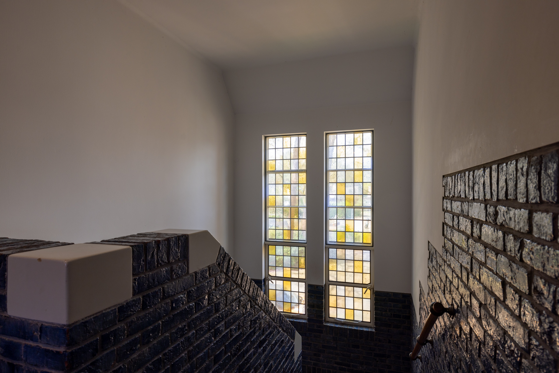 Spacious landing with beautiful stained glass windows, original wall paneling with sleek stucco above, closed