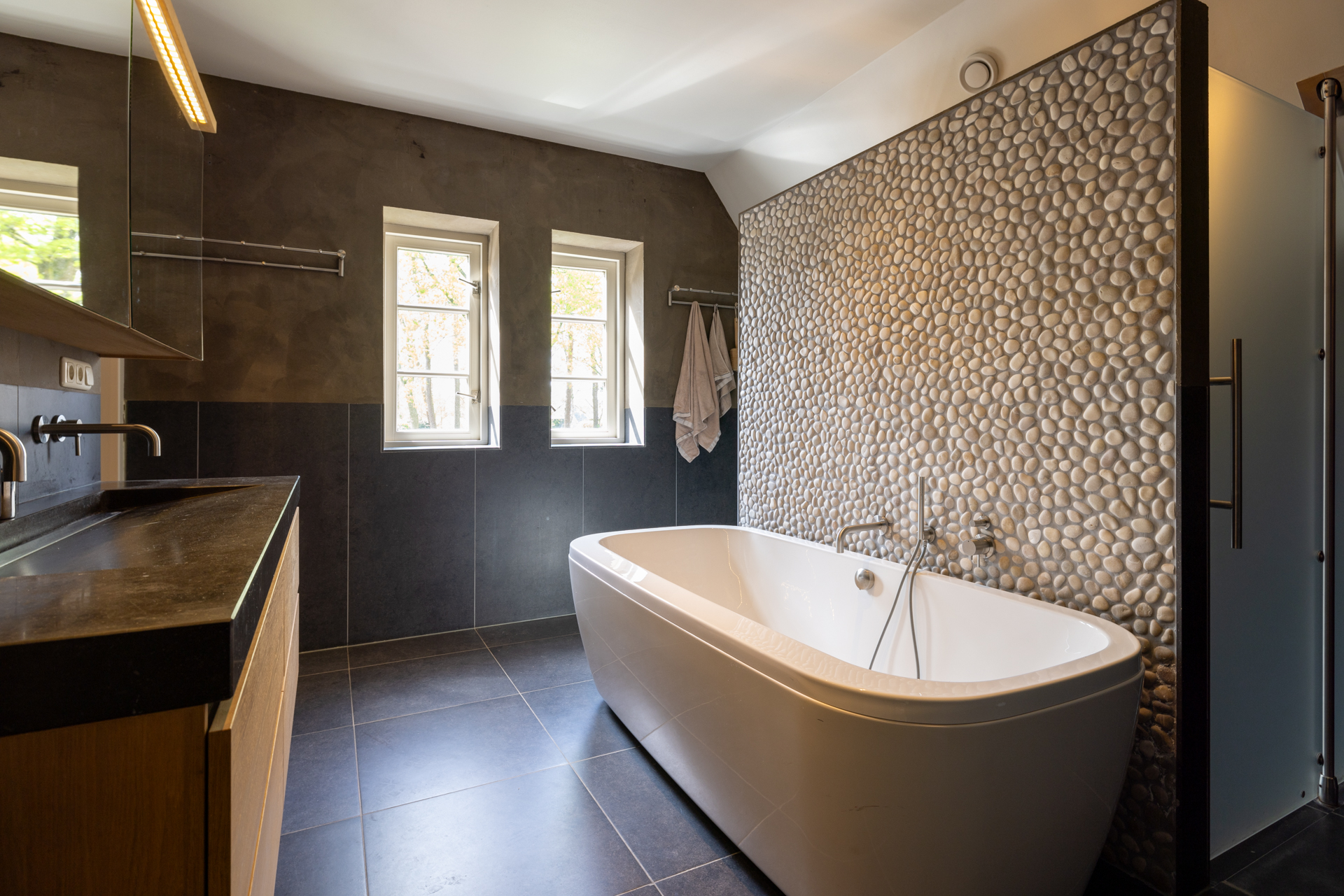 Spacious and luxurious bathroom (approx. 3.50 x 3.85/3.95 m) with a double sink, double walk-in shower, bath, toilet, design radiator, electric underfloor heating and mechanical ventilation. All bathroom furniture is custom made by Antonissen interior construction.
