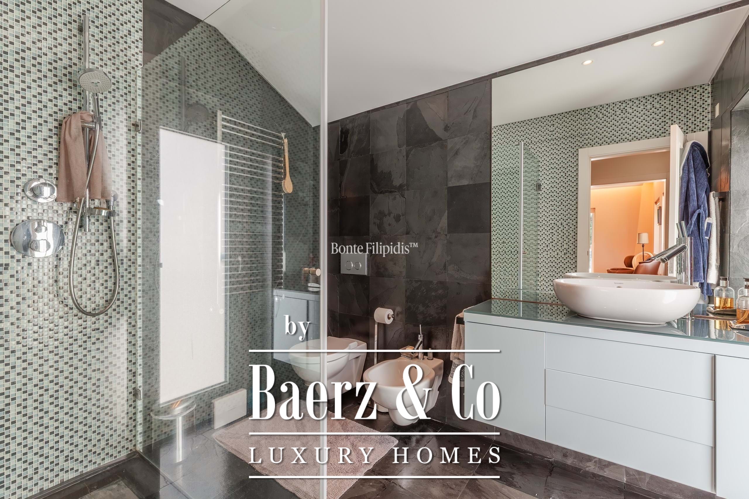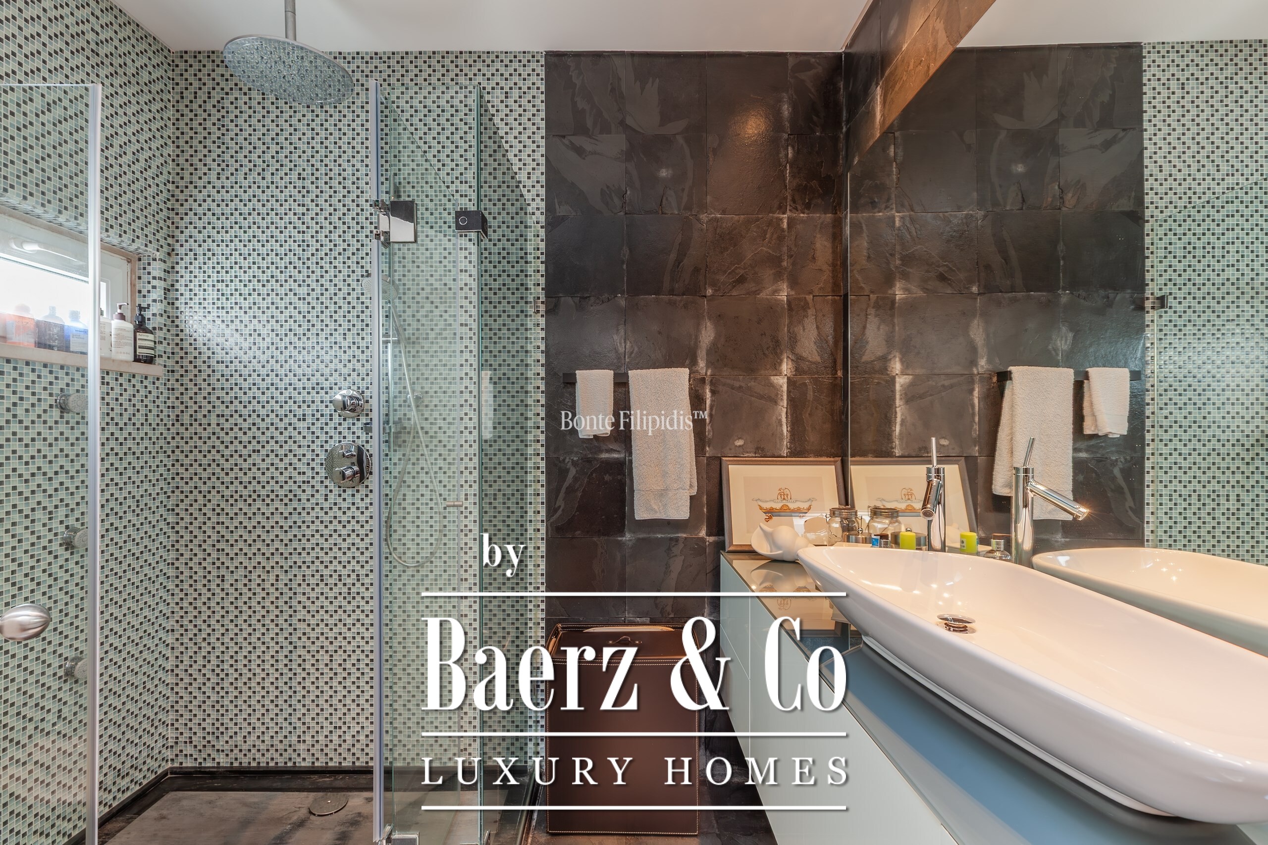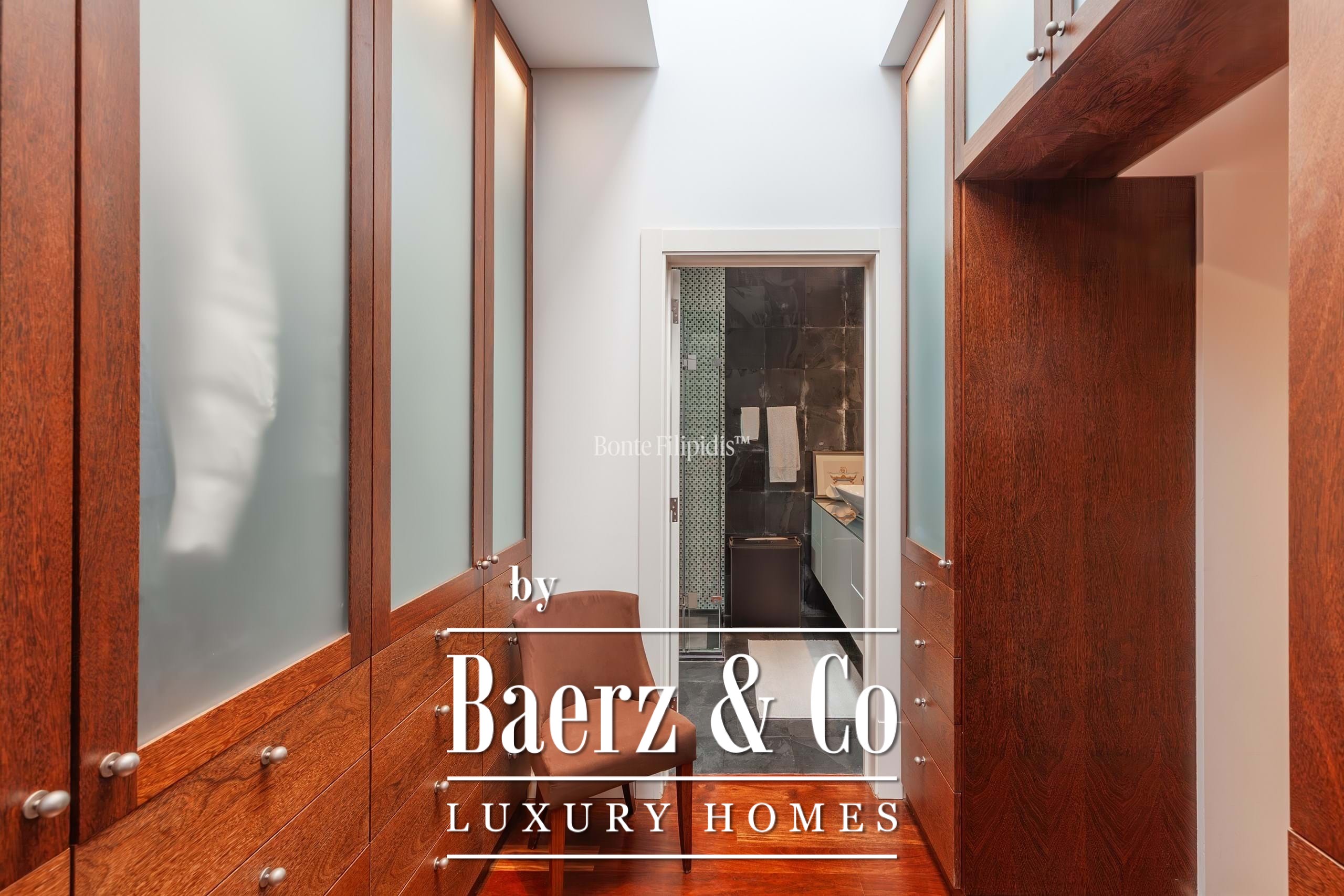 The 448 m² of interior space is distributed across four levels, each accessible by elevator. Five bedrooms, including a master suite, and six bathrooms offer ample accommodation, while luminous social spaces open directly to terraces beneath a bioclimatic pergola that adapts to light and airflow. The kitchen, fitted with advanced technology, quietly supports daily rituals and entertaining alike.