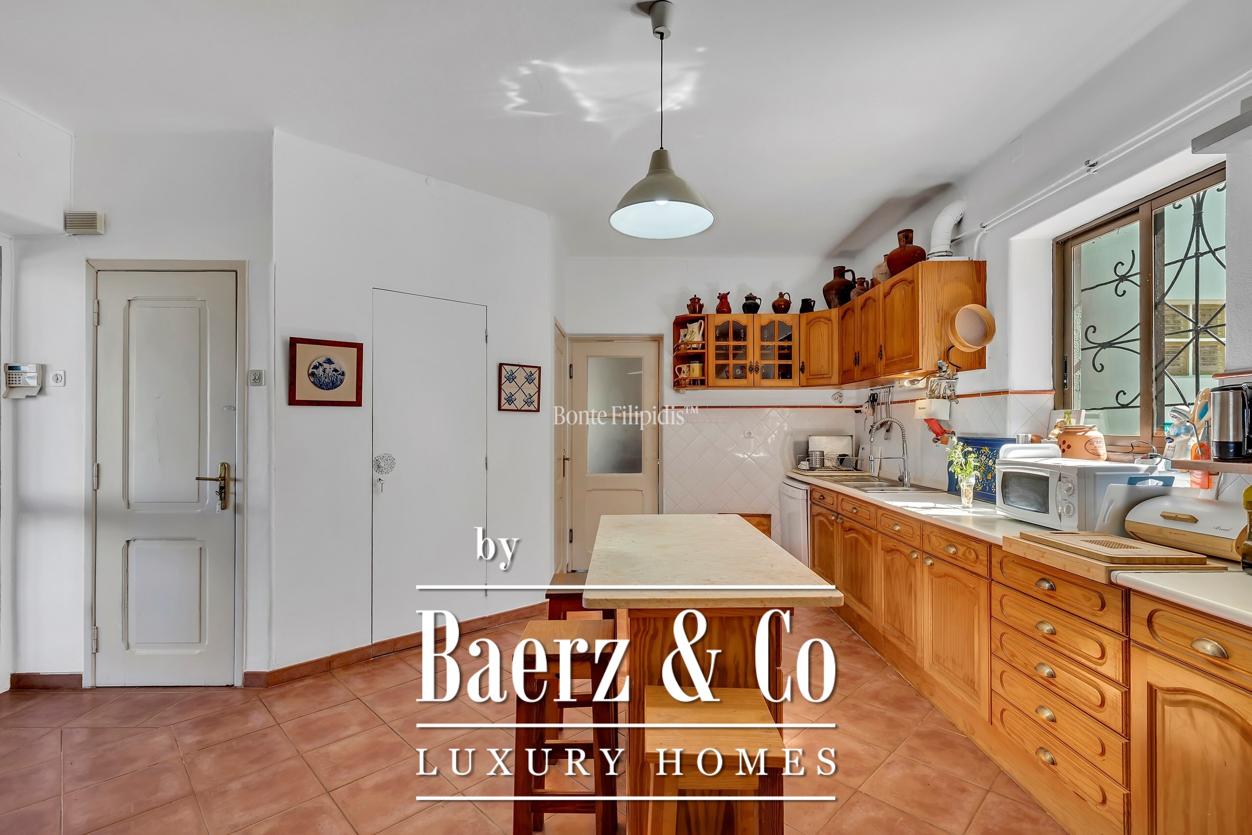 The interior reveals a welcoming and functional layout, featuring two spacious living rooms one with a fireplace and a balcony with unobstructed views a large kitchen, three bedrooms (one en suite), a game room, two bathrooms with windows, a wine cellar, and a generous entrance hall. Additional highlights include a pantry, built-in wardrobes, and traditional finishes such as terracotta floors and double-glazed windows, which enhance the comfort and authenticity of the home.