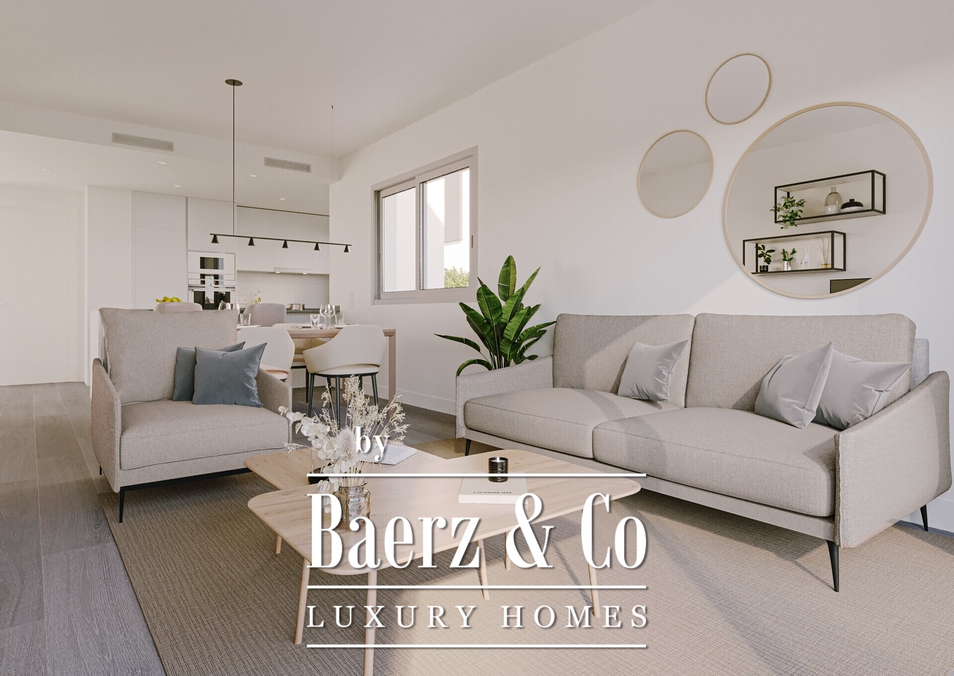The living arrangement comprises three luminous bedrooms and three refined bathrooms, with an open kitchen seamlessly connected to the living and dining area. A dedicated laundry and utility space enhances everyday convenience. Two private terraces, one on each floor, invite quiet moments under the Mediterranean sky.