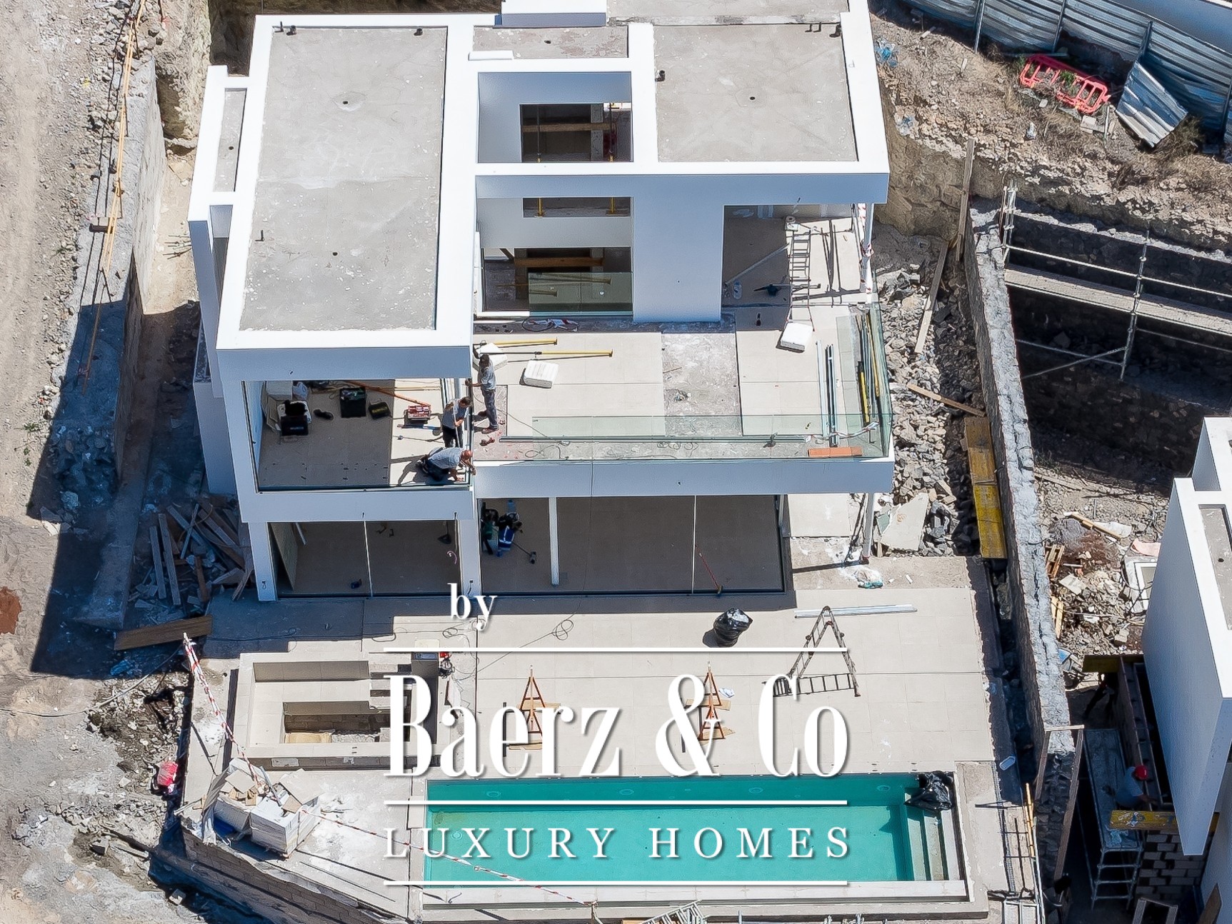 The upper floor introduces a serene living room, an equipped kitchen with a central island, two comfortable bedrooms including the master suite with en-suite bath and dressing room, and an additional guest toilet. The second suite offers a private terrace and built-in wardrobe, ensuring comfort and privacy. On the lower level, a further lounge, two bedrooms, and two full bathrooms enhance the villa’s flexibility, supported by a dedicated laundry space.