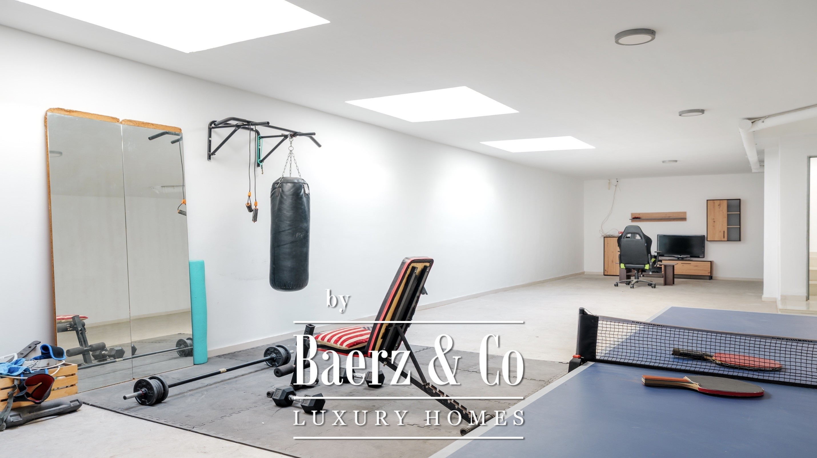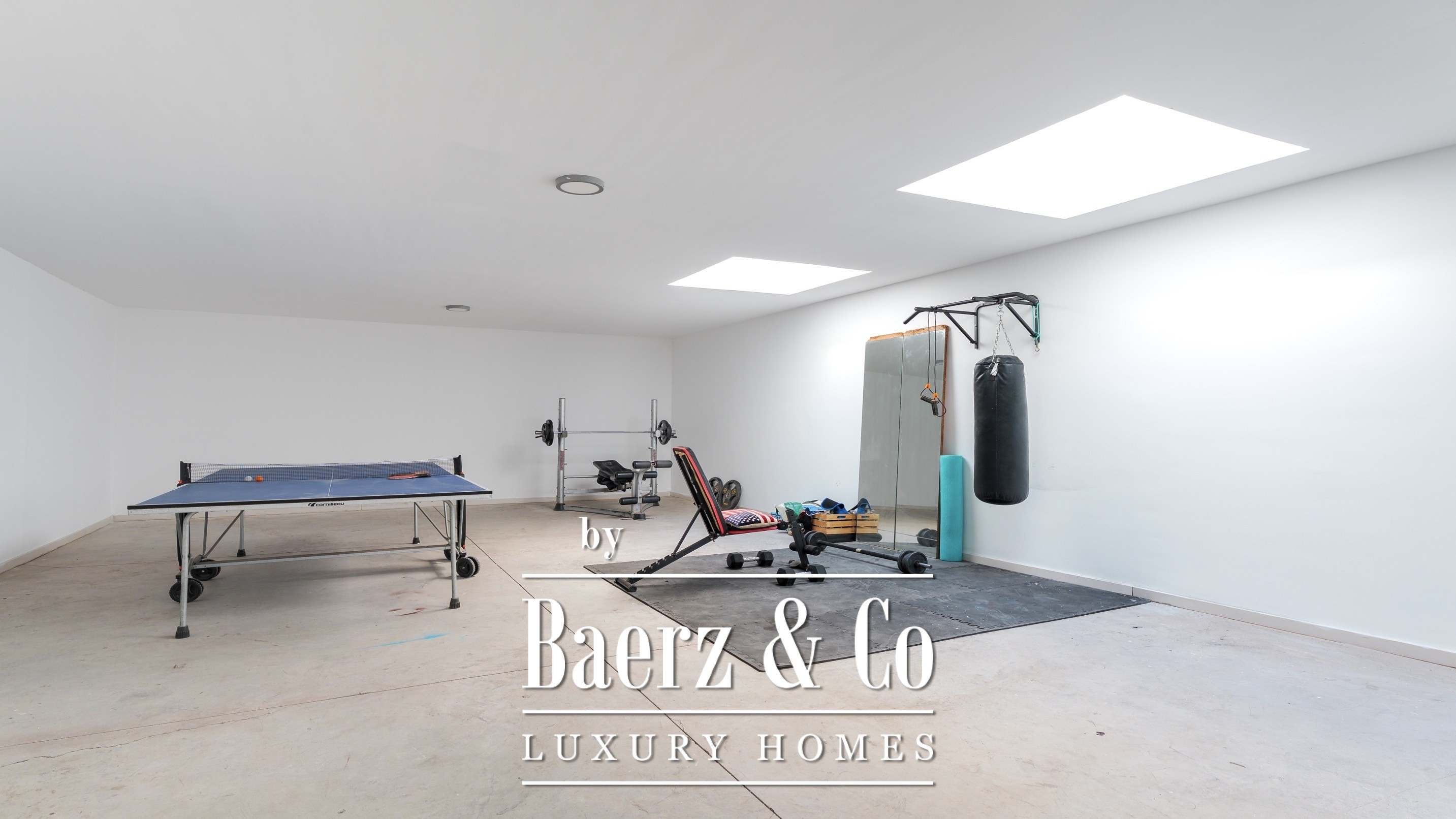 A closed garage for several cars, next to a spacious multifunctional lounge, perfect as a gym, games room or private cinema. It also has a storage room and laundry room.