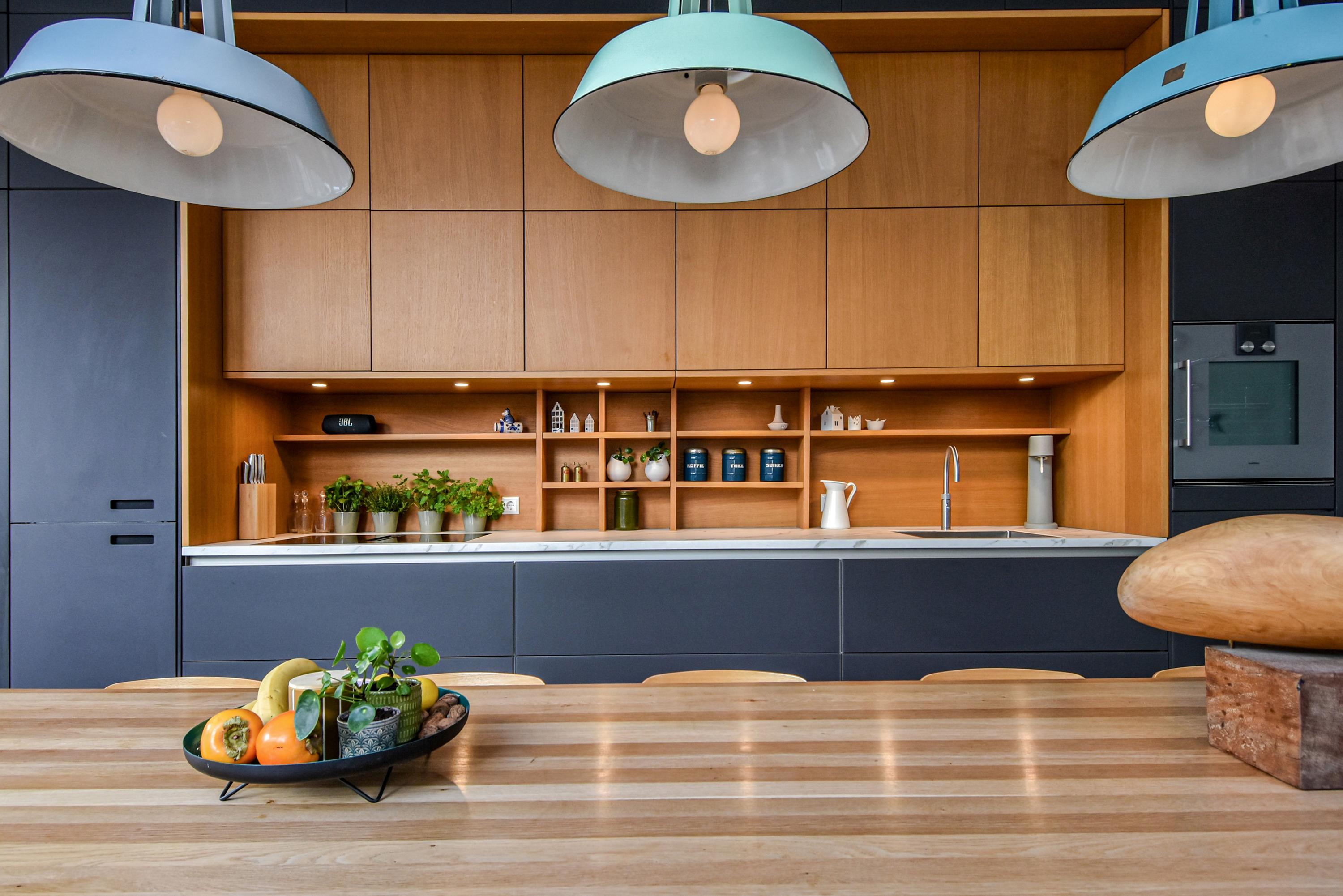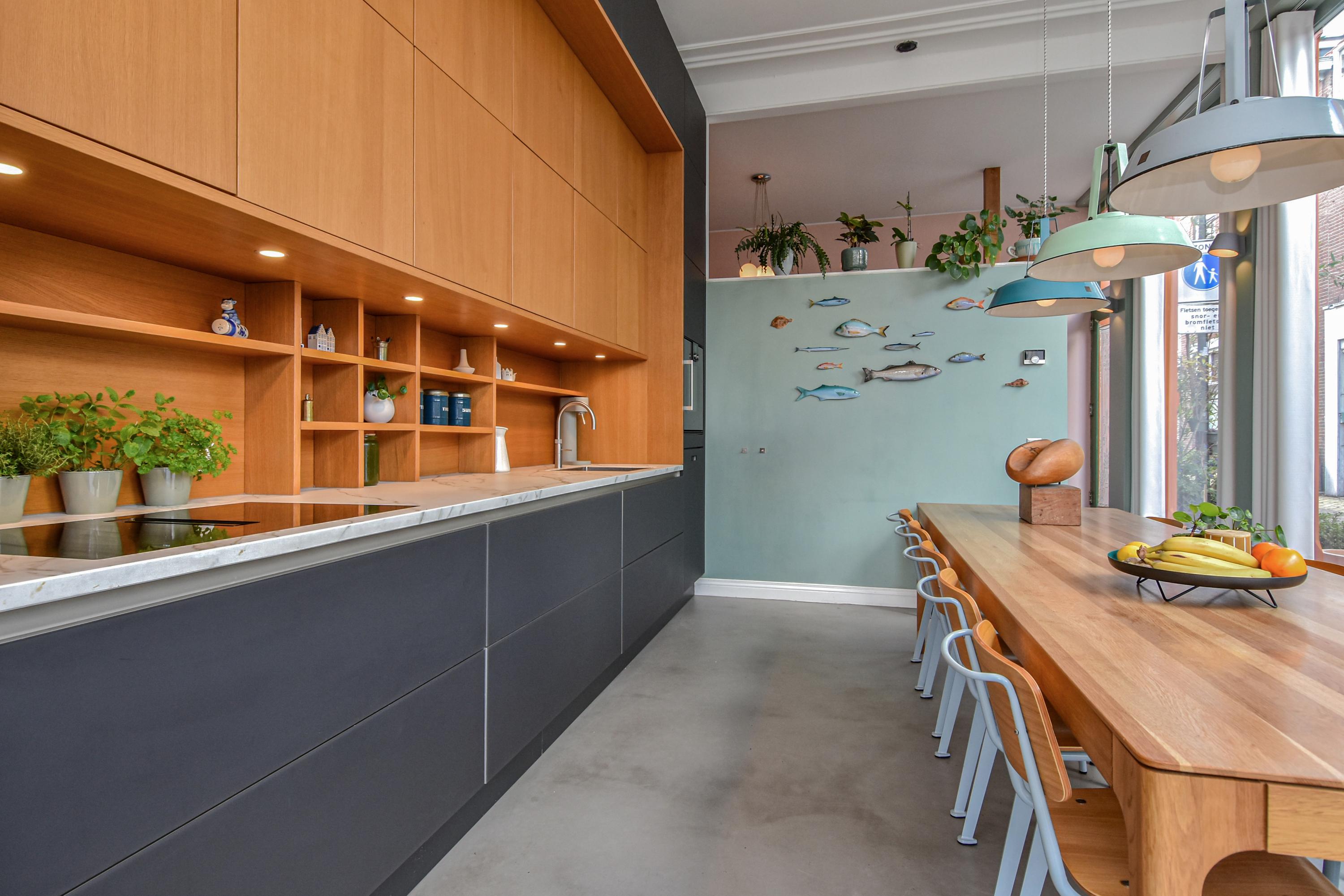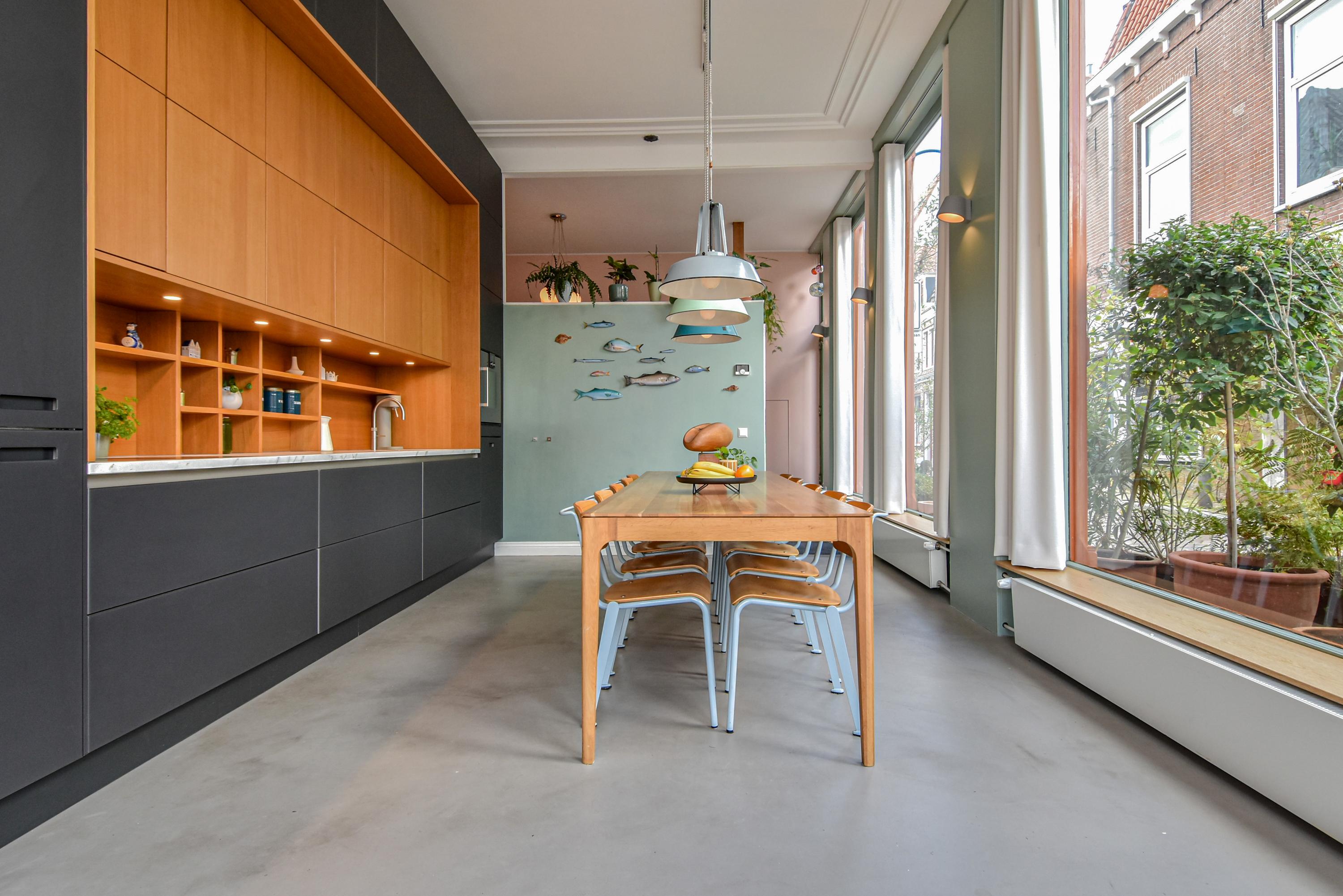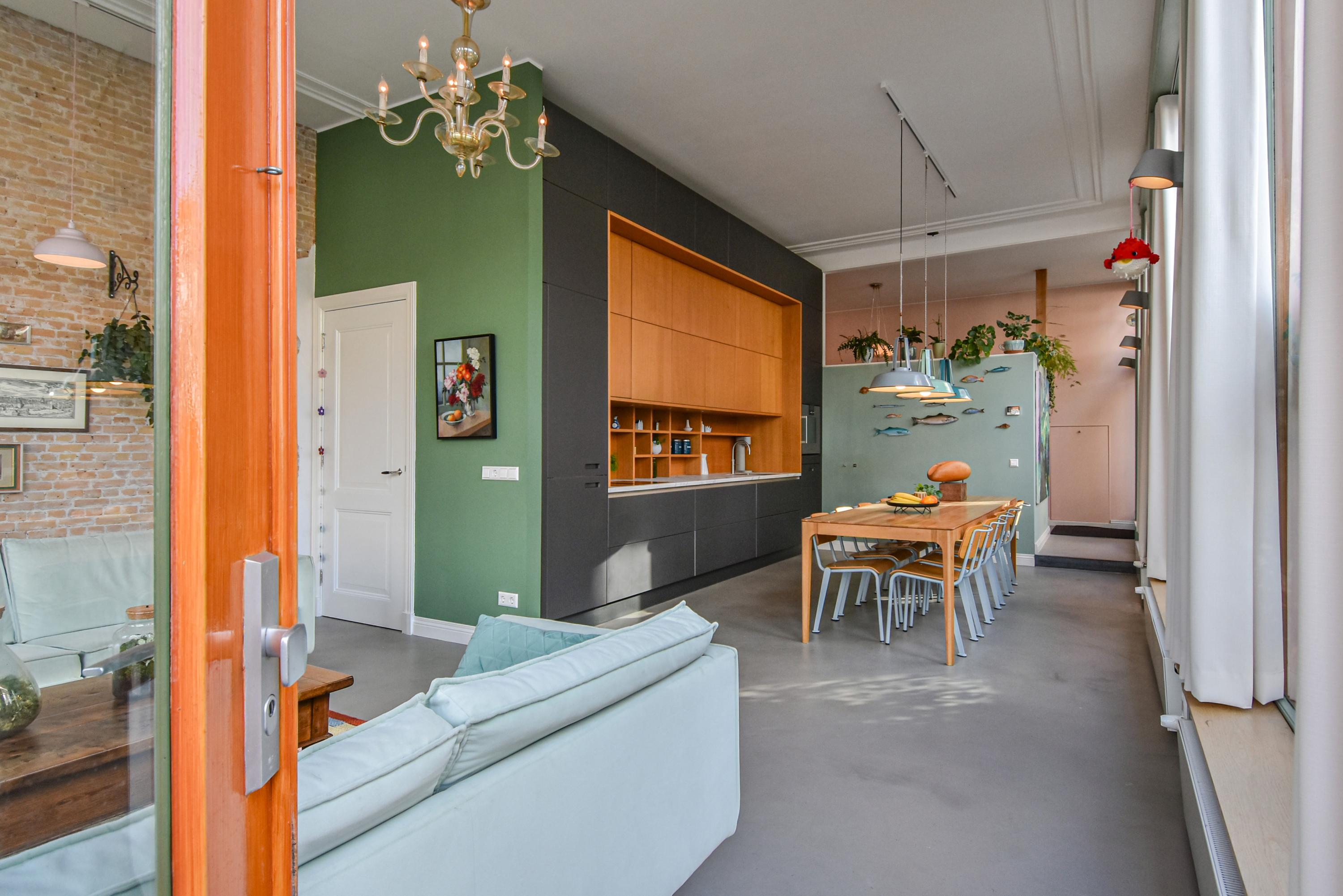 Upon entering, you are immediately impressed by the beautiful living kitchen with its strikingly high glass façades and an impressive ceiling height of no less than 3.55 meters. The original stucco decorative moulding has been preserved. The space is filled with light and offers ample room for a large dining table. The stylishly finished kitchen forms the heart of the home—a wonderful space equipped with luxury built-in appliances, perfect for cooking and entertaining guests.