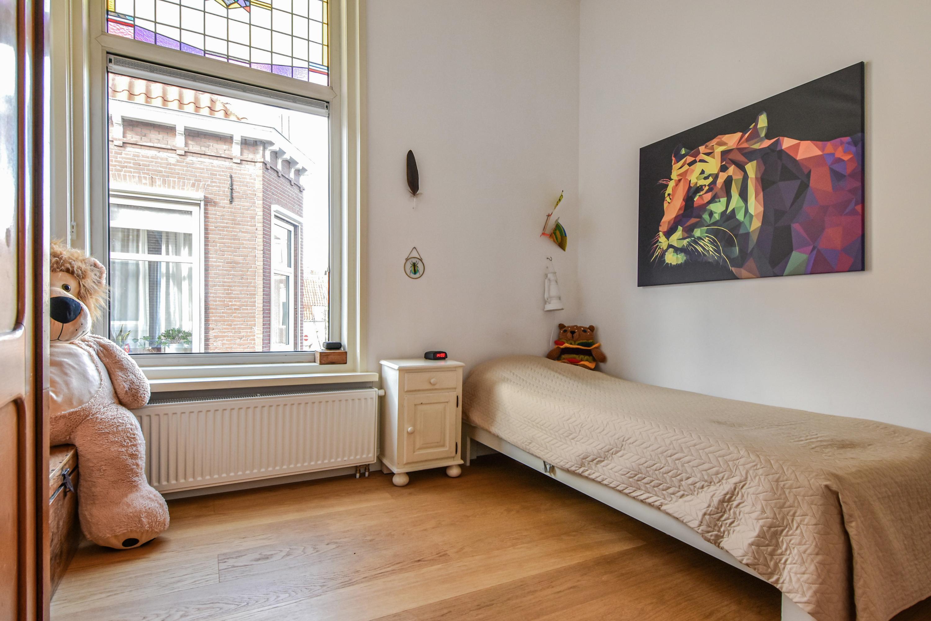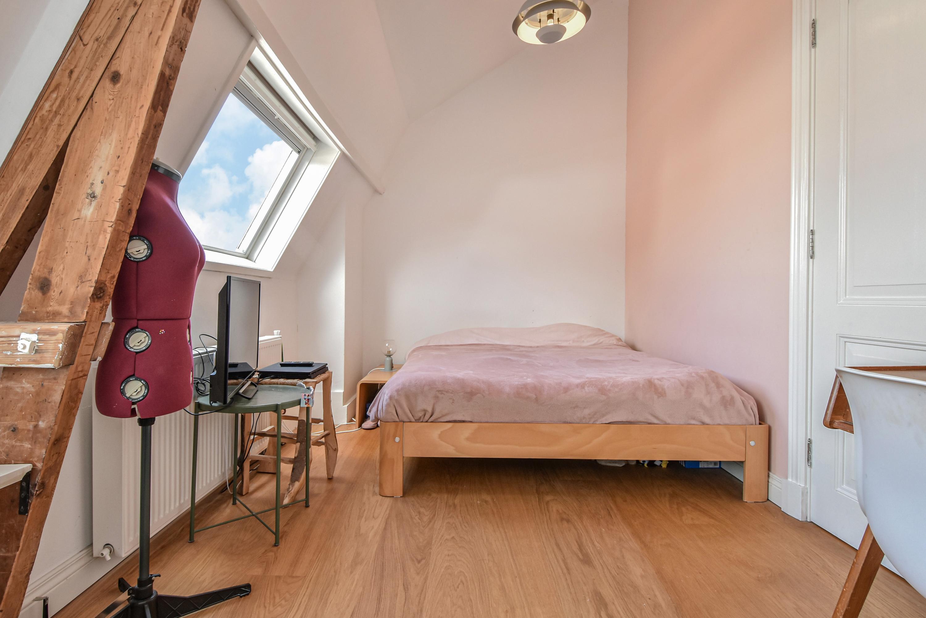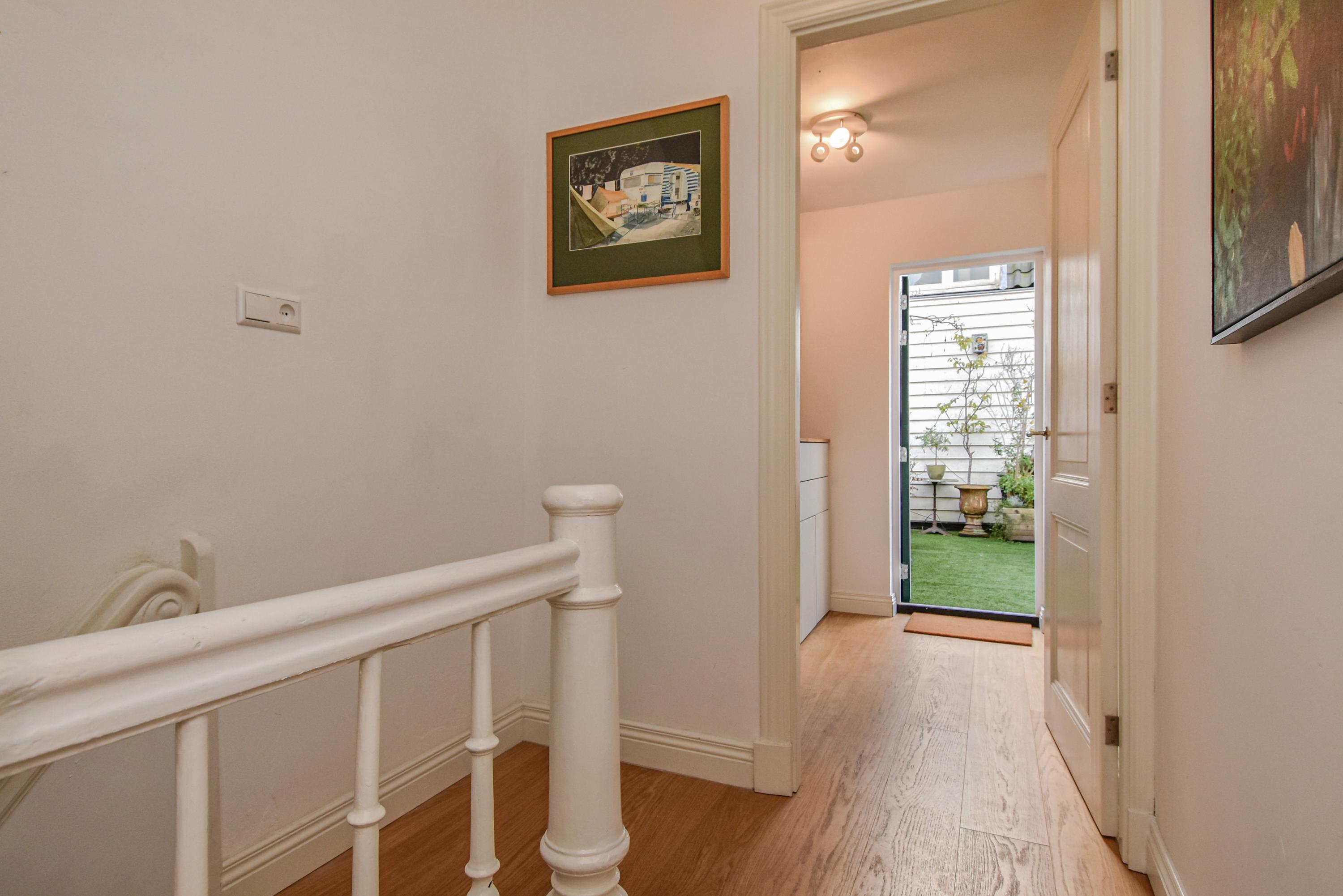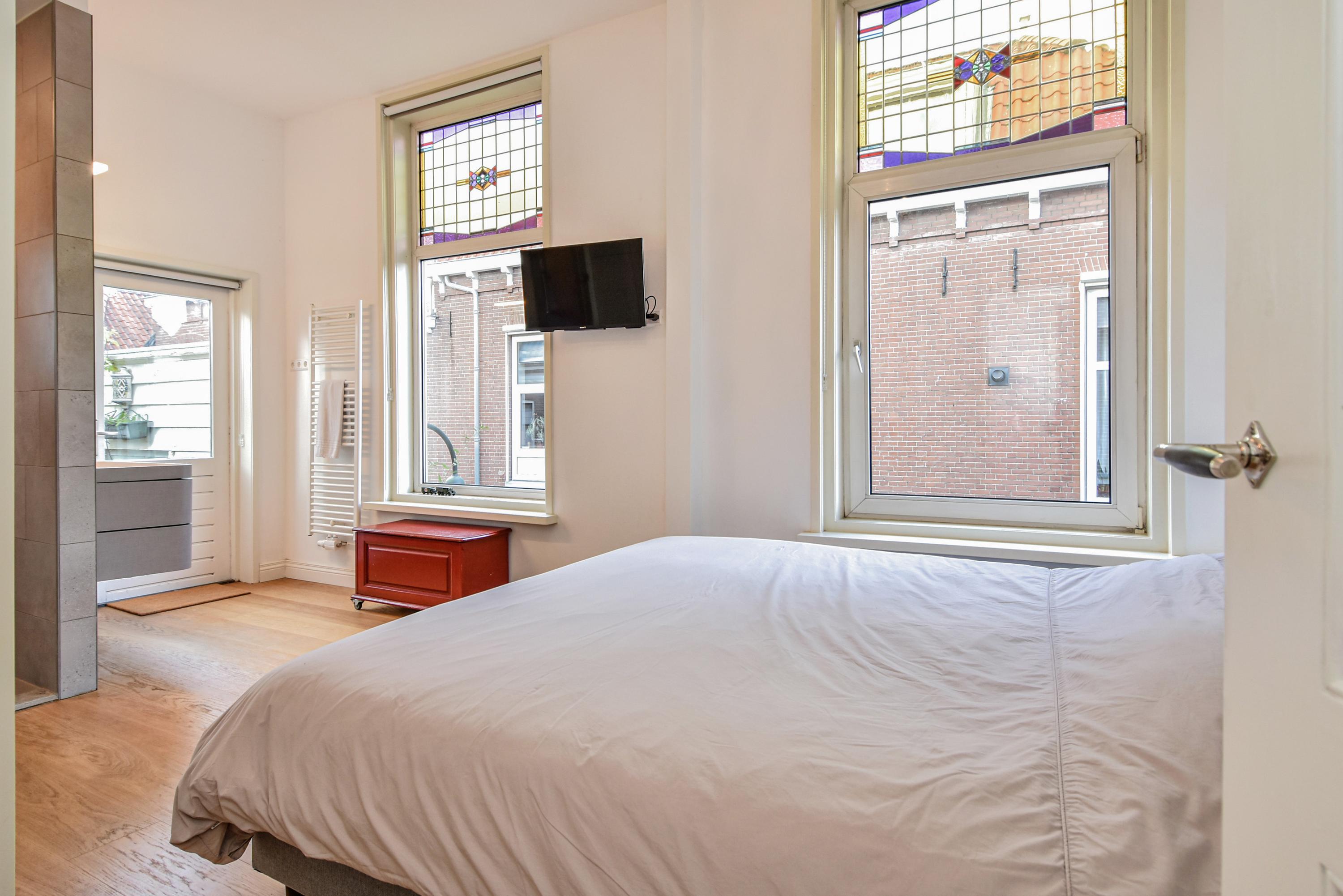 The landing provides access to a separate toilet with washbasin and additional storage space. The spacious and bright front bedroom features a high ceiling and a beautiful view over the canal. There are two additional large bedrooms, one with a walk-in shower and washbasin. All bedrooms are adorned with stained-glass windows. A separate laundry room gives access to the roof garden—a delightful, sheltered spot with optimal sunlight. From early morning until late evening, you can enjoy the sun, privacy, and a charming green setting. The terrace also includes a large wooden storage shed.