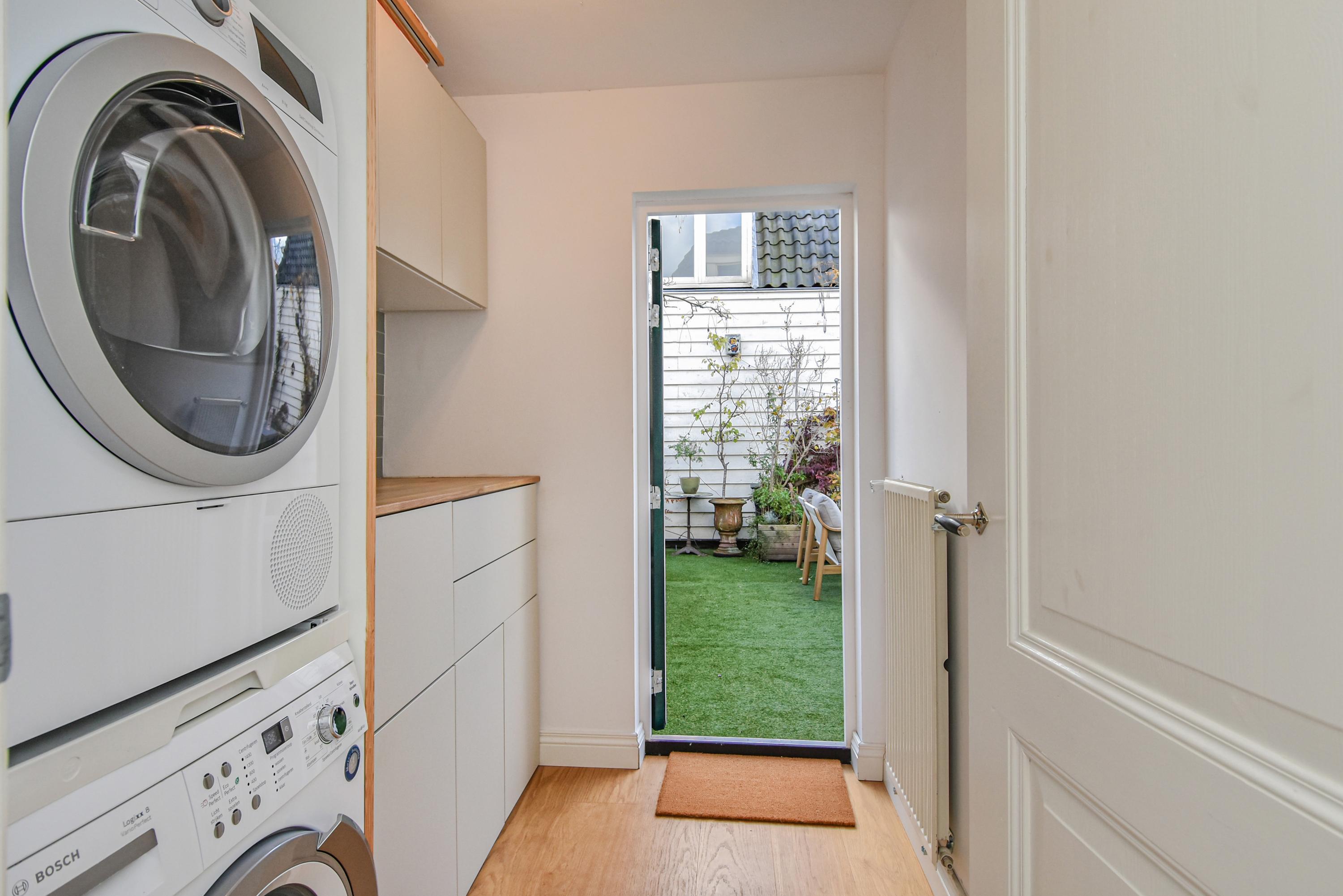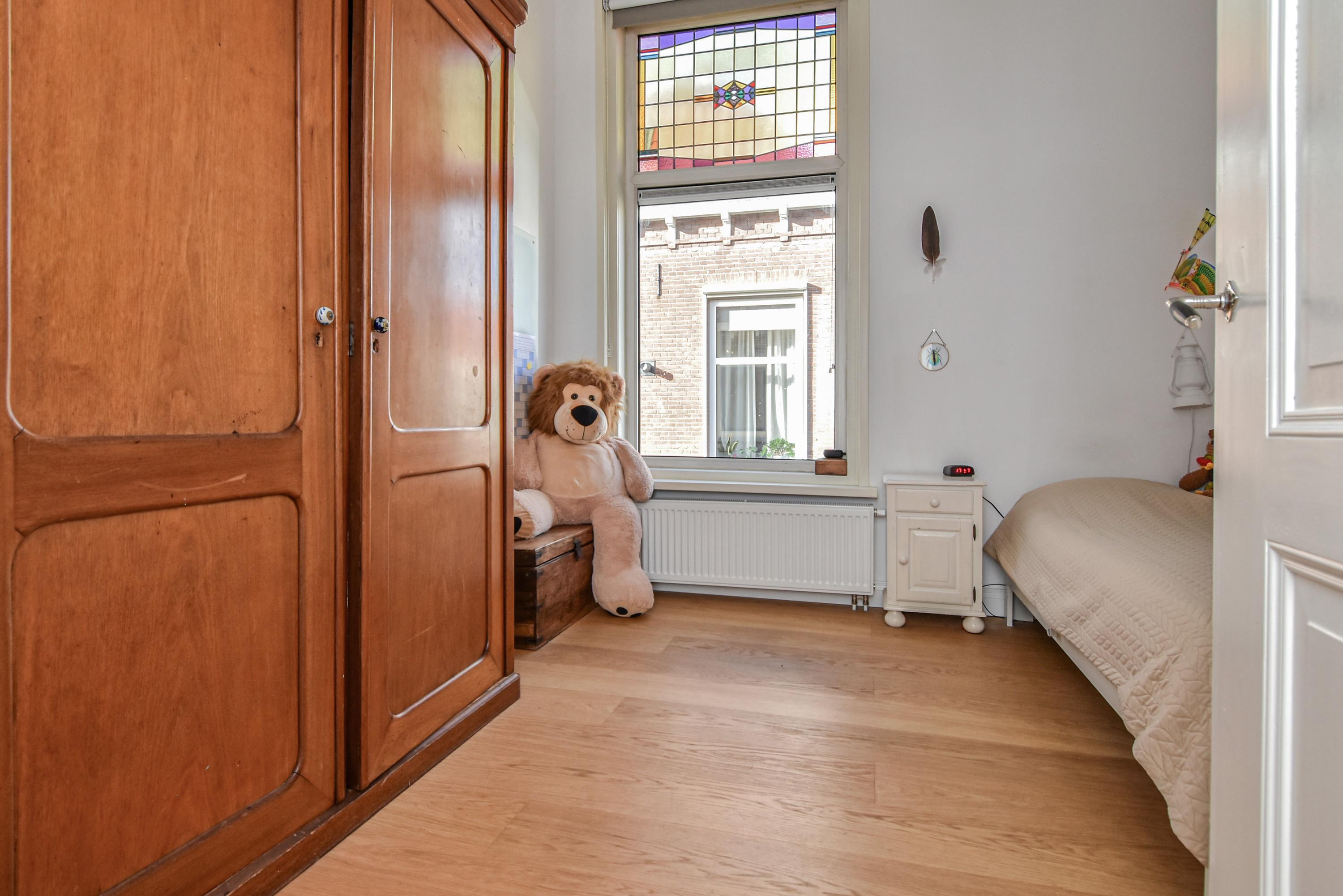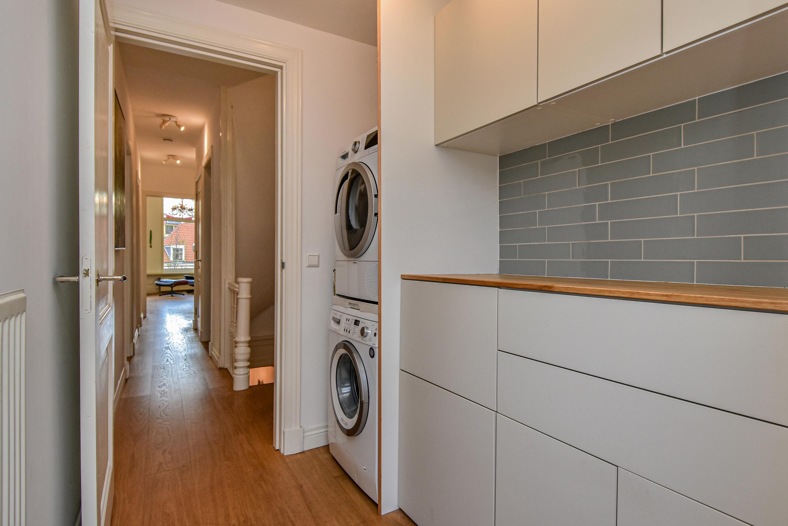 The landing provides access to a separate toilet with washbasin and additional storage space. The spacious and bright front bedroom features a high ceiling and a beautiful view over the canal. There are two additional large bedrooms, one with a walk-in shower and washbasin. All bedrooms are adorned with stained-glass windows. A separate laundry room gives access to the roof garden—a delightful, sheltered spot with optimal sunlight. From early morning until late evening, you can enjoy the sun, privacy, and a charming green setting. The terrace also includes a large wooden storage shed.