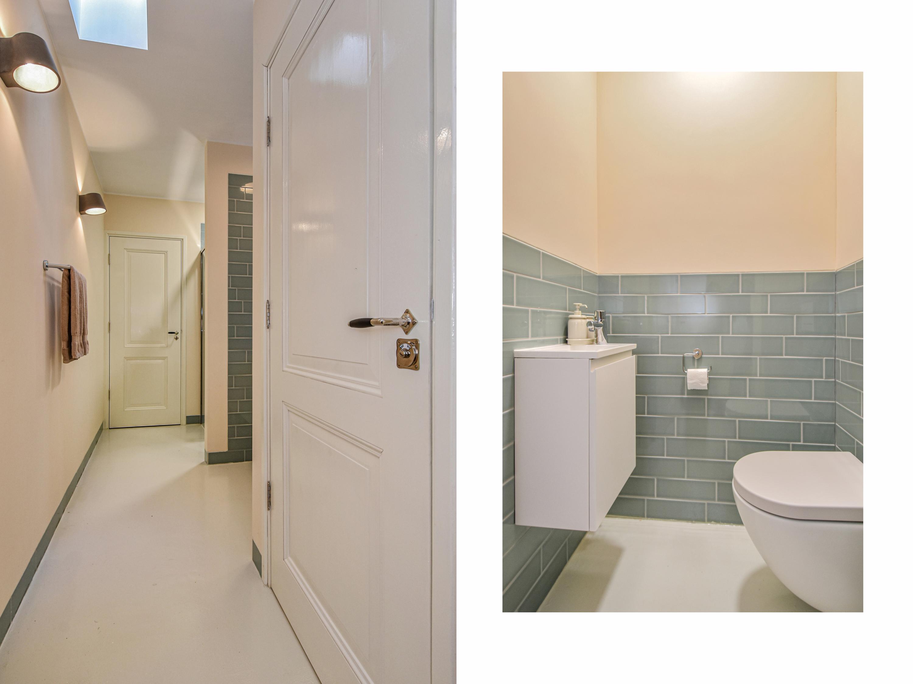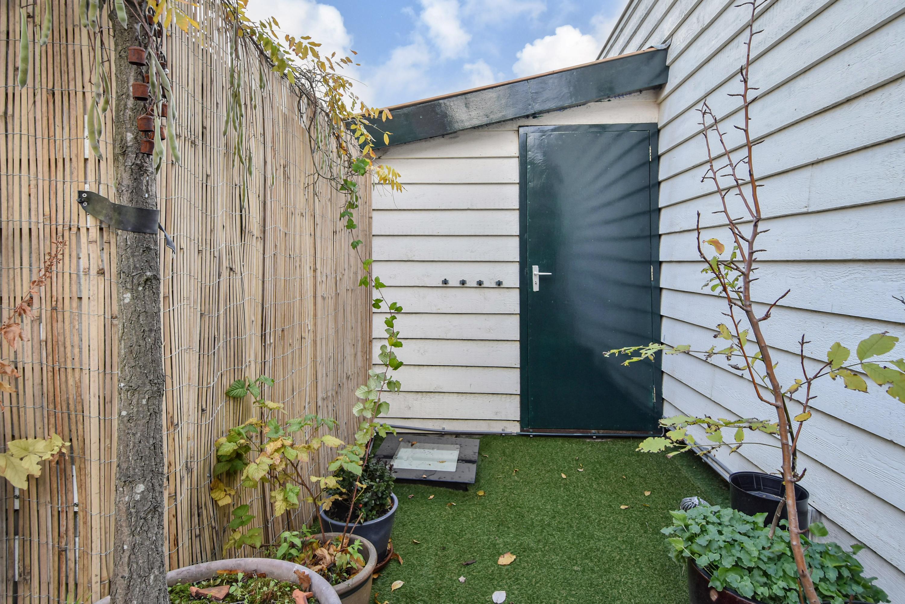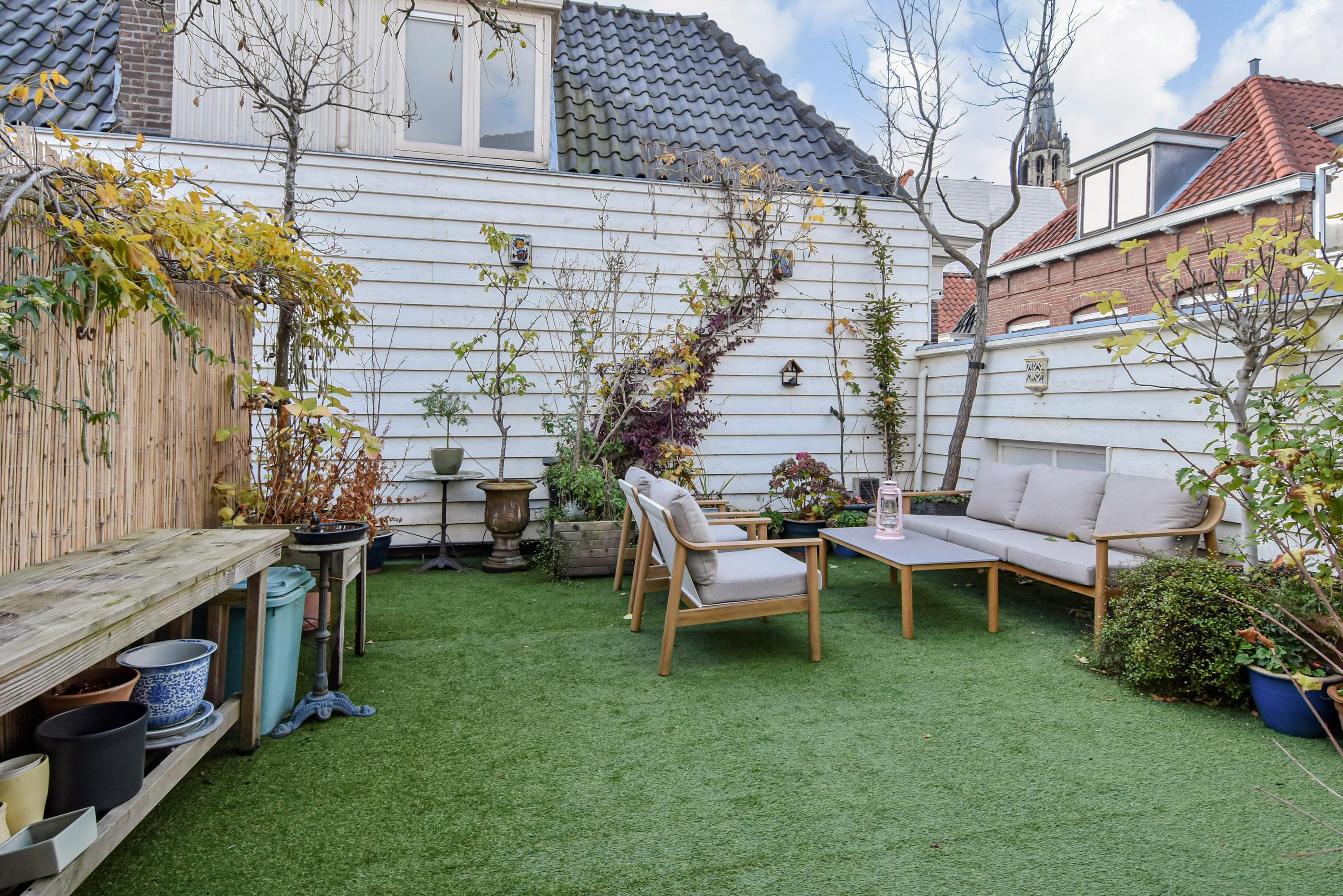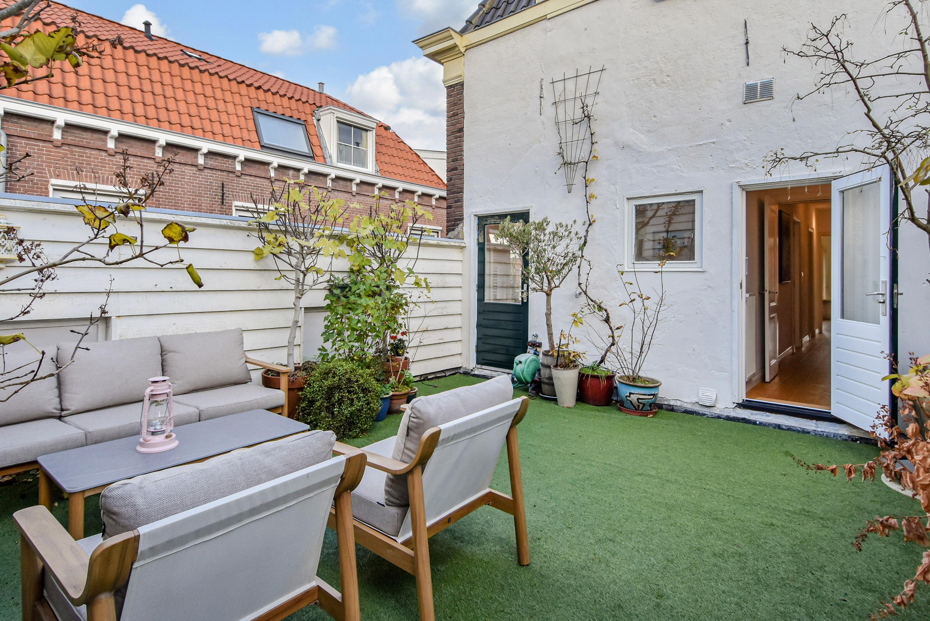 The landing provides access to a separate toilet with washbasin and additional storage space. The spacious and bright front bedroom features a high ceiling and a beautiful view over the canal. There are two additional large bedrooms, one with a walk-in shower and washbasin. All bedrooms are adorned with stained-glass windows. A separate laundry room gives access to the roof garden—a delightful, sheltered spot with optimal sunlight. From early morning until late evening, you can enjoy the sun, privacy, and a charming green setting. The terrace also includes a large wooden storage shed.