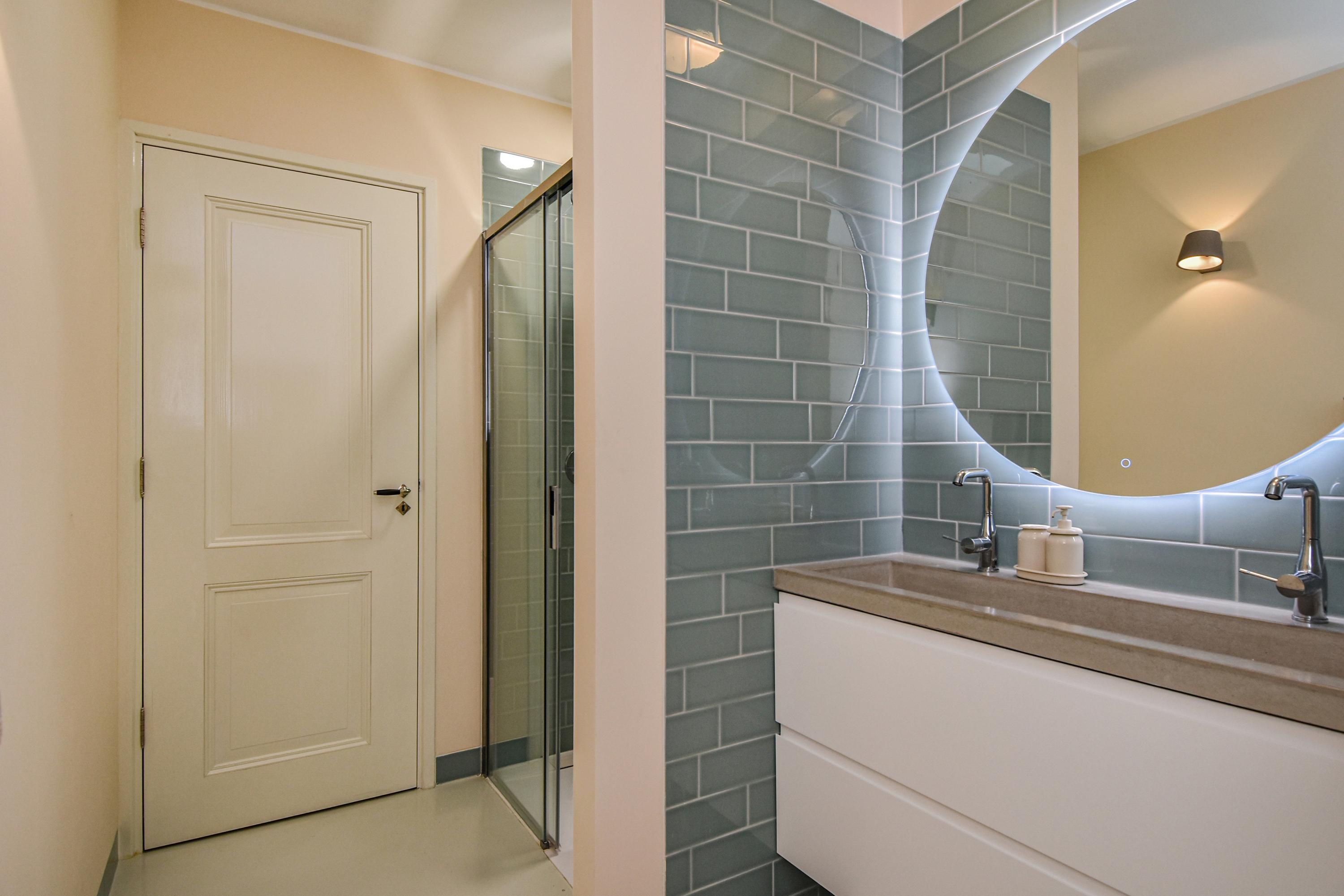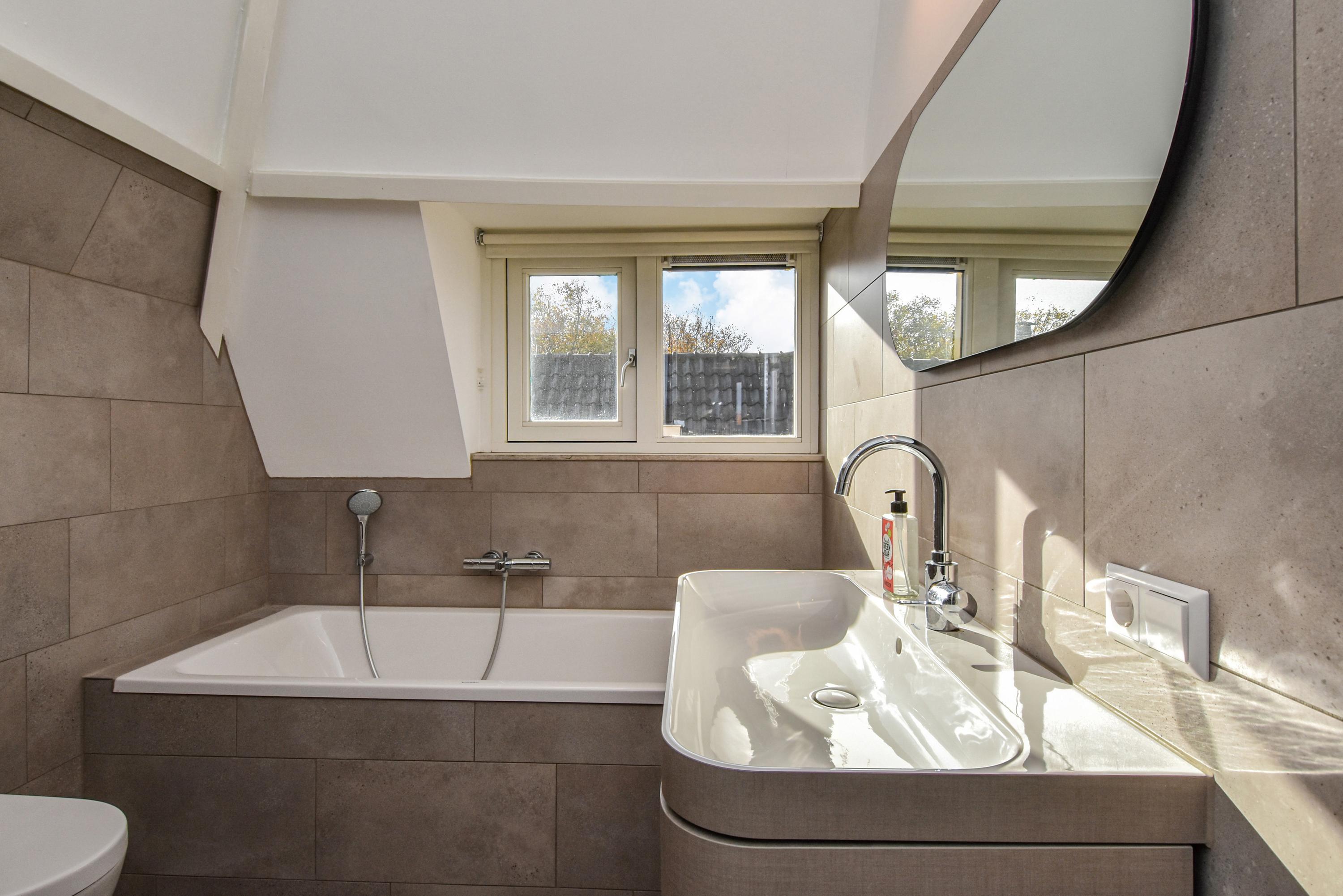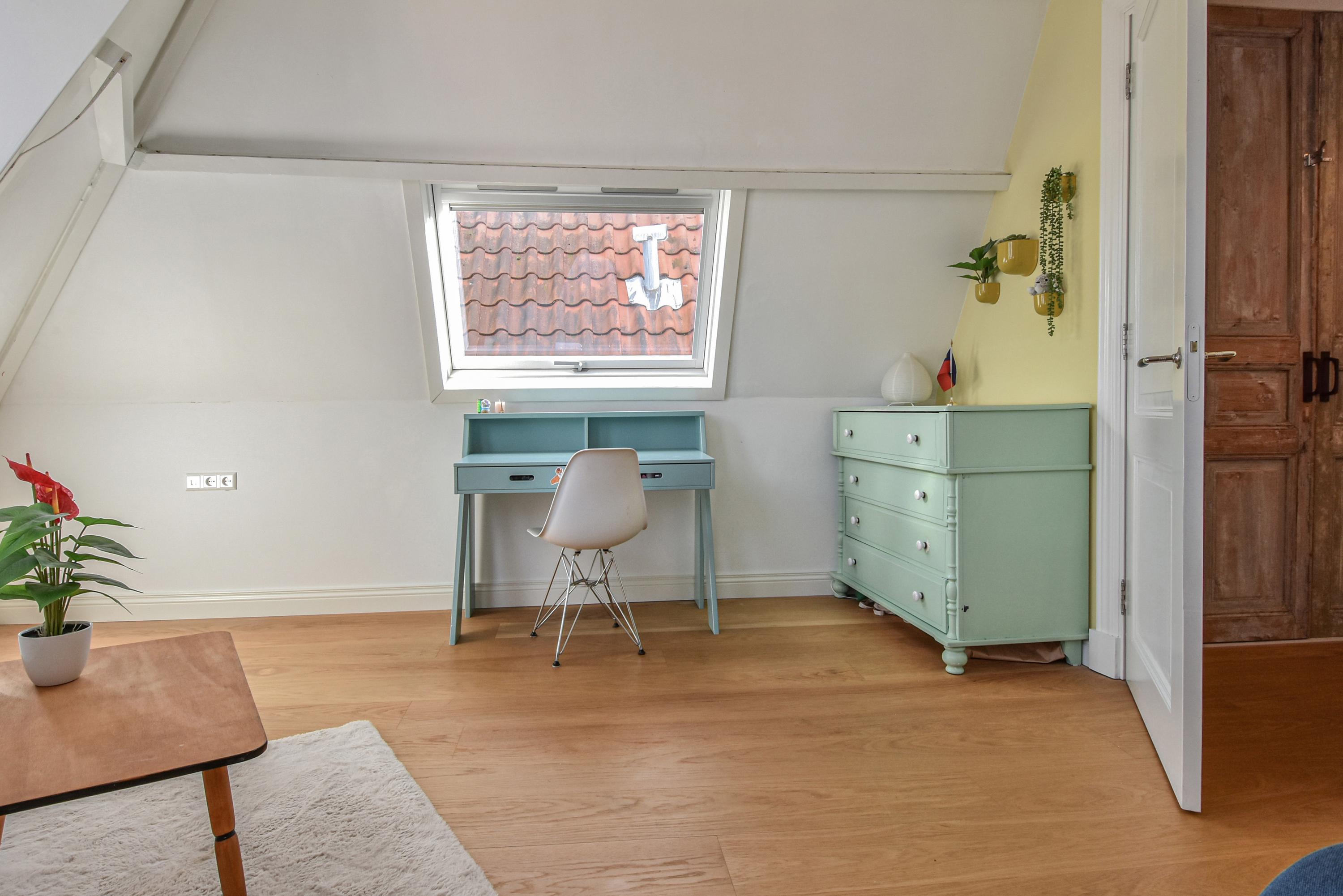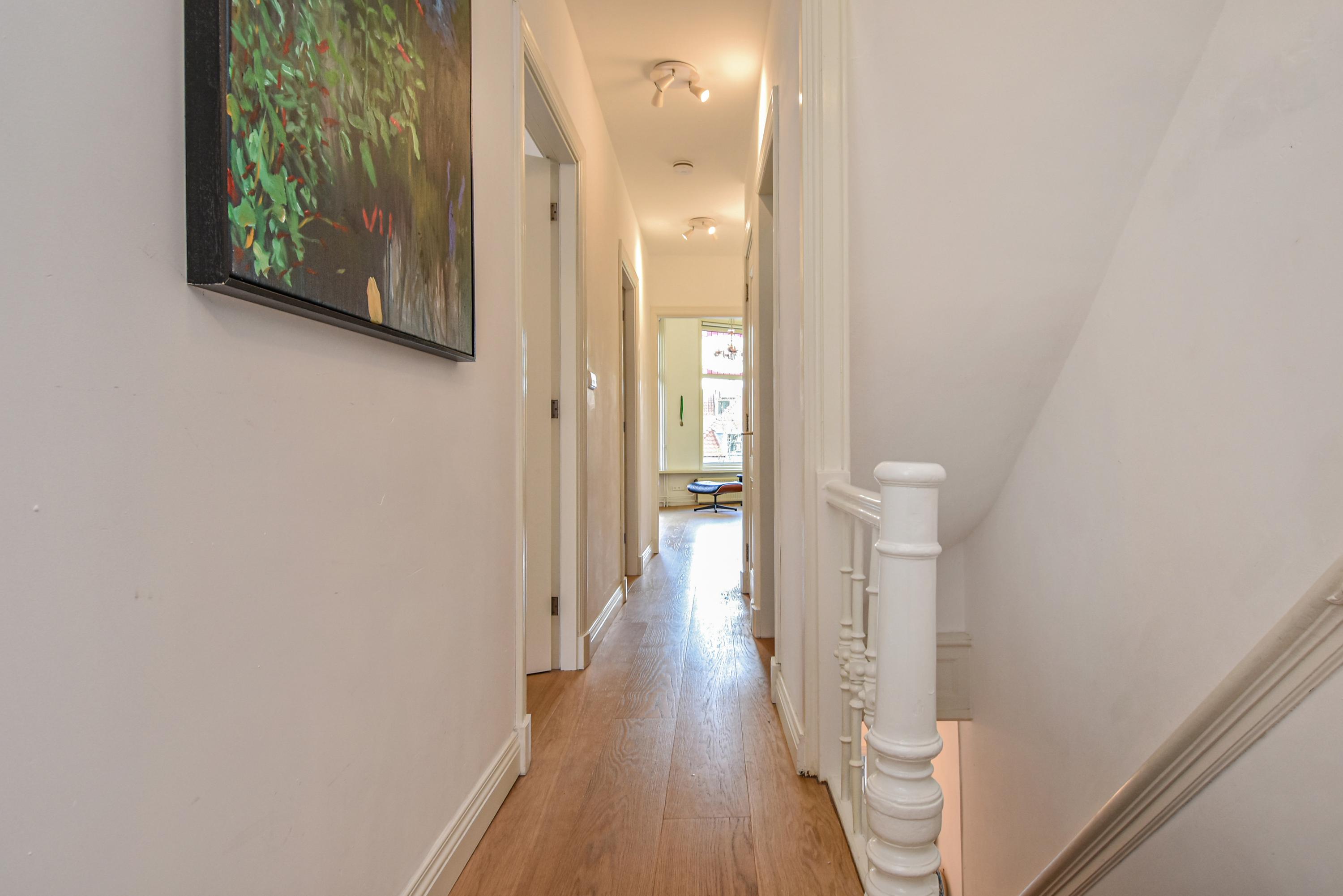 The second floor is surprisingly spacious. A long hallway with built-in cupboards and characteristic antique doors provides access to 3 more bedrooms. At the front, there is a large room with a skylight, dormer window, and open roof where the original beam structure is visible. The second bedroom features a tall dormer with an authentic hoisting beam, while at the rear there is another pleasant bedroom with dormer and skylight, offering views of Delft’s church towers. The luxurious bathroom is fully equipped with a bathtub, walk-in shower, fourth toilet, designer washbasin unit, and towel radiator.