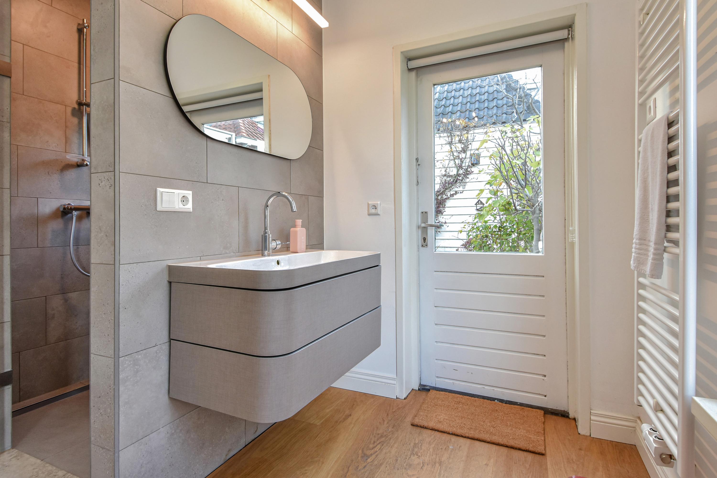 On either side of the kitchen are two inviting living areas: on one side a sitting room, and on the other a cozy living room with a comfortable seating area. Adjacent is an integrated studio, also featuring a high ceiling and French doors opening to the street. This room is arranged as a bedroom with its own bathroom, including a walk-in shower, double washbasin, and toilet—ideal as a guest suite, annex apartment, office, or practice space at home. At the rear, there is a large, practical bicycle storage room with attic space, accessible via Broerhuisstraat. From the living room, a straight staircase leads to the first floor.