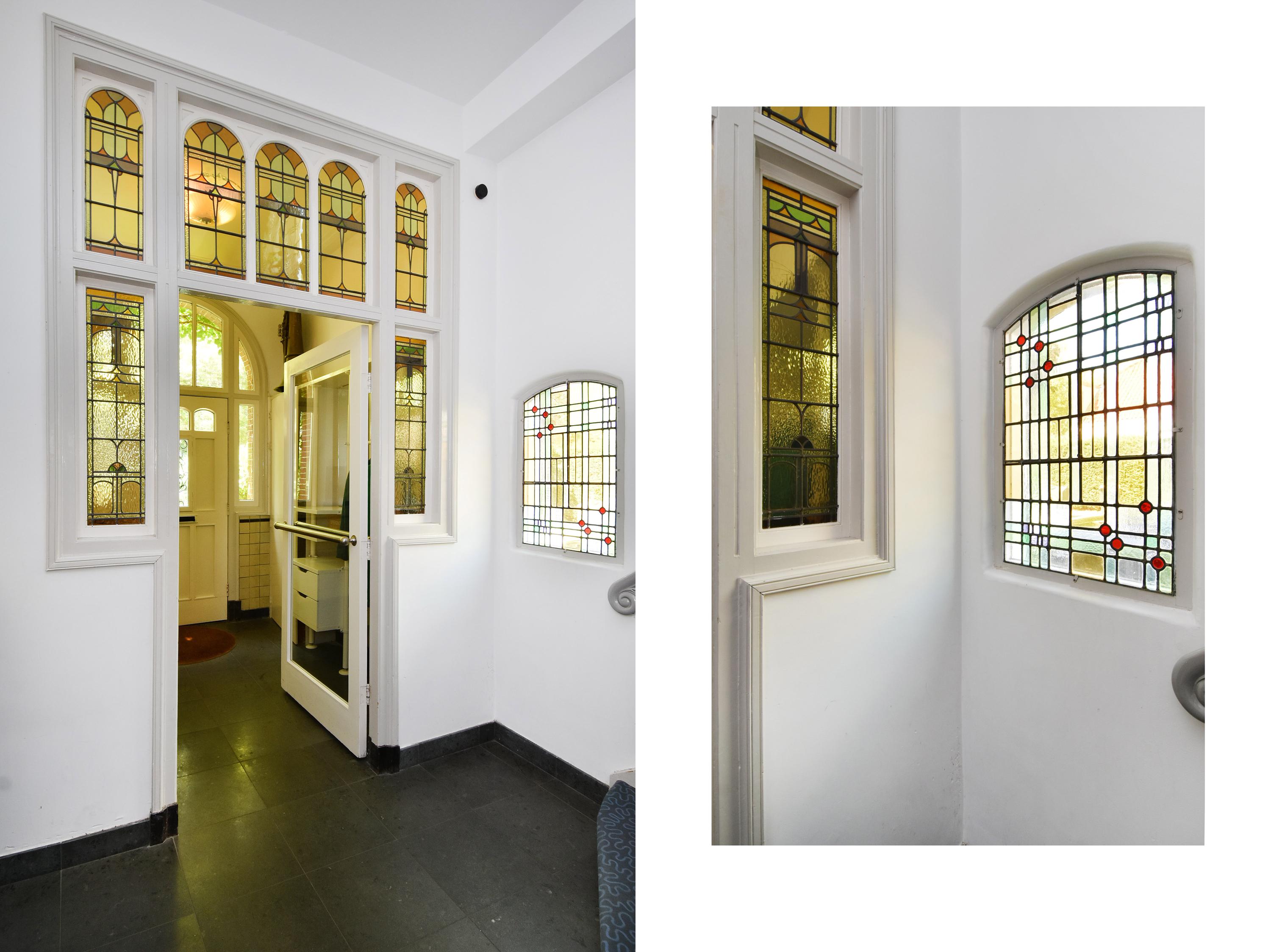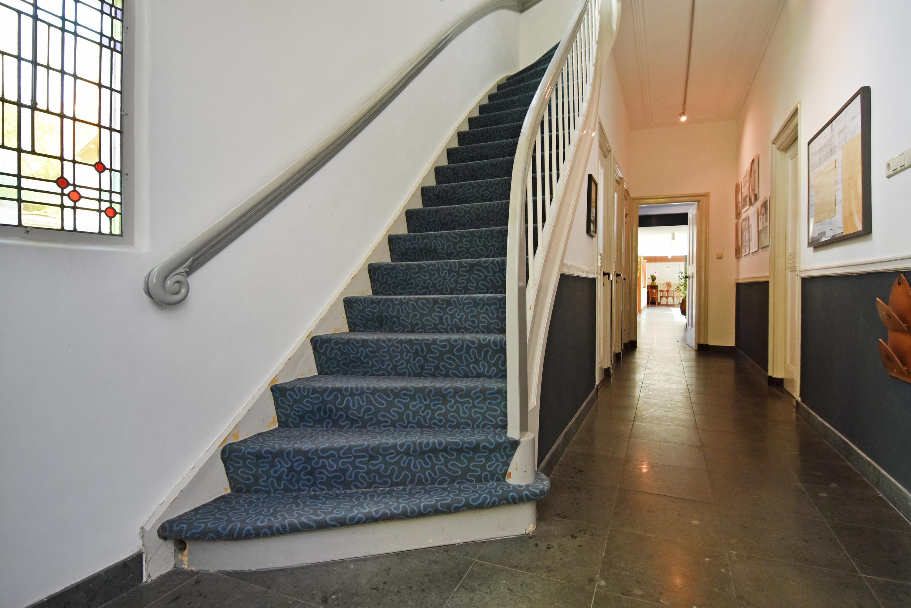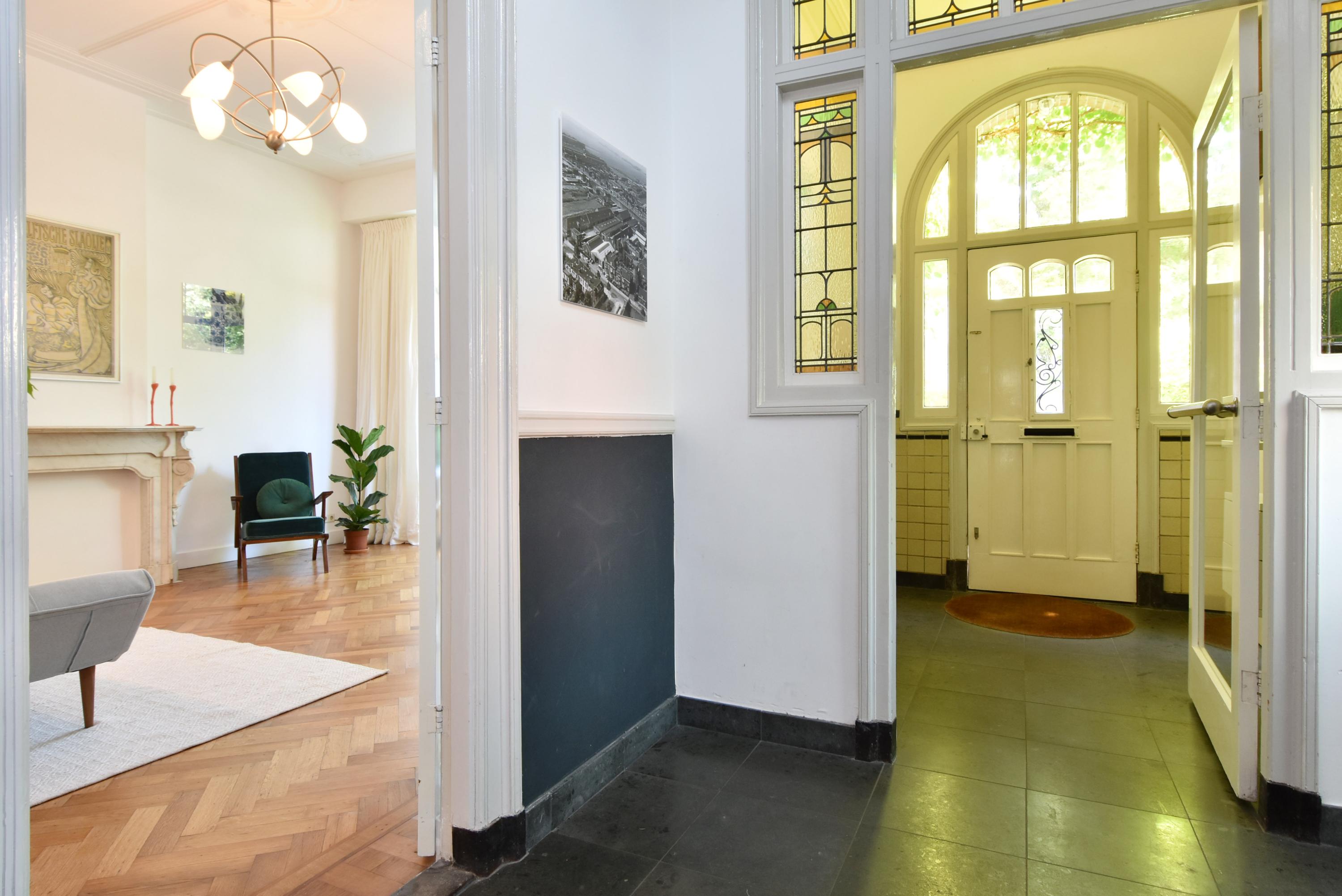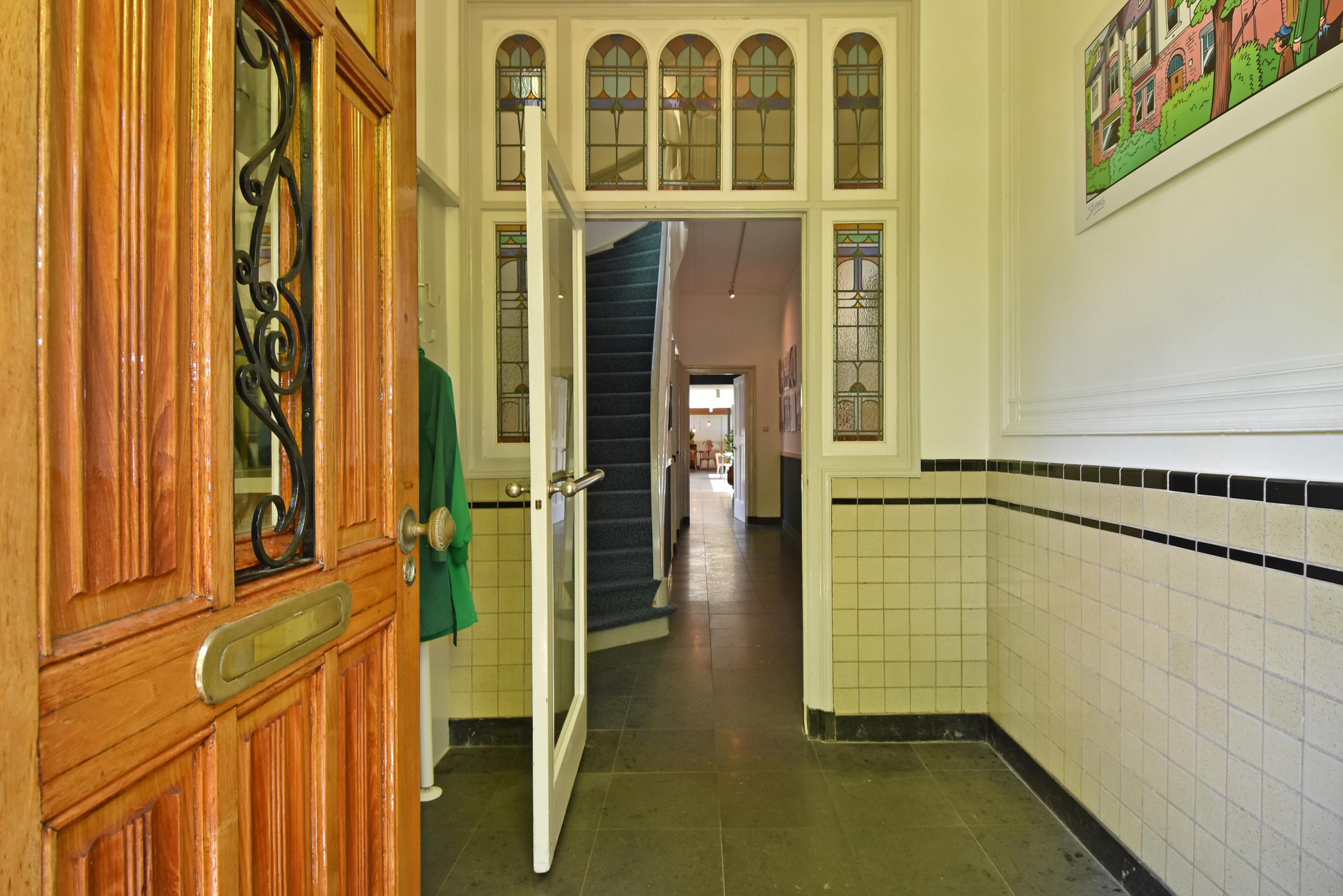 Entry through the beautifully landscaped front garden. Upon entering, you are immediately struck by the atmosphere and grandeur. A stately vestibule and original stained-glass partition lead into the wide and long hallway with natural stone flooring and underfloor heating. This hall provides access to several areas, including a toilet, storage space, and cellar.