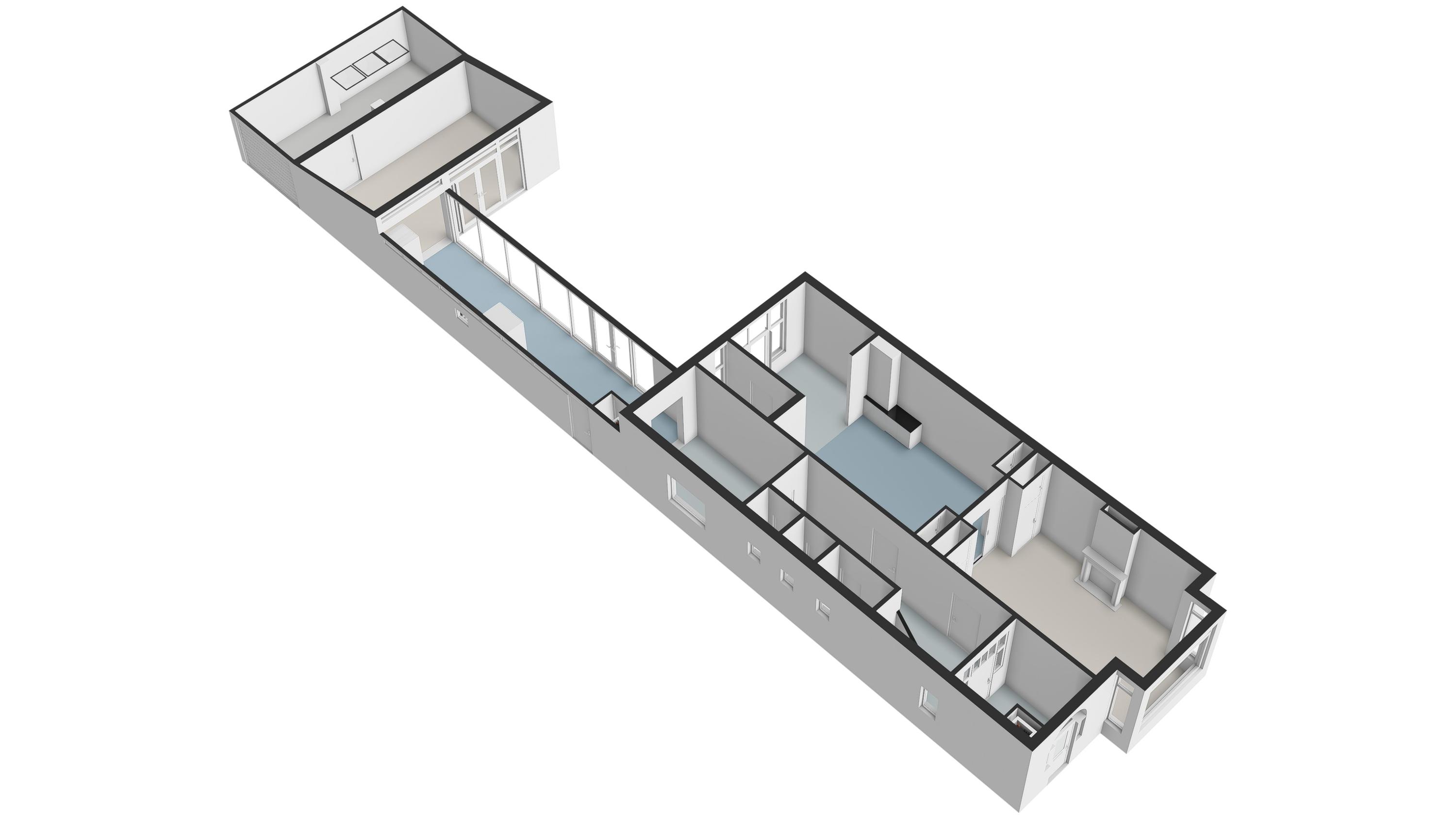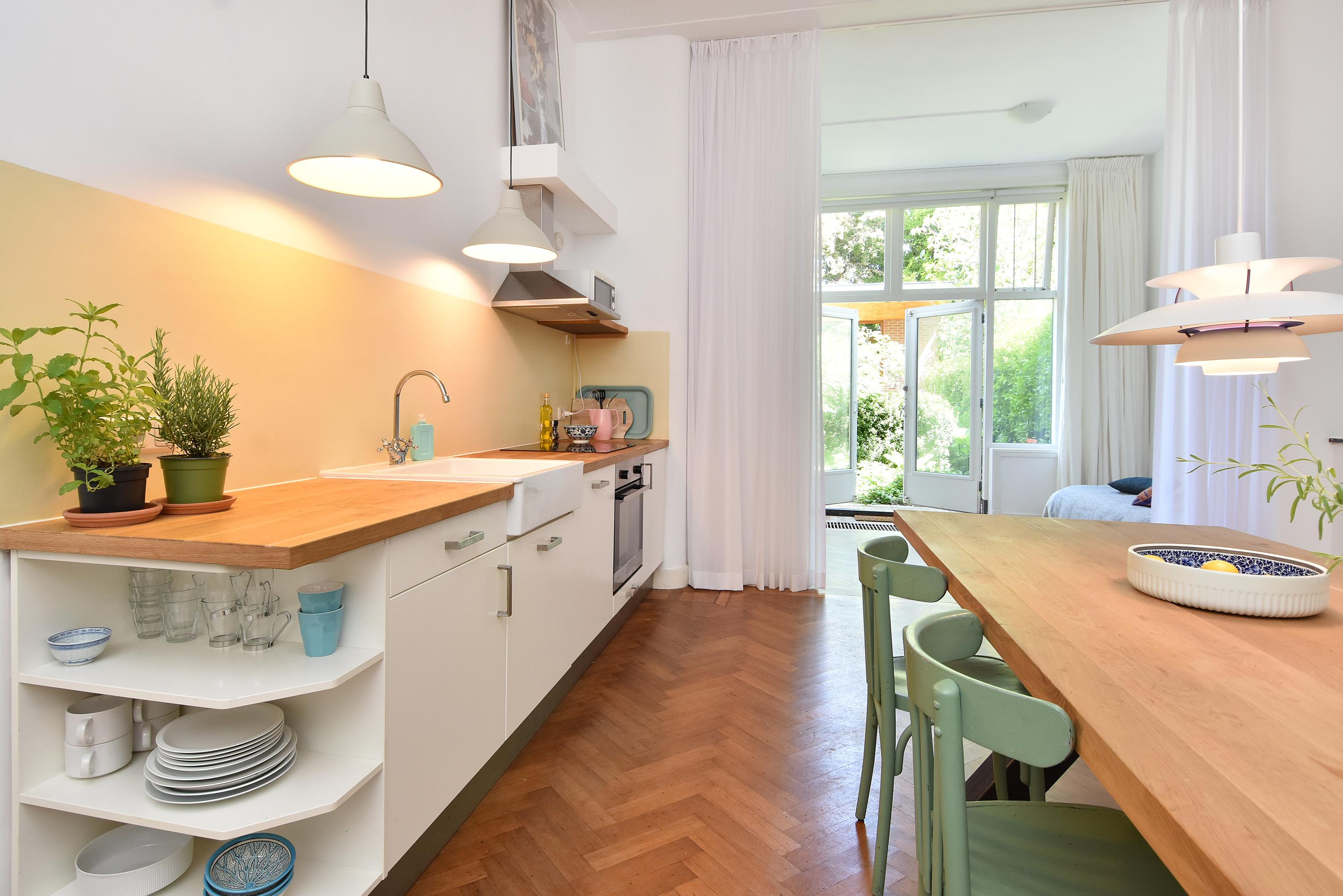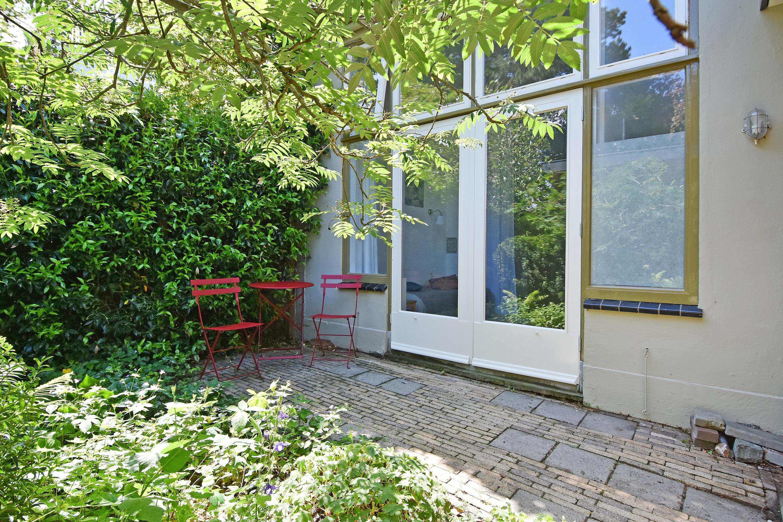 The adjoining and impressive front room features high ceilings, a bay window, fireplace, herringbone parquet flooring, and original sliding doors. The abundance of natural light enhances the sense of space. Through a robust en suite with sliding partition, you enter the rear room, now used as a spacious kitchen-diner. This unique and modern kitchen is fully equipped with a large island, ample work and storage space, built-in appliances, and much more. At the rear, a conservatory has been added, furnished with a modern bathroom including a second toilet, sink, mirror, and shower. Both the front and rear rooms feature herringbone parquet flooring. From here, you also have access to the sunny courtyard garden.
