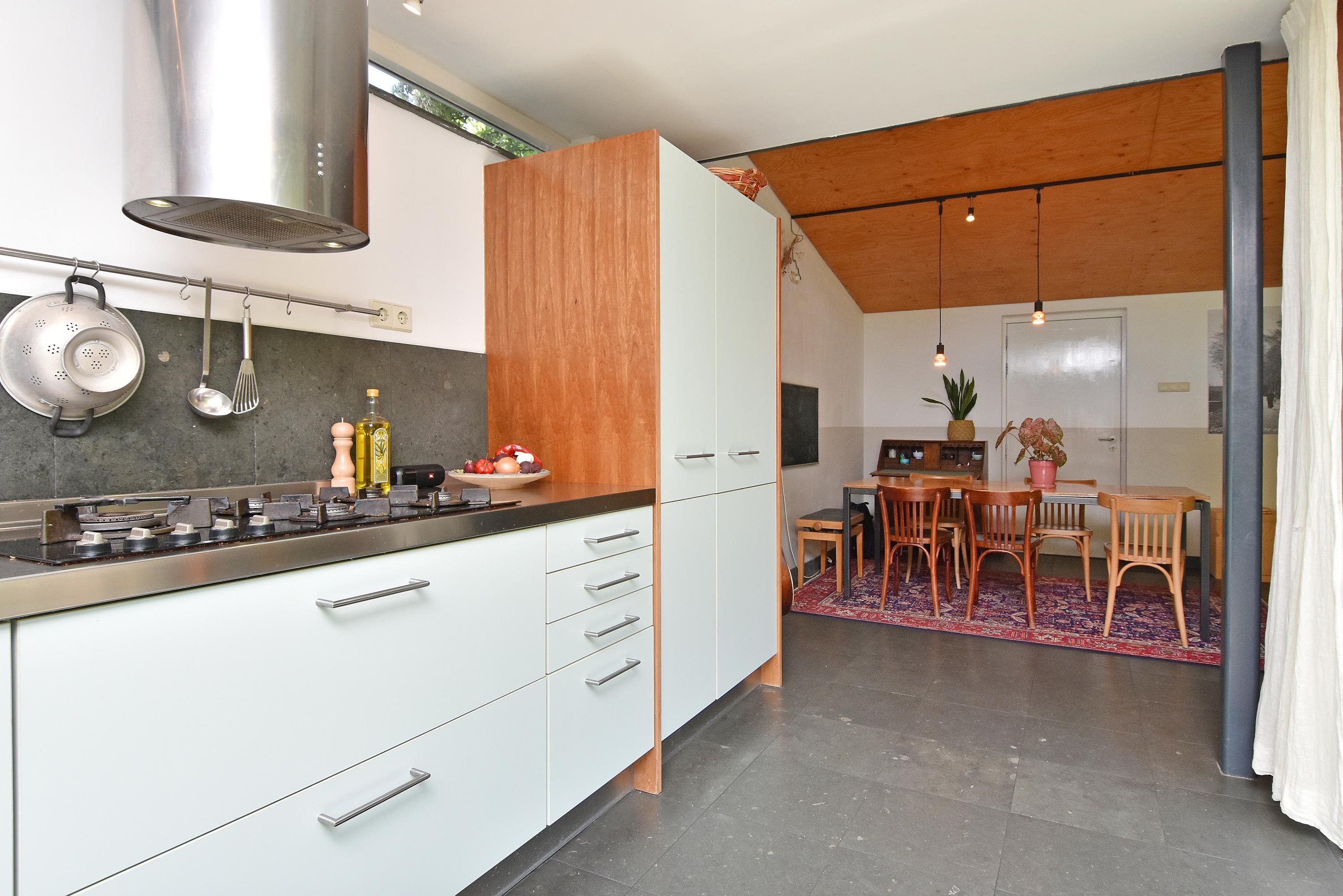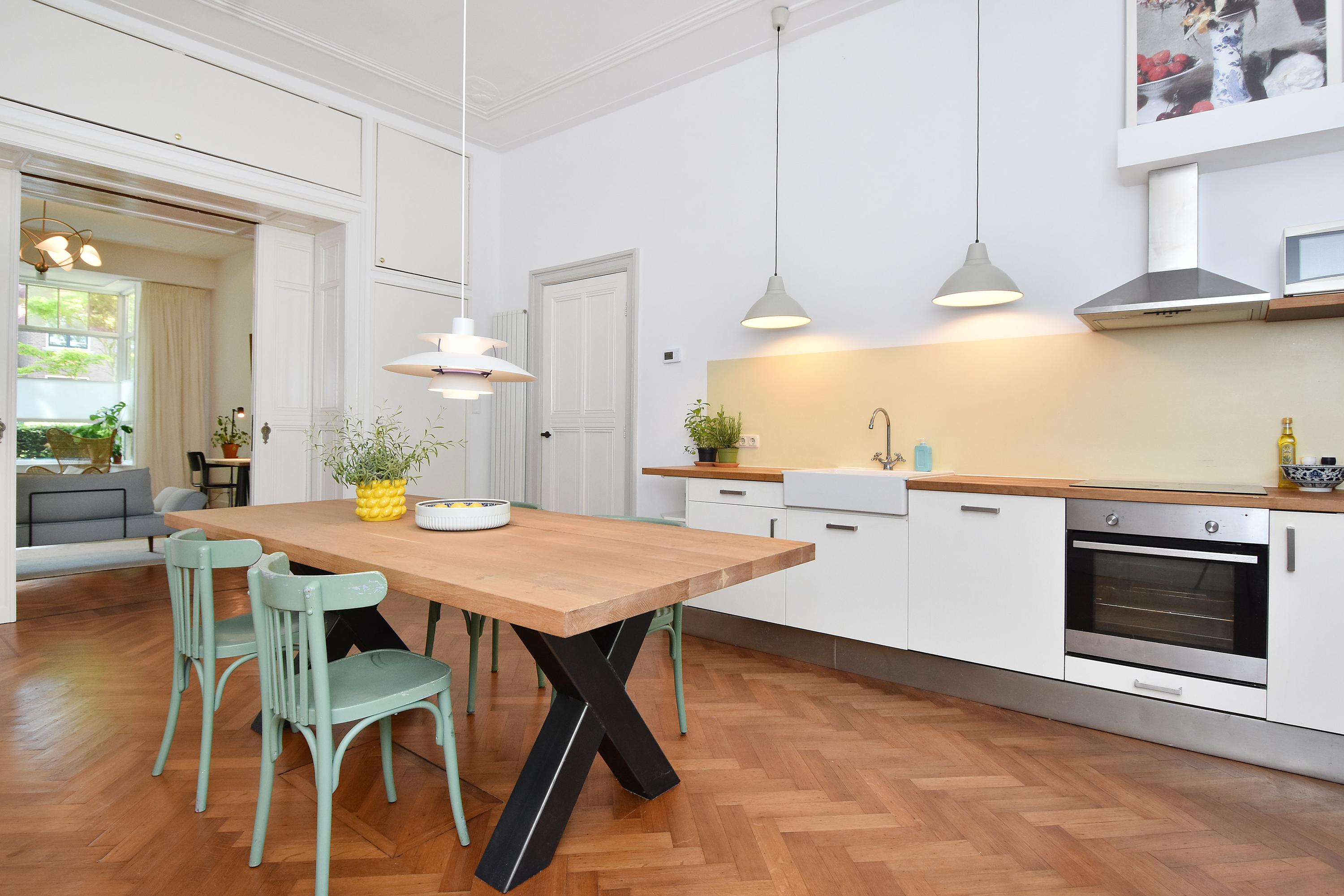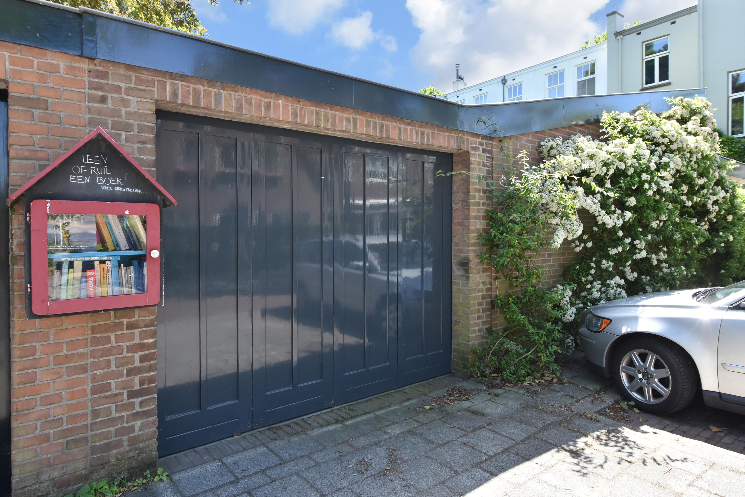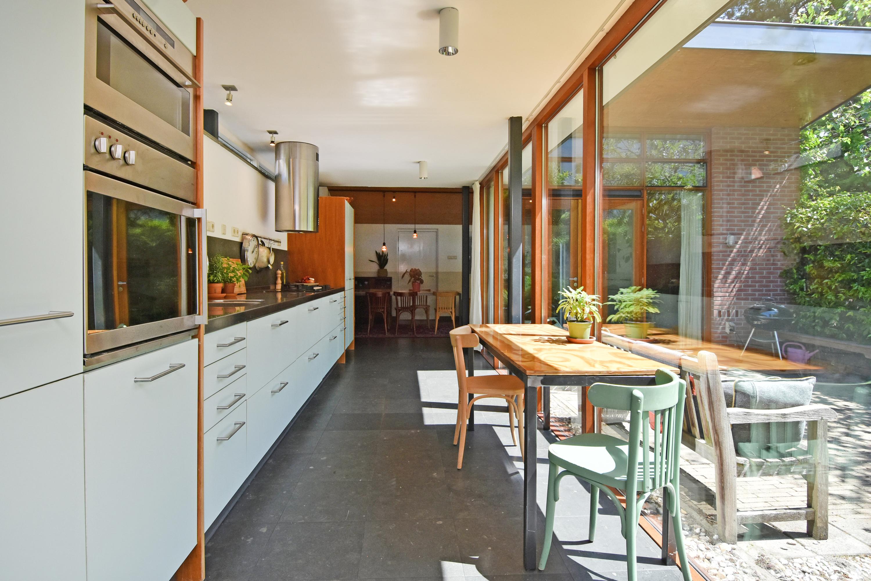 A modern extension forms a remarkable combination with the historic house. Here you will find a fully equipped and spacious kitchen, featuring a large block with stainless steel countertop, drawer units, excellent workspace, and many (designer) built-in appliances. Large windows provide unique views of the beautifully landscaped, lush, and sunny garden. Adjoining is a generous dining and music room, which also opens onto the back garden via French doors. This dining room also connects to the large garage at the rear, which benefits from daylight and can also be accessed via the side street.