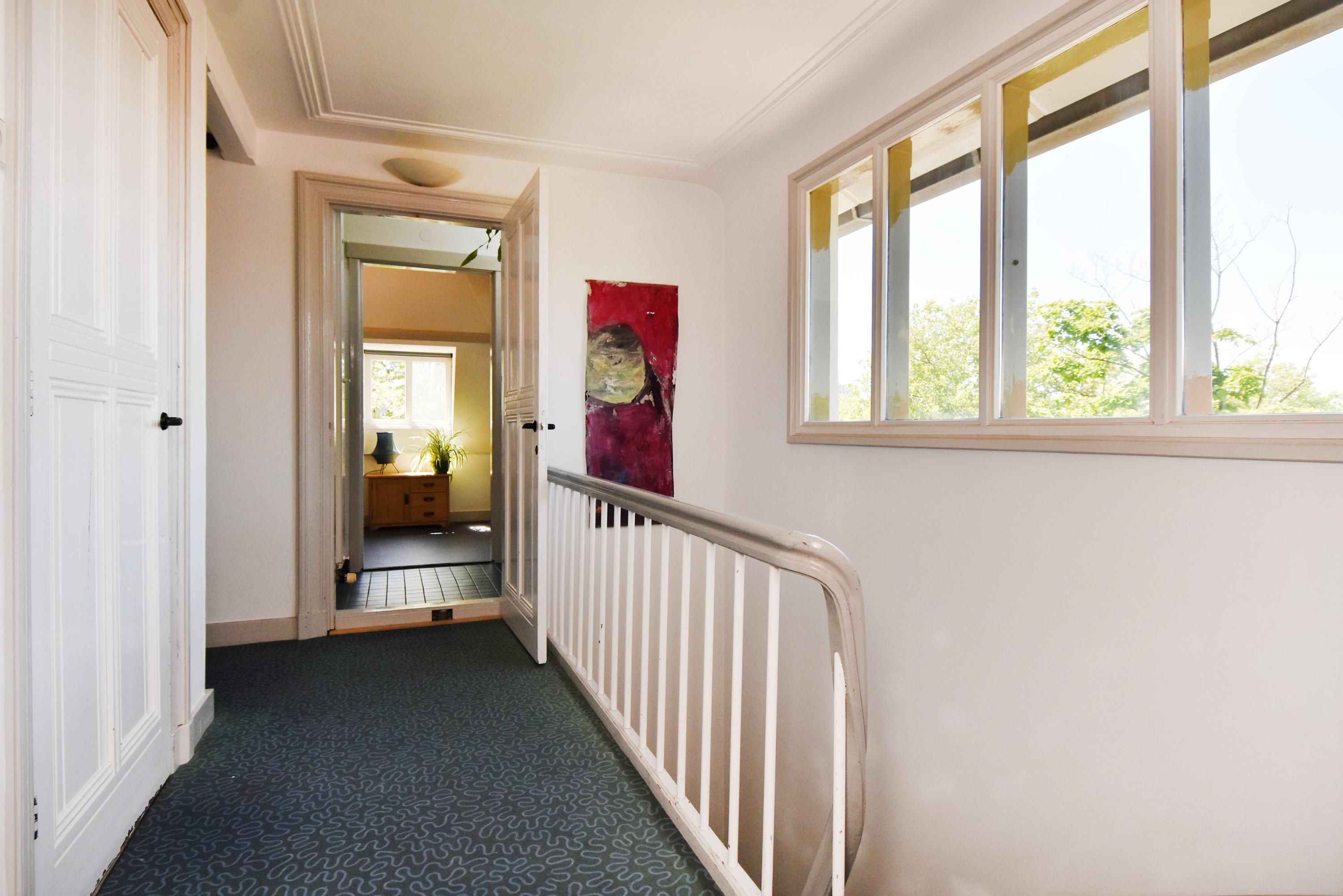 A bright staircase with stained-glass windows leads to the first floor. Here you find a particularly light and comfortable landing with access to a modern third toilet. The rear bedroom is spacious and comes with a private bathroom including shower and sink. Another striking feature is the large, combined living/dining room – a stylish and atmospheric space offering exceptional comfort, with direct access to a study at the front. This versatile room includes a kitchenette and, at the rear, opens onto a sunny and spacious balcony with beautiful green views.