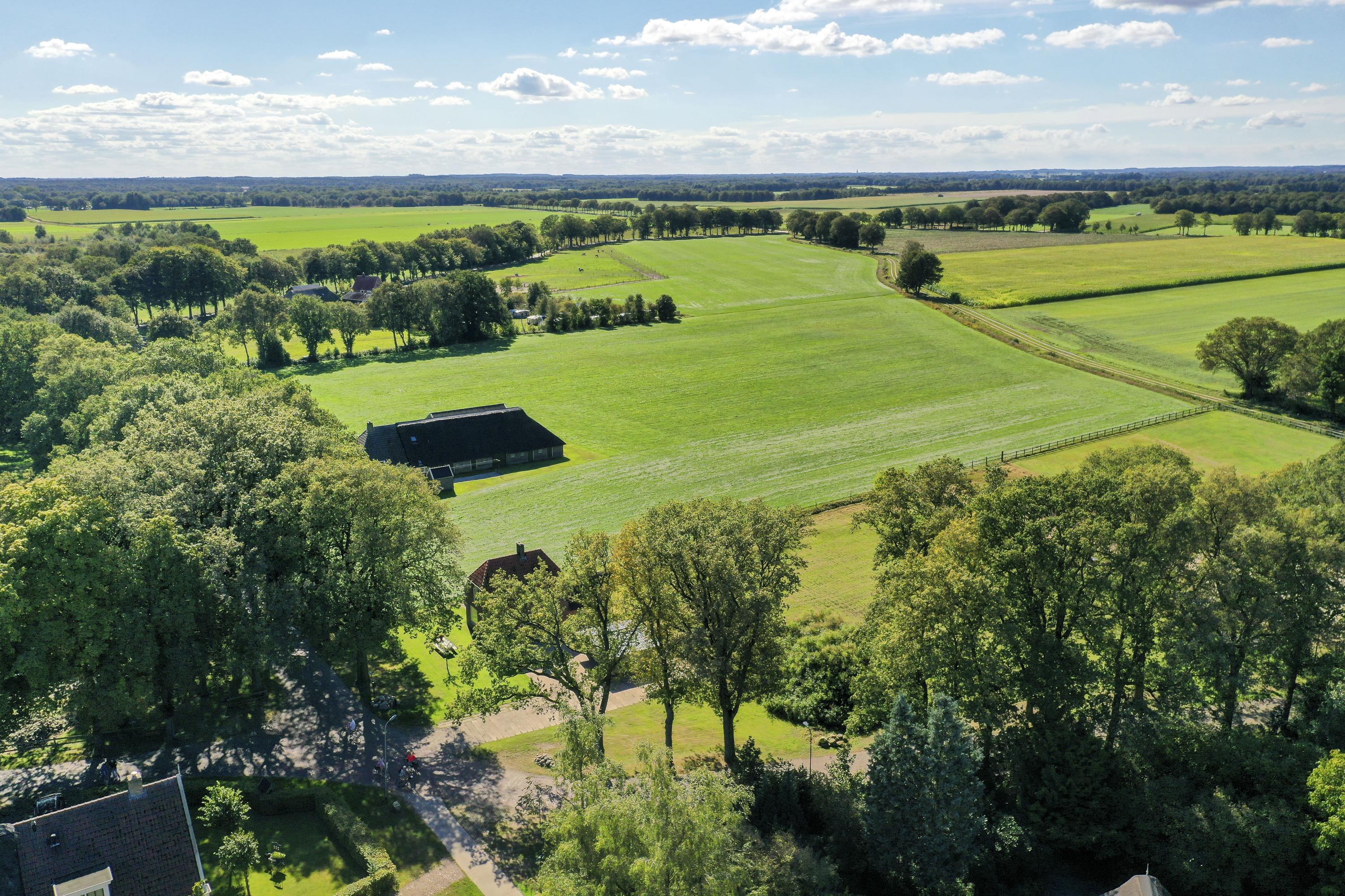 The architect involved in this design is Bekhuis & Kleinjan. The design is inspired by country living with reference to the traditional Drenthe farmhouse but with all the luxury and comfort of today. The house features thatched roofs with brick chimneys, sturdy oak beams and pillars, large windows oriented toward beautiful natural surroundings, wide roof overhangs with covered wine & dine areas, a pool house (or guesthouse) with wellness facilities, and a spacious double garage with attic and carport. All of this is arranged in a horseshoe layout to ensure maximum privacy. In addition to the construction drawings, a garden design is also available. The permit is valid indefinitely, allowing the house to be positioned freely on the plot, with the condition that the old house will be demolished. The existing house is perfectly habitable during the construction of the new residence. The existing home built in 1945, has three bedrooms, a bathroom, a semi-open kitchen, and a living room with a south-facing terrace.