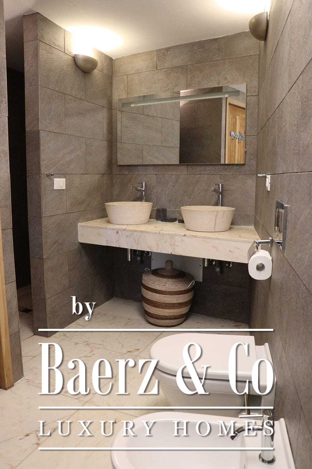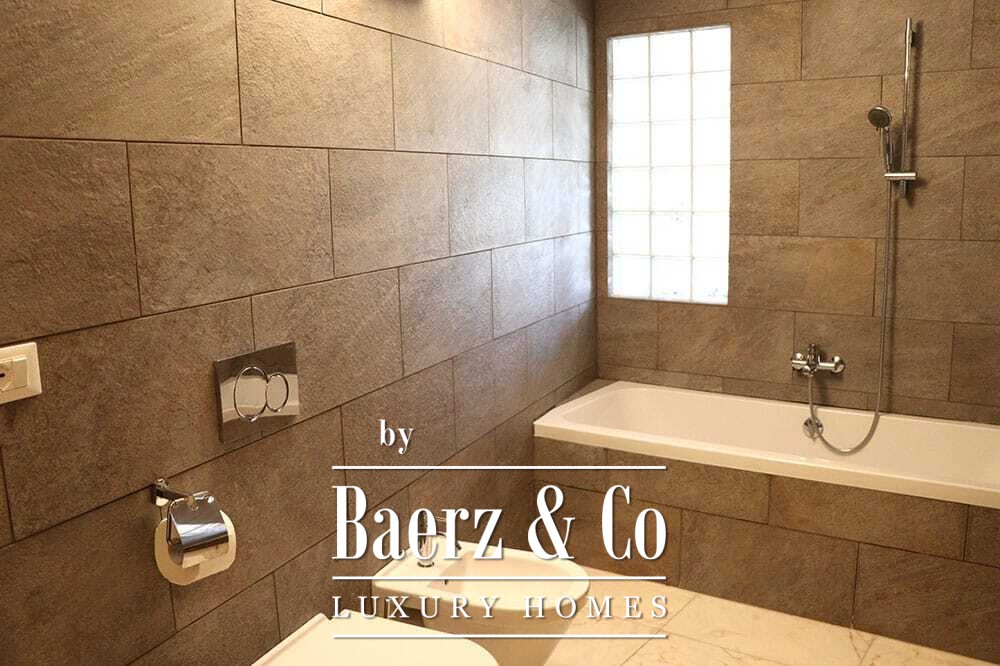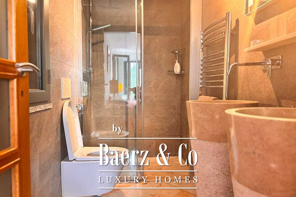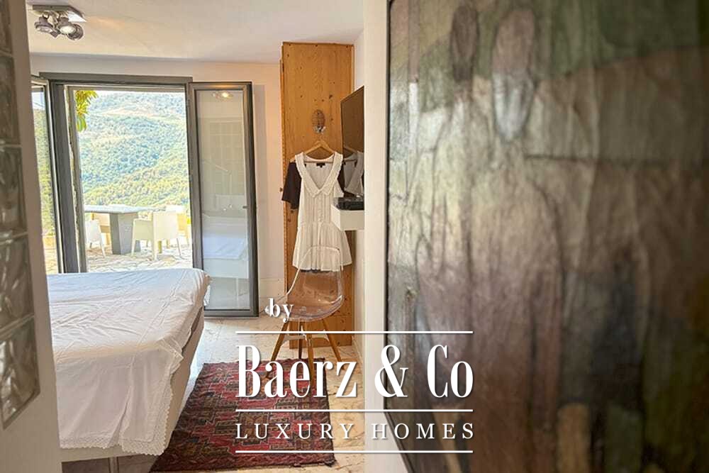 Within its two floors, the villa offers four bedrooms and four bathrooms. Three ground floor bedrooms, each with French doors, open to a lower terrace and mountain vistas. The master suite features a large bath, separate shower, twin marble basins, and designer fittings, defining a sense of sanctuary. The studio bedroom, with private entrance, enhances flexibility for guests or work. Upstairs, a beamed living room with fireplace adjoins a walnut and stainless steel kitchen equipped with premium Miele appliances. High glass doors lead to a lounge with a second fireplace and access to terraces finished with granite tables and Philippe Starck chairs.
