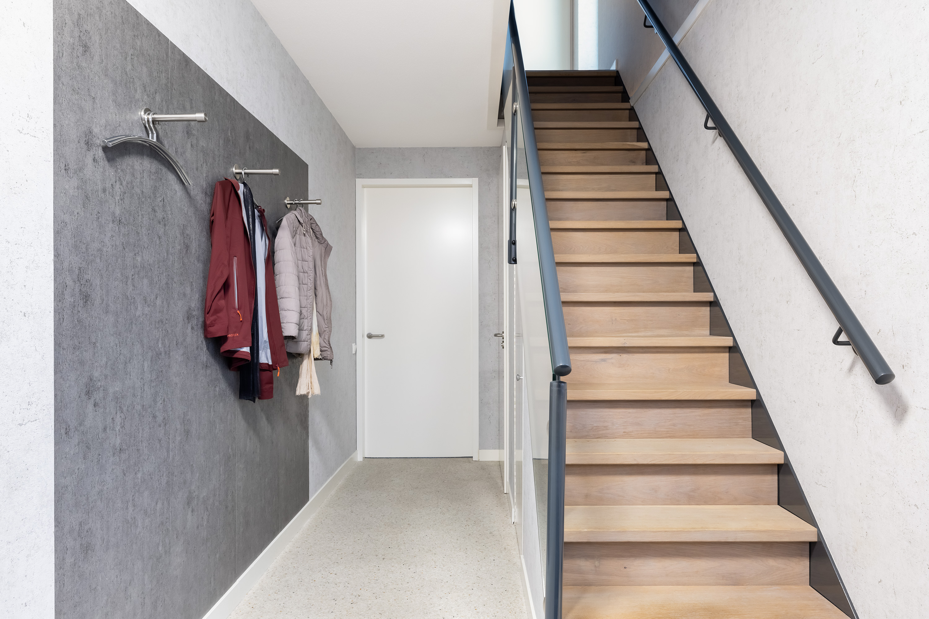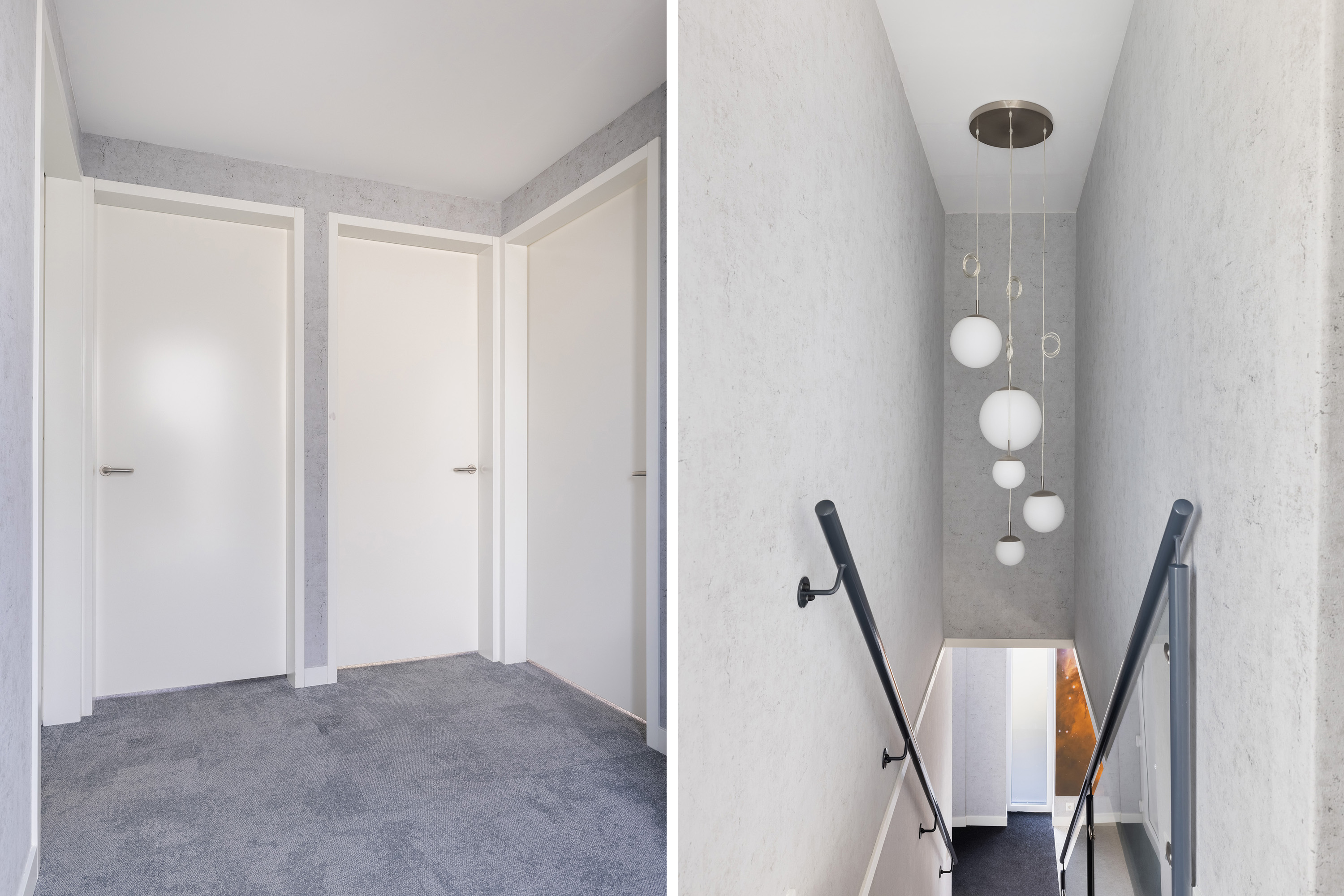 Bright and spacious landing with built-in storage housing the underfloor heating distributor for upstairs, the solar inverter, and mechanical ventilation unit for this floor. Provides access to 3 bedrooms and a second bathroom.