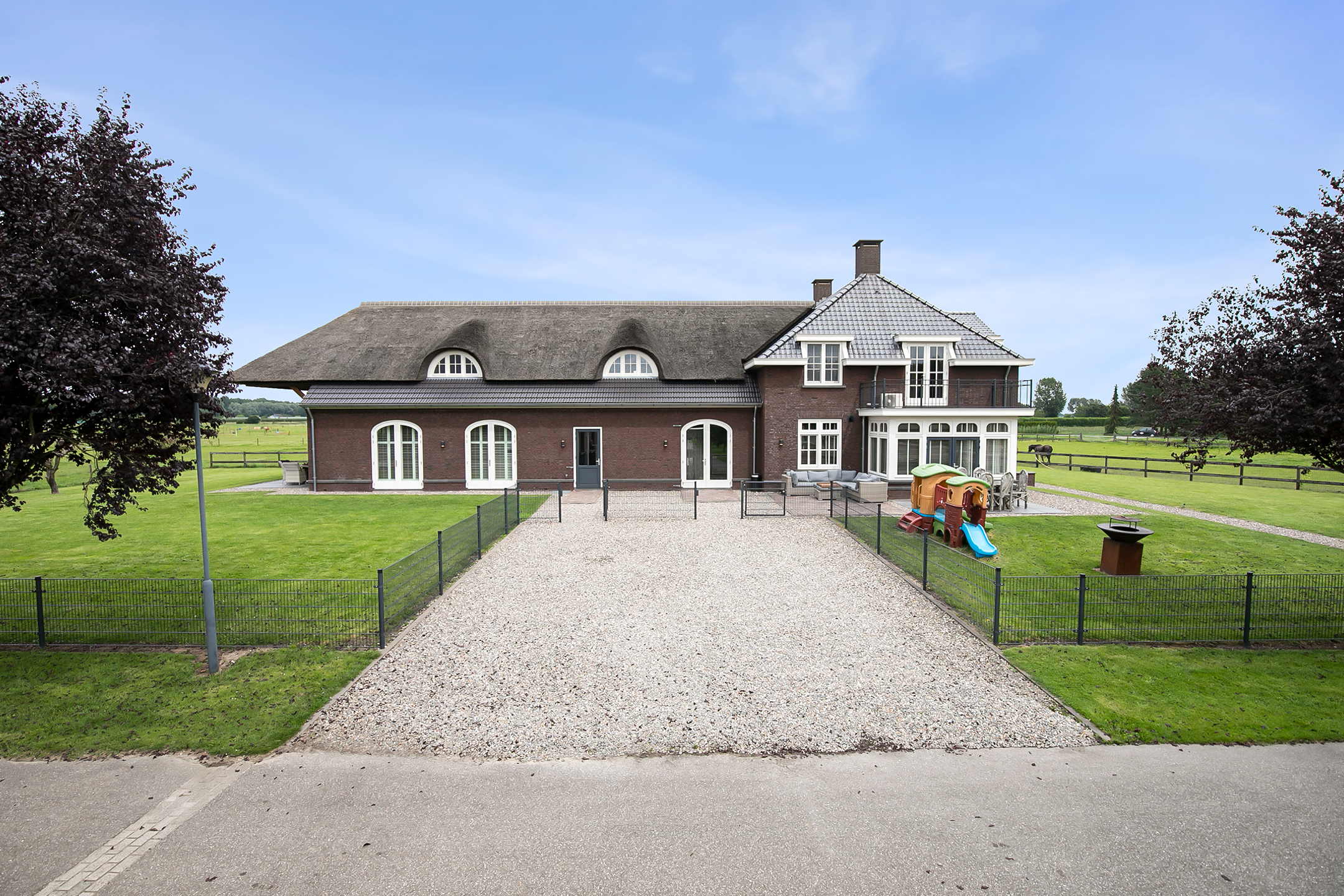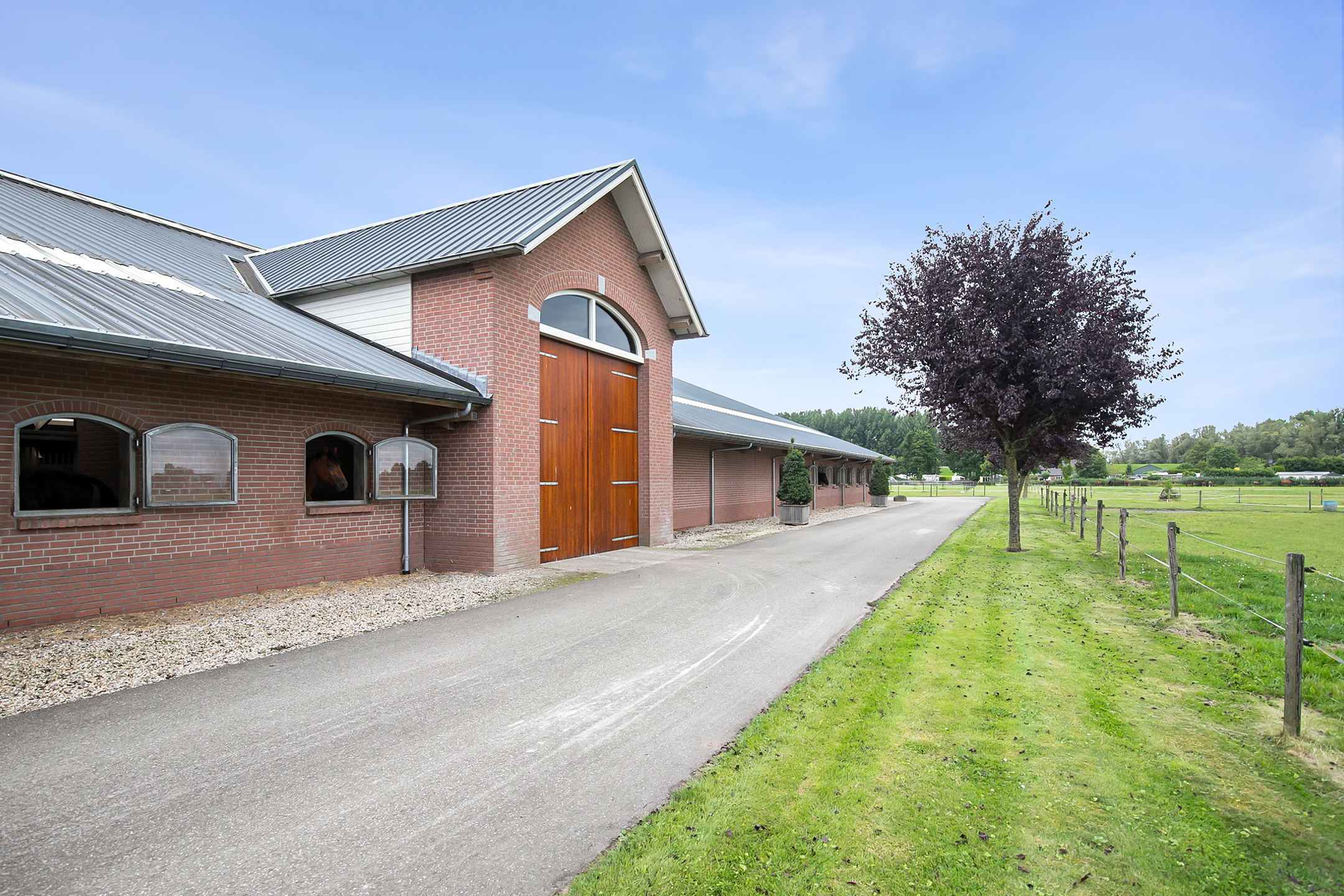 The hall at the front of the riding hall has a cobbled floor and provides access to a storeroom, toilet rooms, laundry room and a shop area. A spiral staircase provides access to the 1st floor. The reception area and a flat are located here. The reception area has a tiled floor, stucco walls and a suspended ceiling. There is a kitchenette and bar. French doors provide access to a balcony at the front of the riding hall. Large windows offer nice views of the indoor arena and stables. There is also access from the reception area to a balcony above the indoor arena.The flat is equipped with a living room with open kitchen, 2 bedrooms and a spacious bathroom. The flat has a tiled floor. The kitchen unit features a sink, induction hob, dishwasher, fridge and combination microwave. The bathroom is fully tiled and further equipped with a shower room, washbasin with cabinet and a floating toilet. A laundry room is located behind a practical sliding wall. The indoor arena (approx. 21x61 m) is equipped with a professional soil (Ben Agterberg), a beautiful hardwood arena edge. Vaulted wooden rafters add to the atmosphere. A skylight in the ridge provides beautiful natural light. LED lighting is also available. The 39 horse stalls are divided over two stall corridors. The stalls have partly hardwood / partly galvanised front walls and masonry partitions and rear walls. The doors of the stalls are hinged. The stalls are also equipped with an outside hatch. Each stall corridor has its own facilities such as washing areas and a tack room. Between the corridors there are three spacious loose boxes. The washing areas are equipped with hot and cold water supply. There is also a place for the farrier and physio. There is another flat at the rear. Access is gained via a flight of stairs on the outside. There is also a balcony here. The flat features a spacious living room with open kitchen, 3 bedrooms, a spacious bathroom, a utility room, laundry room and a toilet room.At the rear of the plot is a detached field barn situated. The barn is constructed of masonry skirting with sheet pile walls and the insulated roof is covered with sandwich panels. At the front, the field barn is fitted with windbreak netting. There is a feed silo in the barn. There are currently 14 horse boxes and a lunging circle, but this barn is of course also extremely suitable for various other purposes.