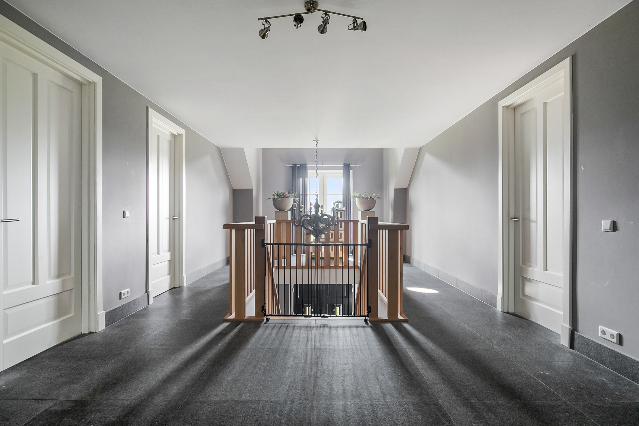The covered entrance with a double sliding front door, gives this villa an attractive appearance. The spacious reception hall with imposing wooden staircase provides access to the living room and the 1st floor. The hall has a natural stone tiled floor, stucco walls and a stucco ceiling. The spacious living kitchen with dining area has a natural stone tiled floor, stucco walls and a stucco ceiling with recessed lighting. The kitchen features a wall-mounted unit with appliance wall and a cooking and rinsing island. The appliance wall is further equipped with an oven, coffee maker, steam oven and fridge. The island features a 5-burner gas hob with built-in extractor fan in the ceiling, a sink and a dishwasher. Various cupboards and drawers provide plenty of storage space. A large bay window/extension with French doors provide access to the garden. The many windows provide plenty of natural light. A fireplace adds atmosphere and warmth to the room. From the living room there is a nice view of the horse pastures. And here, too, large windows and double doors provide a sea of light. In addition, there is a beautiful, large fireplace with a gas fire that provides even more atmosphere and warmth in the room. Sliding doors close off the living room from the kitchen/dining area. Semi-circular French doors in the side wall of the house provide access to the front house. The spacious entrance hall provides access to the utility/laundry room, living room, toilet room and the meter cupboard. The utility/laundry room is equipped with a sink. Also located here are the connections for the washing equipment. From here, there is access to the office/workroom. The office space is a fine room which is obviously suitable for various purposes, such as a playroom or chill room.