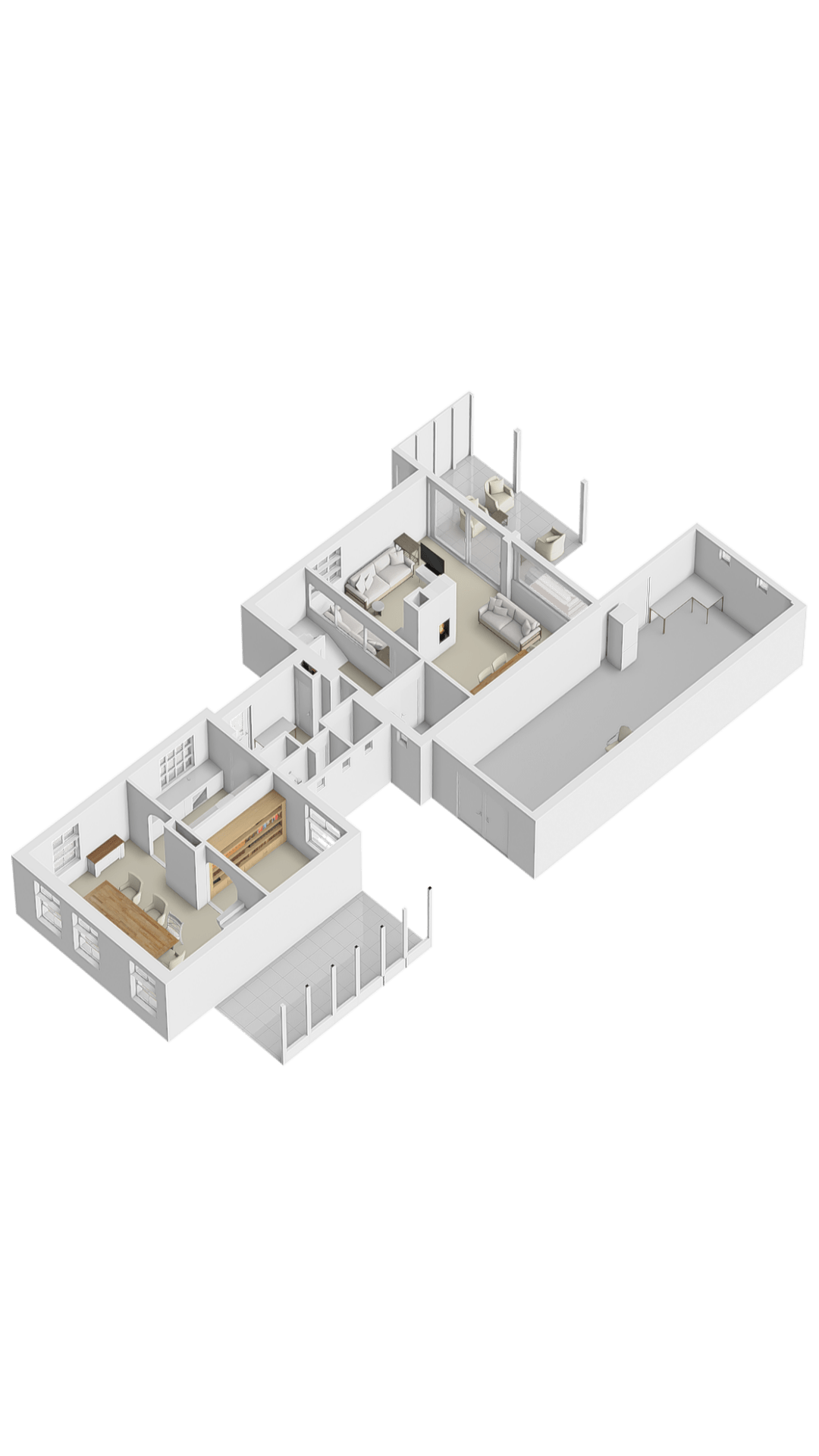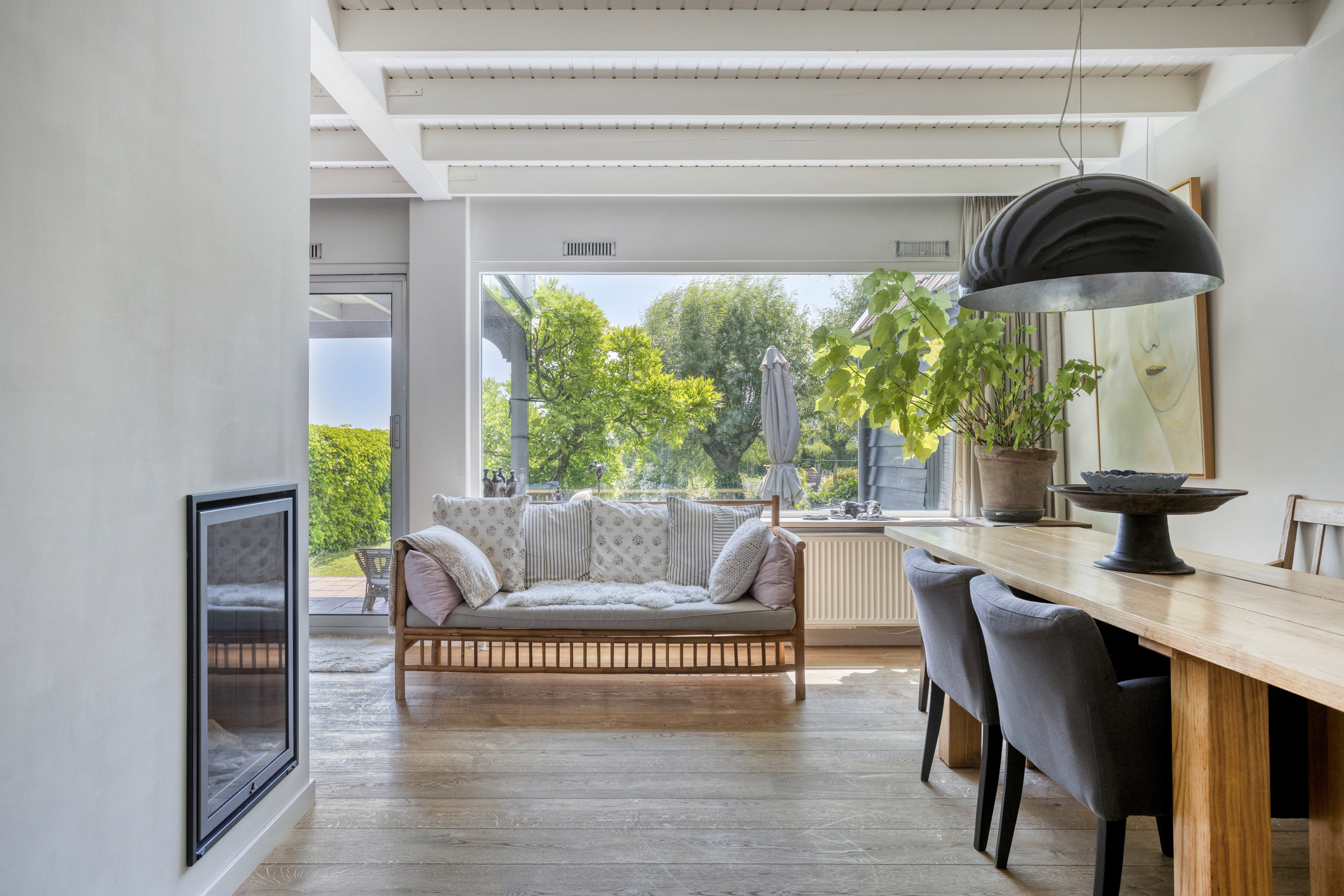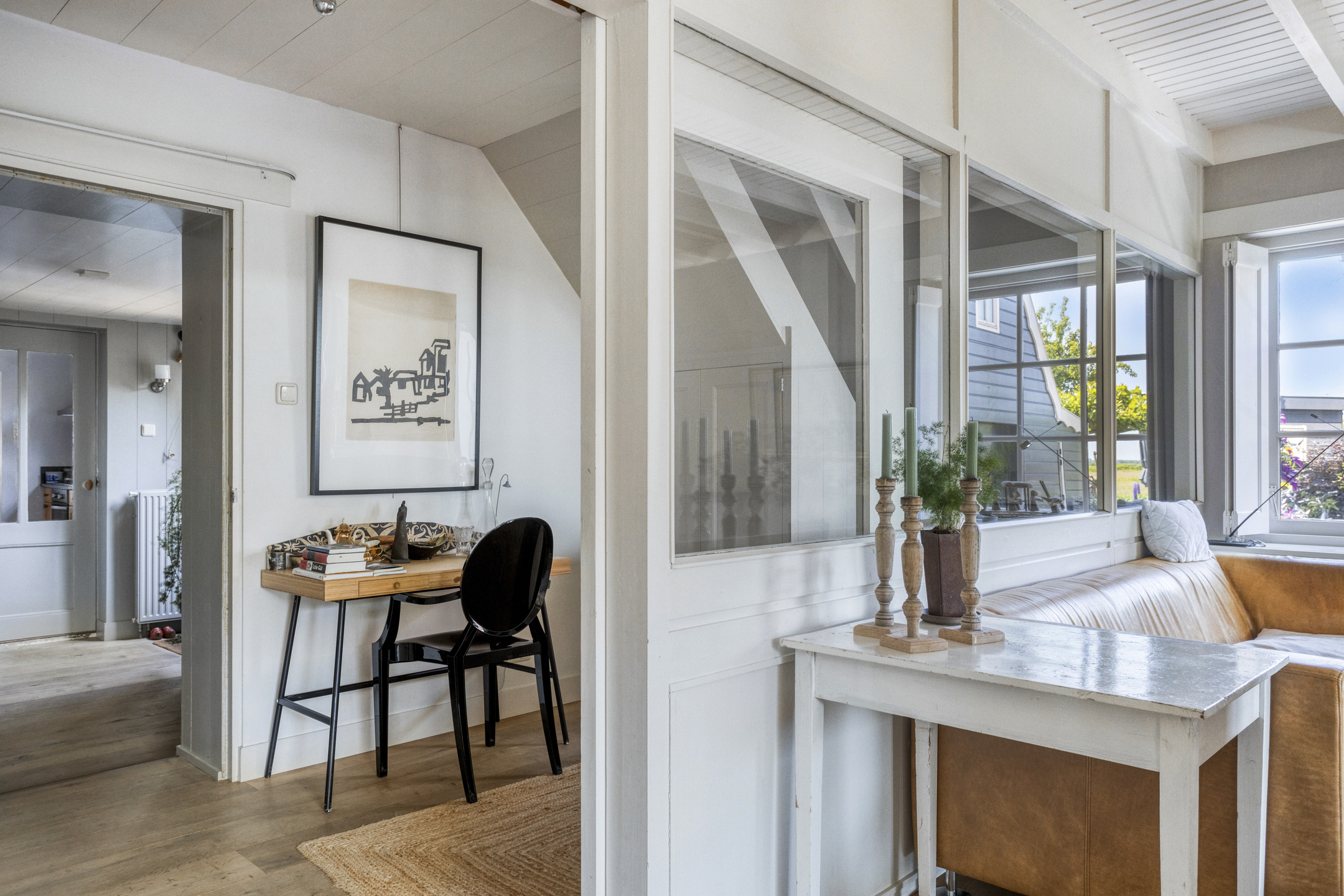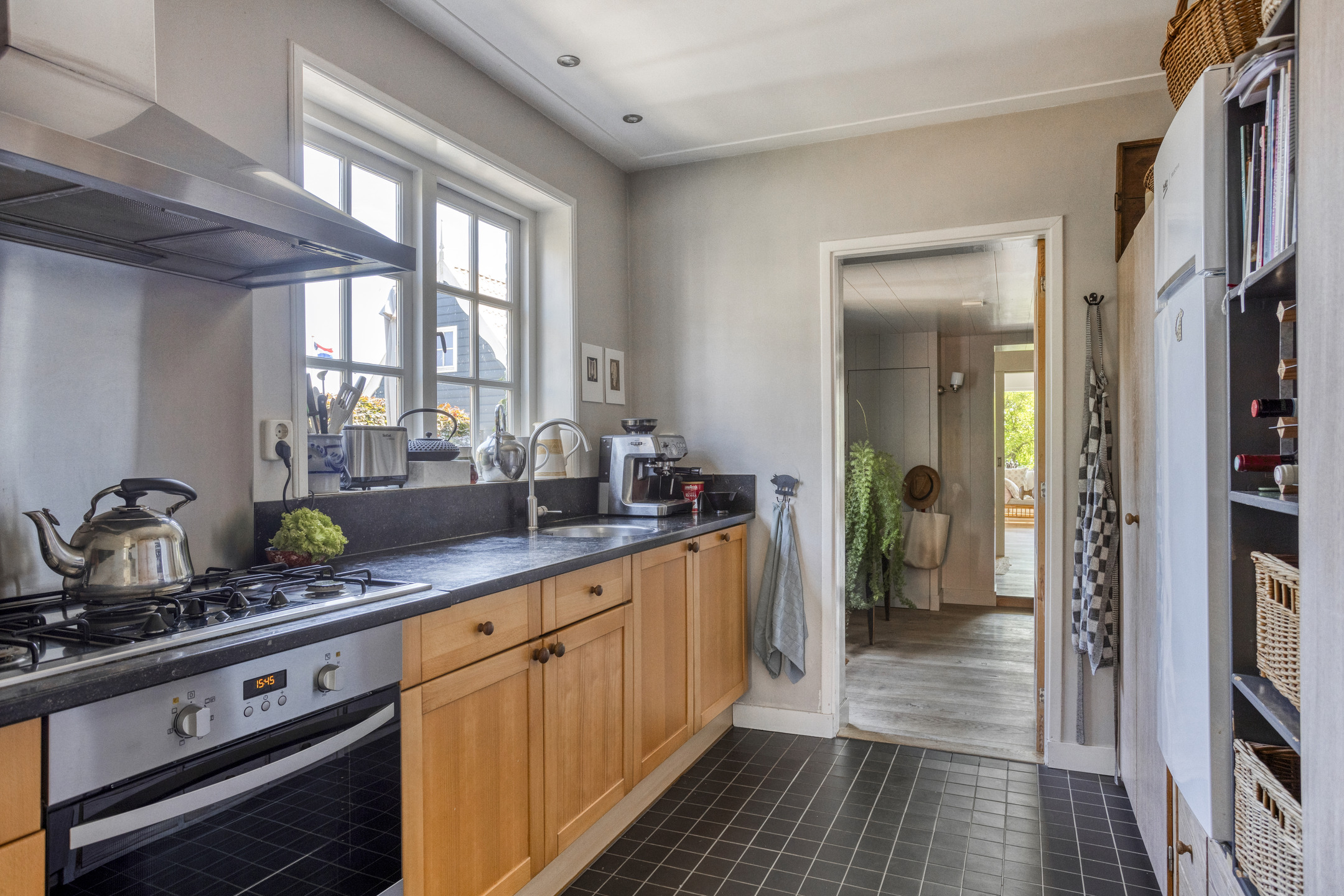 Through the front door, you enter a hallway that leads to the front house. At the front is the semi-open kitchen, equipped with a 5-burner gas hob, oven, dishwasher, and a freestanding fridge-freezer. Adjacent to the kitchen is the cozy dining room with beautiful light from the large windows, forming the warm heart of the home. Next to the dining room is a comfortable living room, which can easily switch functions with the dining room if desired. From the dining room, a staircase also leads to the first floor of the front part of the house.