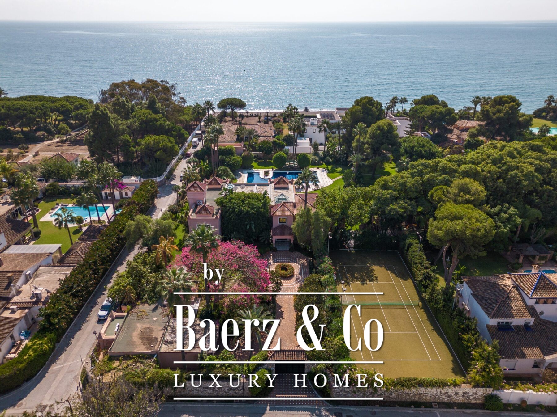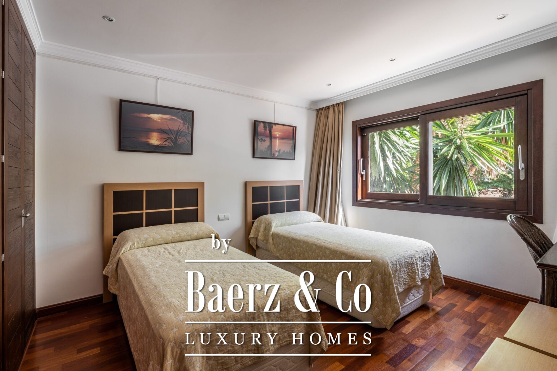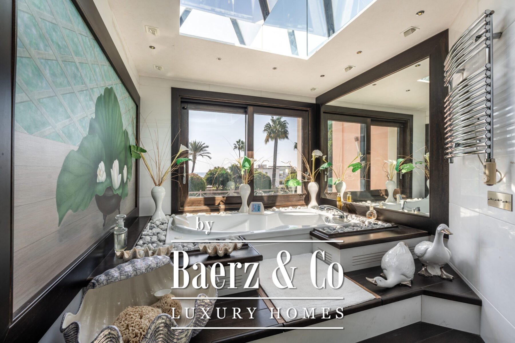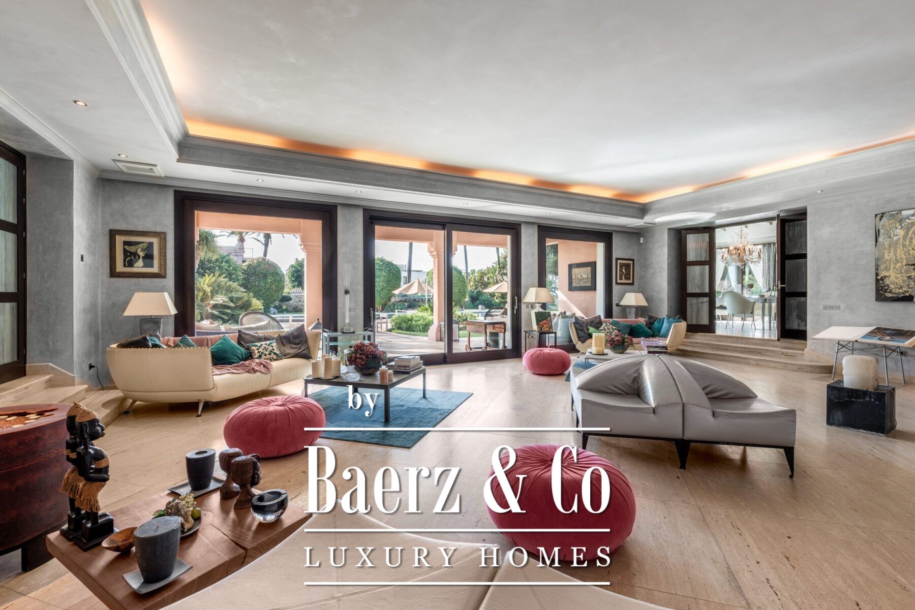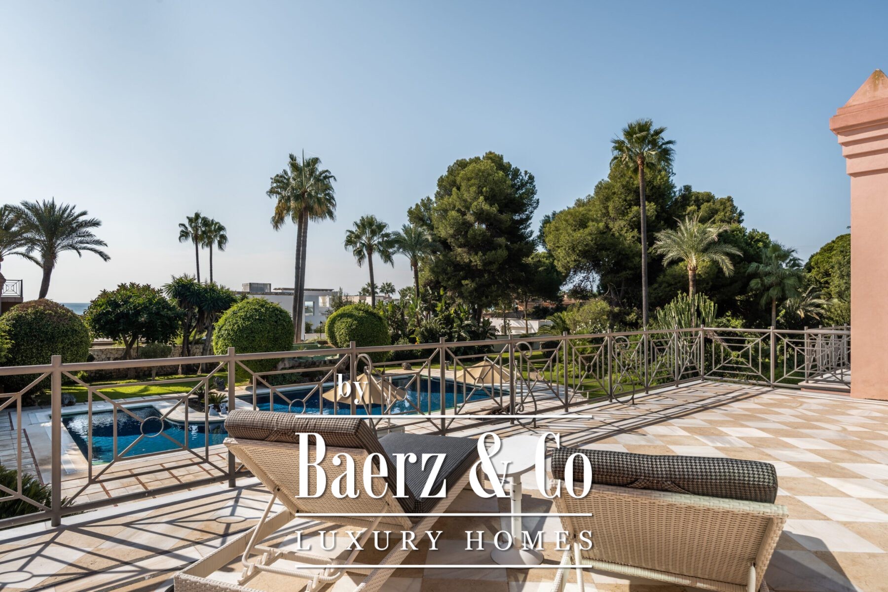 Villa Estepona is a rare offering in one of the Costa del Sol’s most sought-after enclaves. This expansive property, set on a 7,415 m² plot, reflects a refined vision of Mediterranean life with unobstructed sea views. Designed for both privacy and grand-scale entertaining, the main residence encompasses 748 m² across two levels, complemented by a 158 m² guest house and a 164 m² caretakers’ house. With eight bedrooms and eight bathrooms at the heart of the estate, a cinema room, sauna, gym, and stylish kitchen form the core of day-to-day comfort.