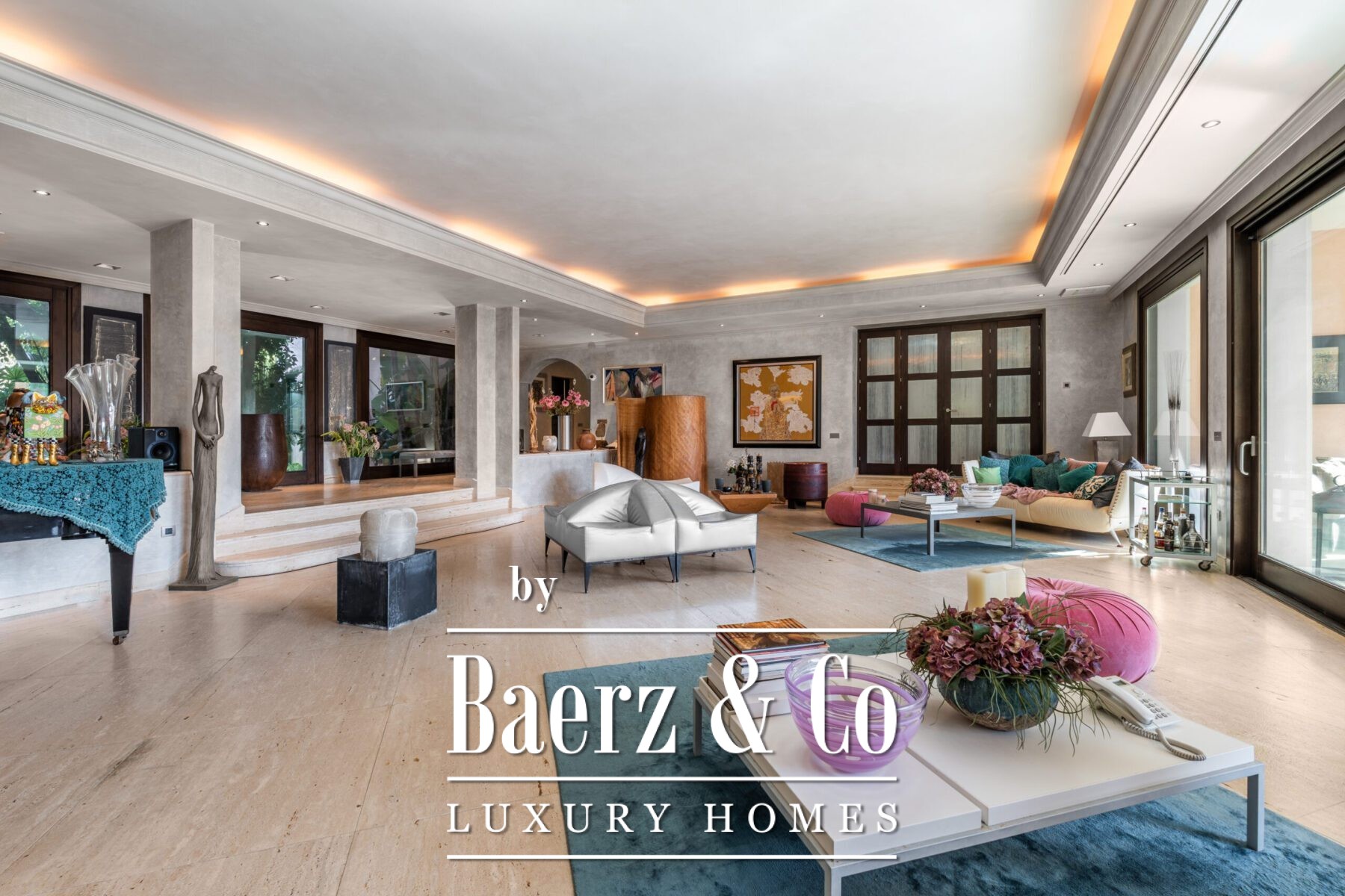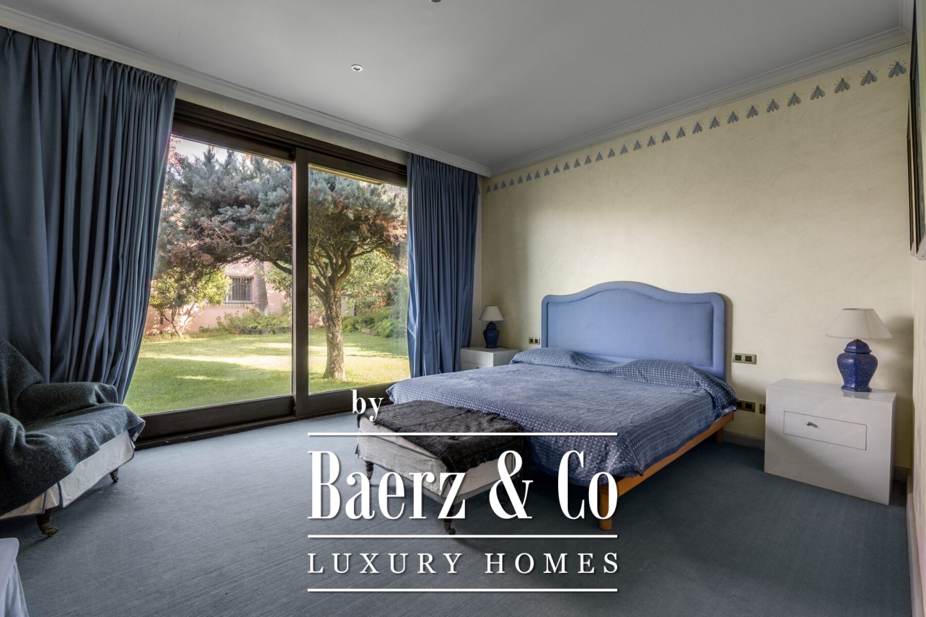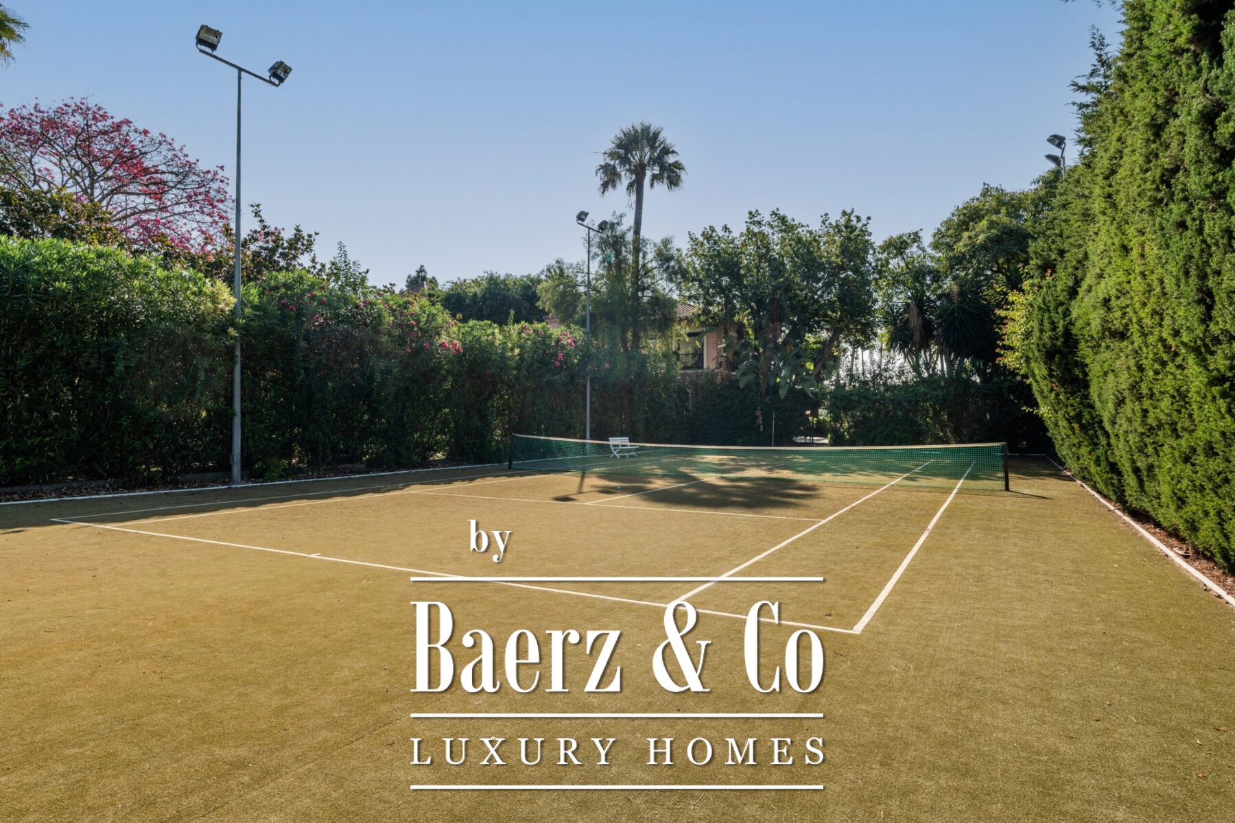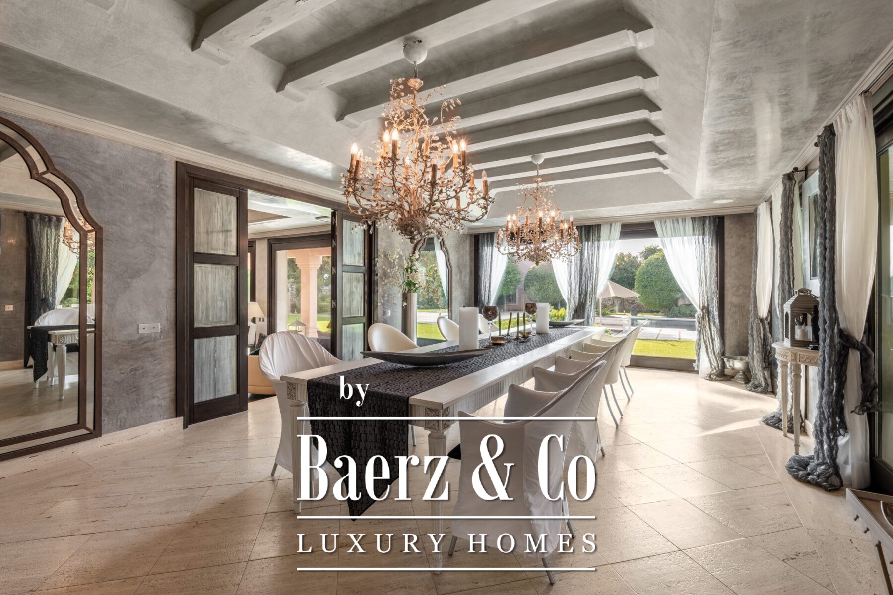 The living experience is extended outdoors, where manicured gardens frame a 25-metre private swimming pool with a waterfall, a tennis court, and an African lodge for al fresco gatherings. South orientation ensures natural light throughout, with spaces flowing seamlessly onto generous terraces. The villa’s integrated music system, wine cellar, security features including video monitoring and automated gates, and climate control heighten daily ease and peace of mind.