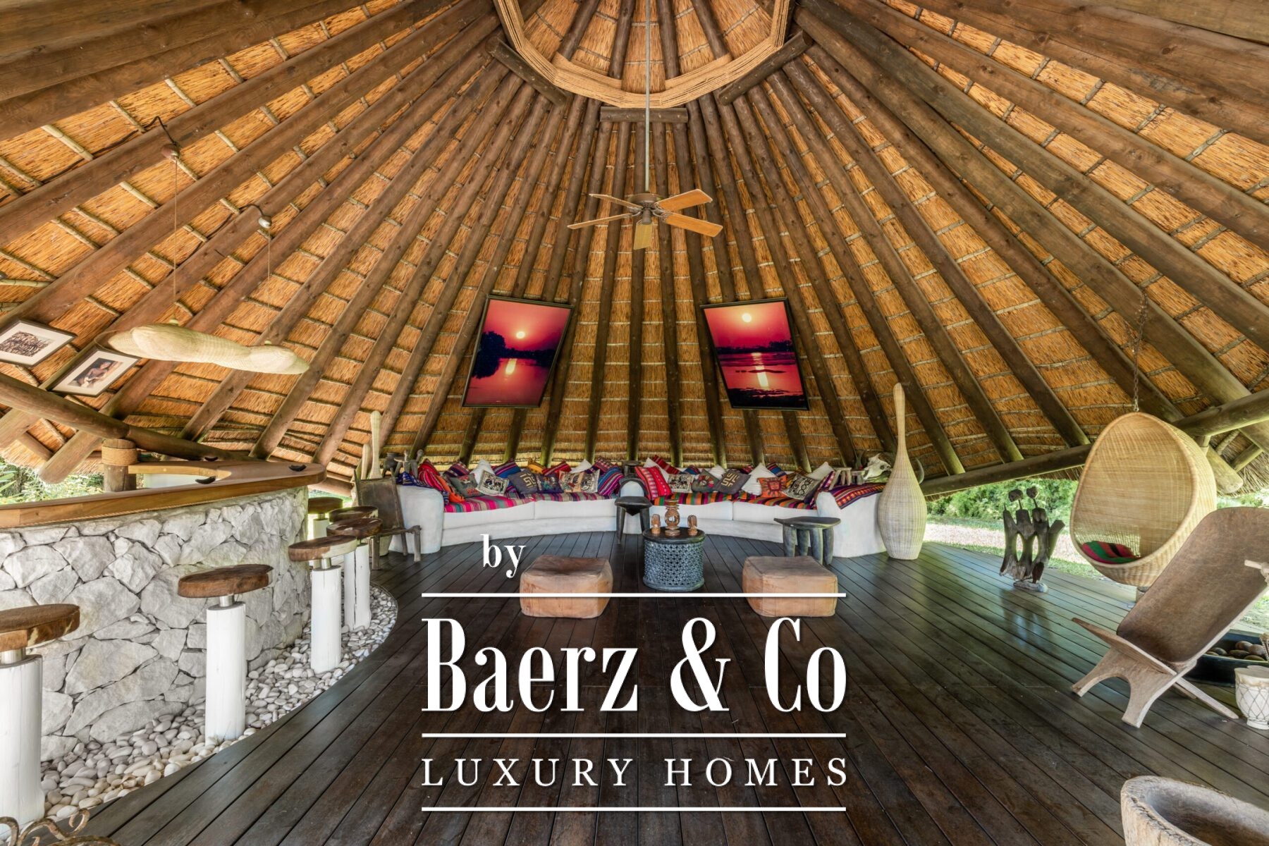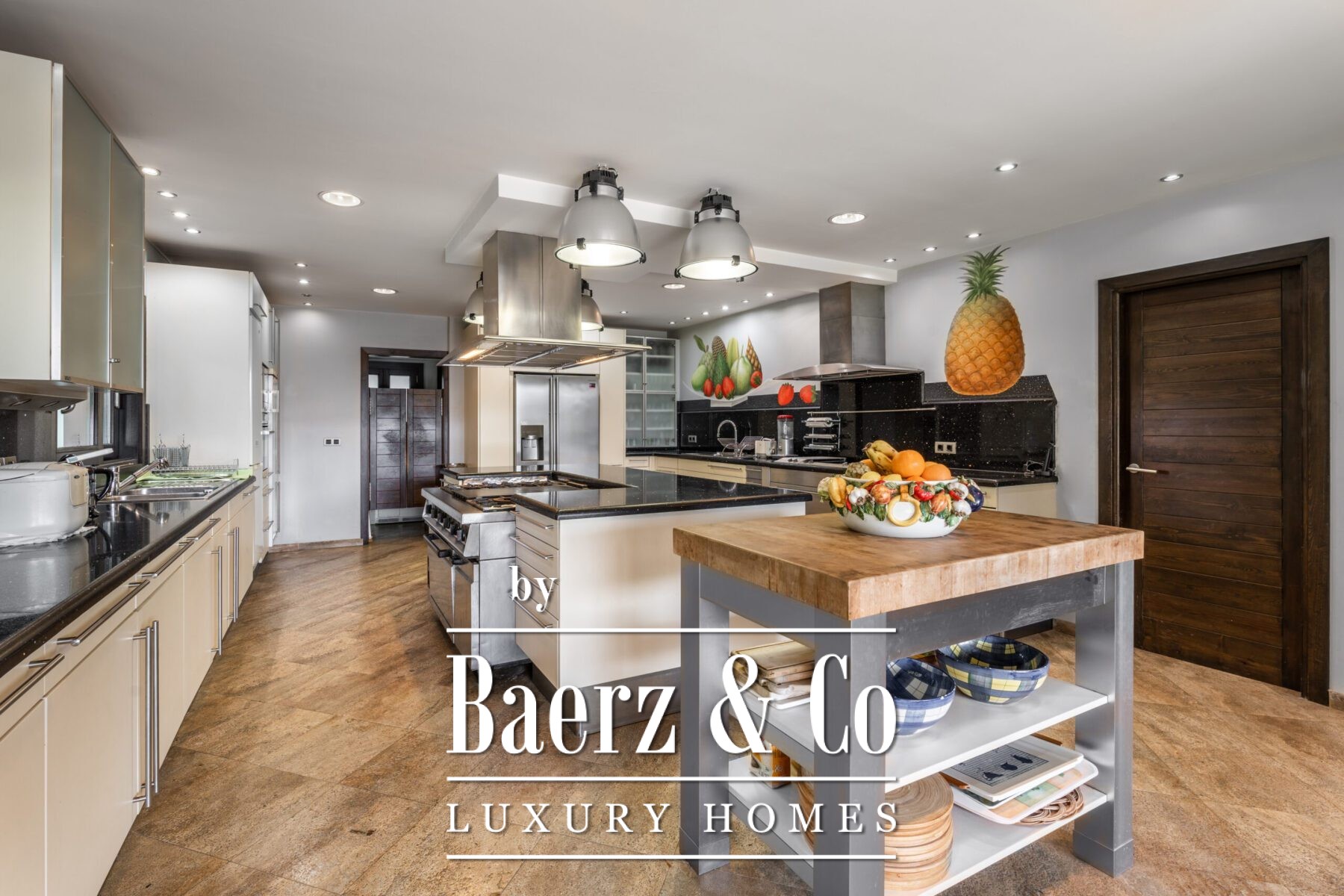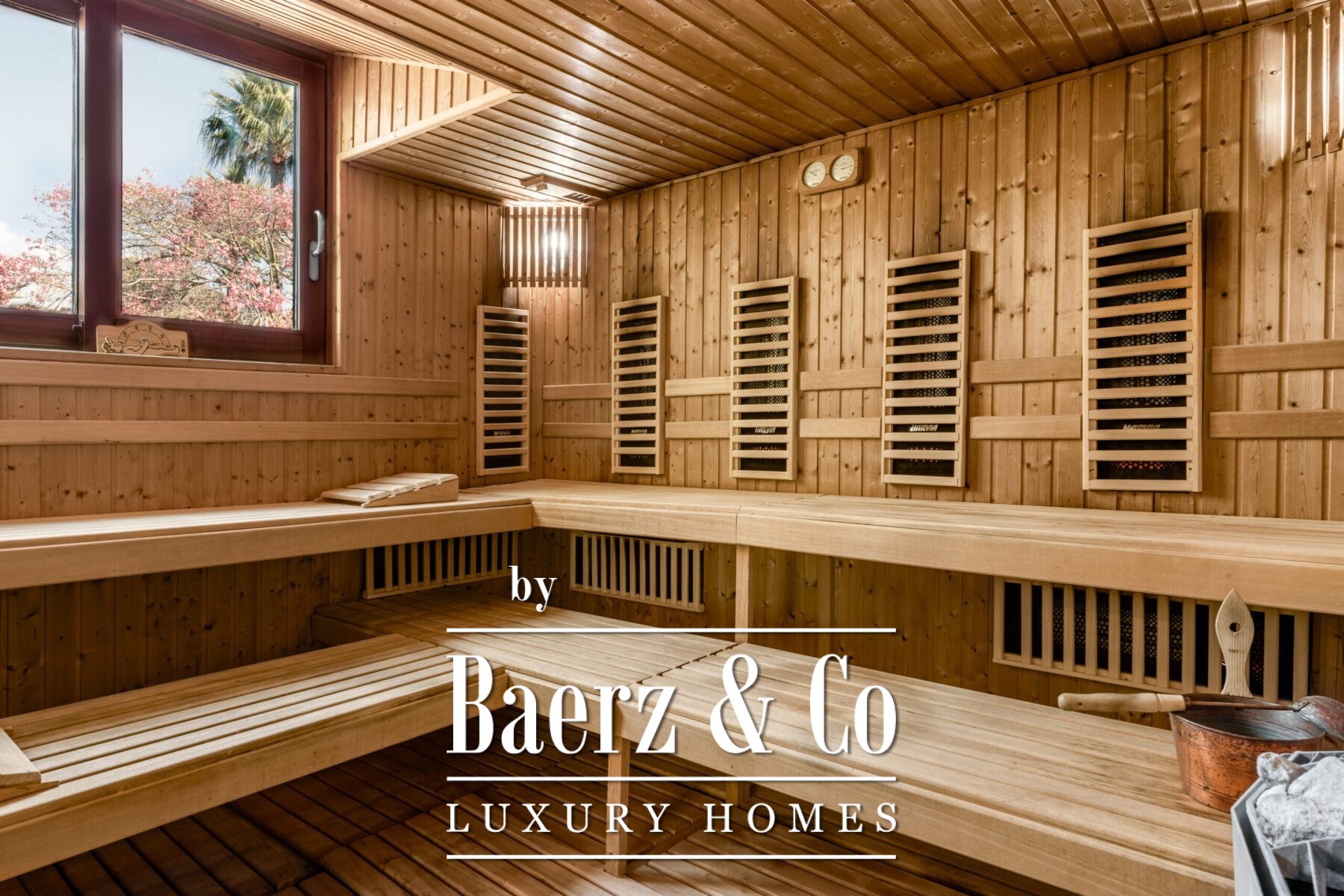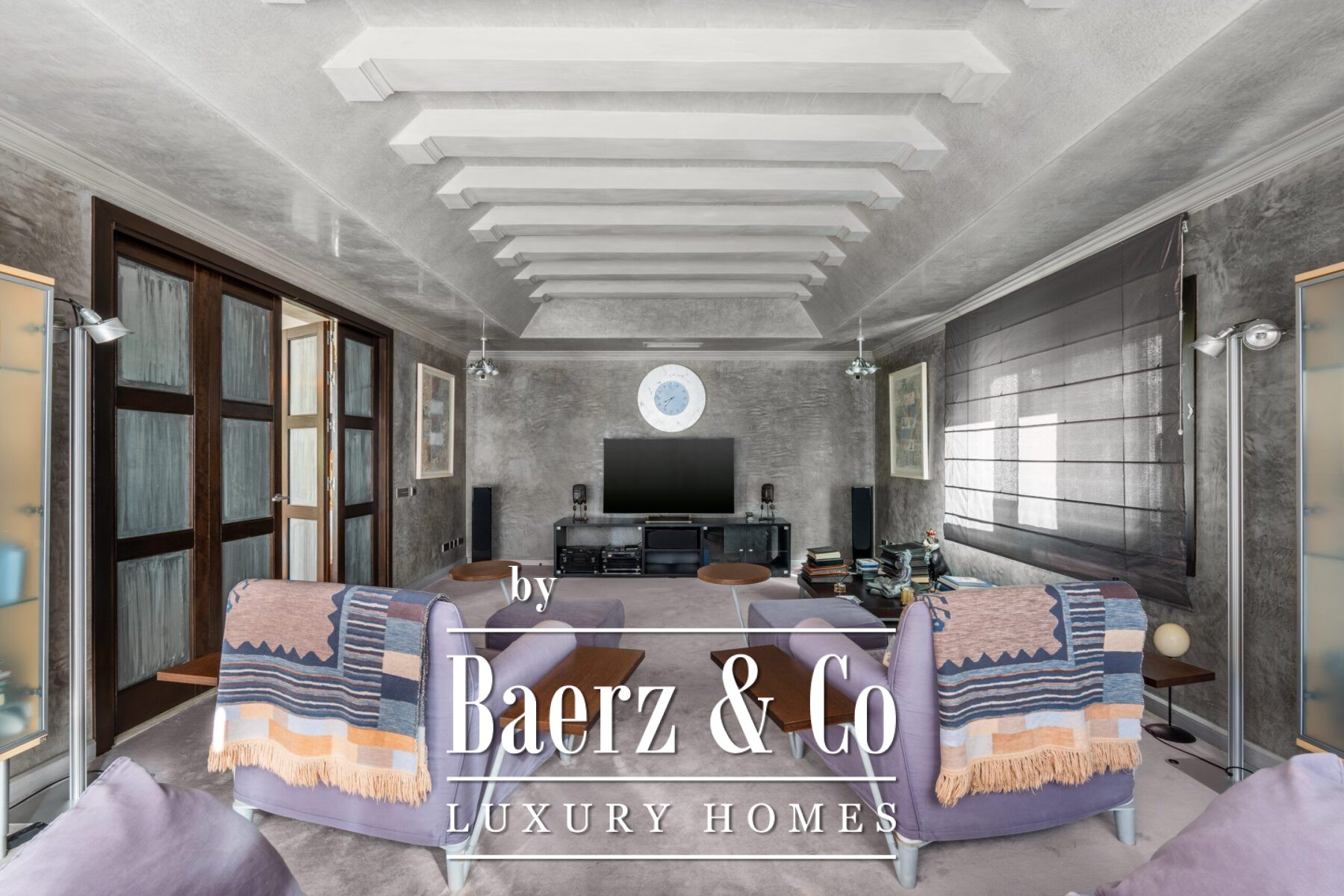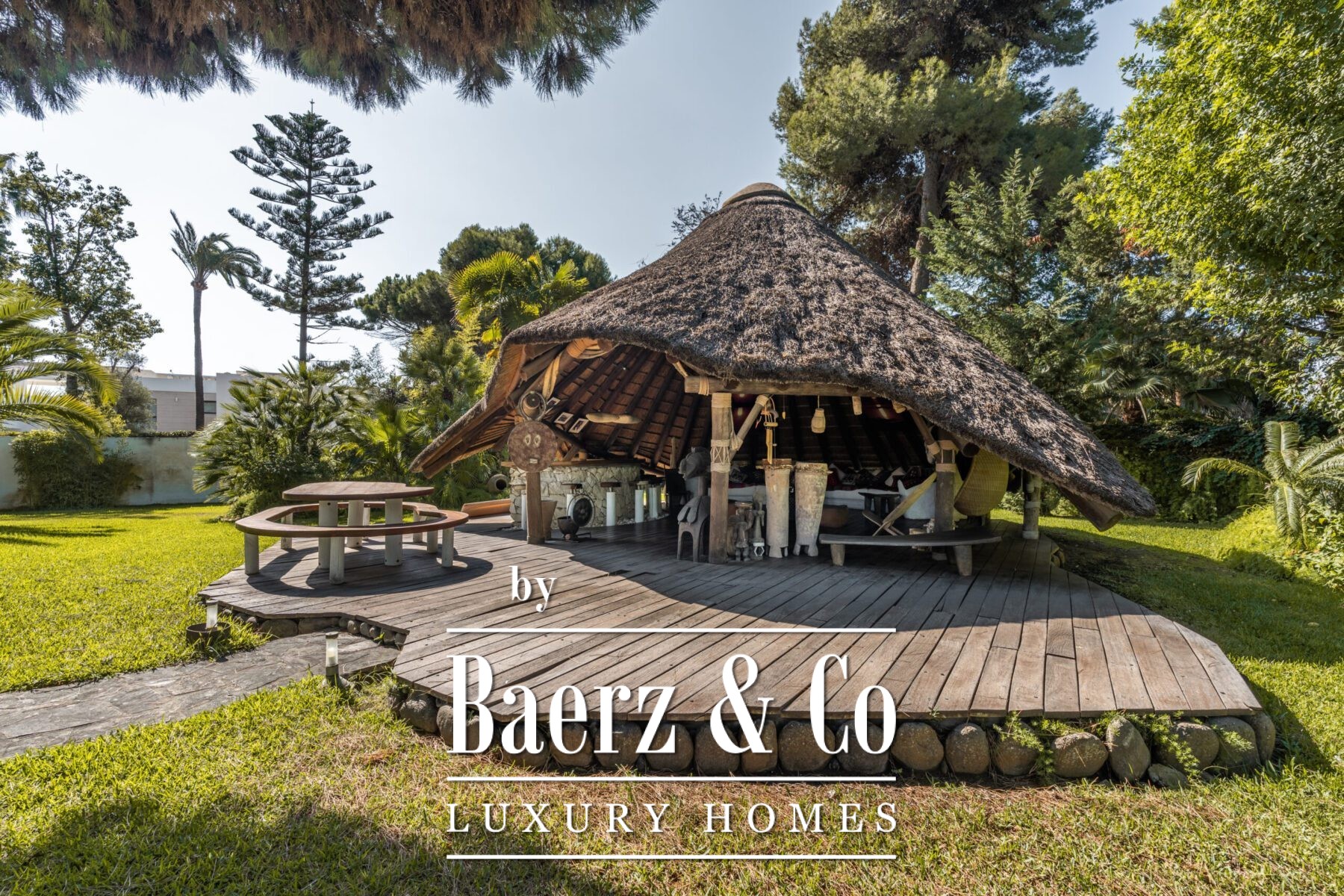 The living experience is extended outdoors, where manicured gardens frame a 25-metre private swimming pool with a waterfall, a tennis court, and an African lodge for al fresco gatherings. South orientation ensures natural light throughout, with spaces flowing seamlessly onto generous terraces. The villa’s integrated music system, wine cellar, security features including video monitoring and automated gates, and climate control heighten daily ease and peace of mind.