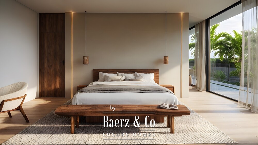 Upstairs, four further bedrooms each feature en-suite bathrooms and built-in wardrobes. The master suite is distinguished by a dedicated dressing area, a serene designer bath, and a terrace granting open views. Throughout, finishes blend natural stone, wood, and large-format ceramics, while glass and exposed concrete articulate the façade’s restrained modernity.