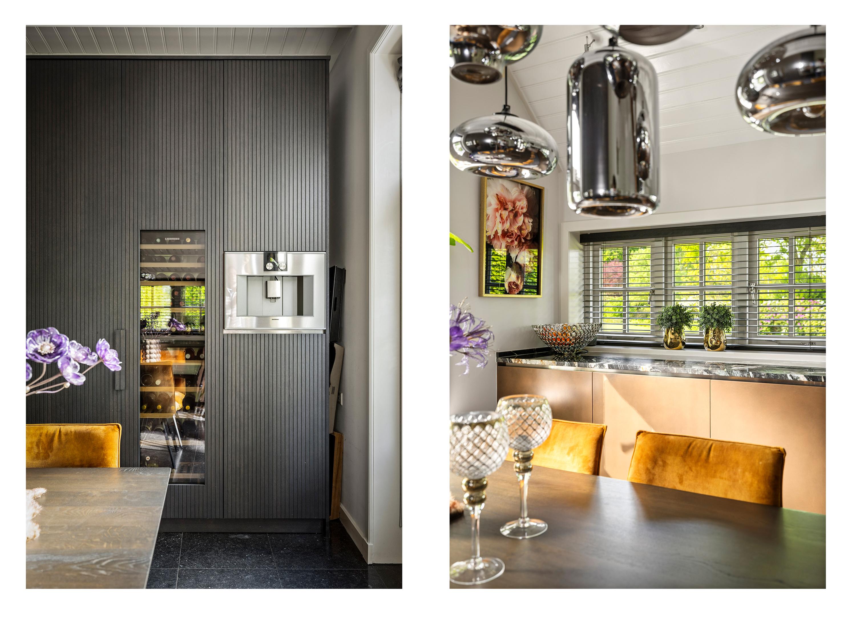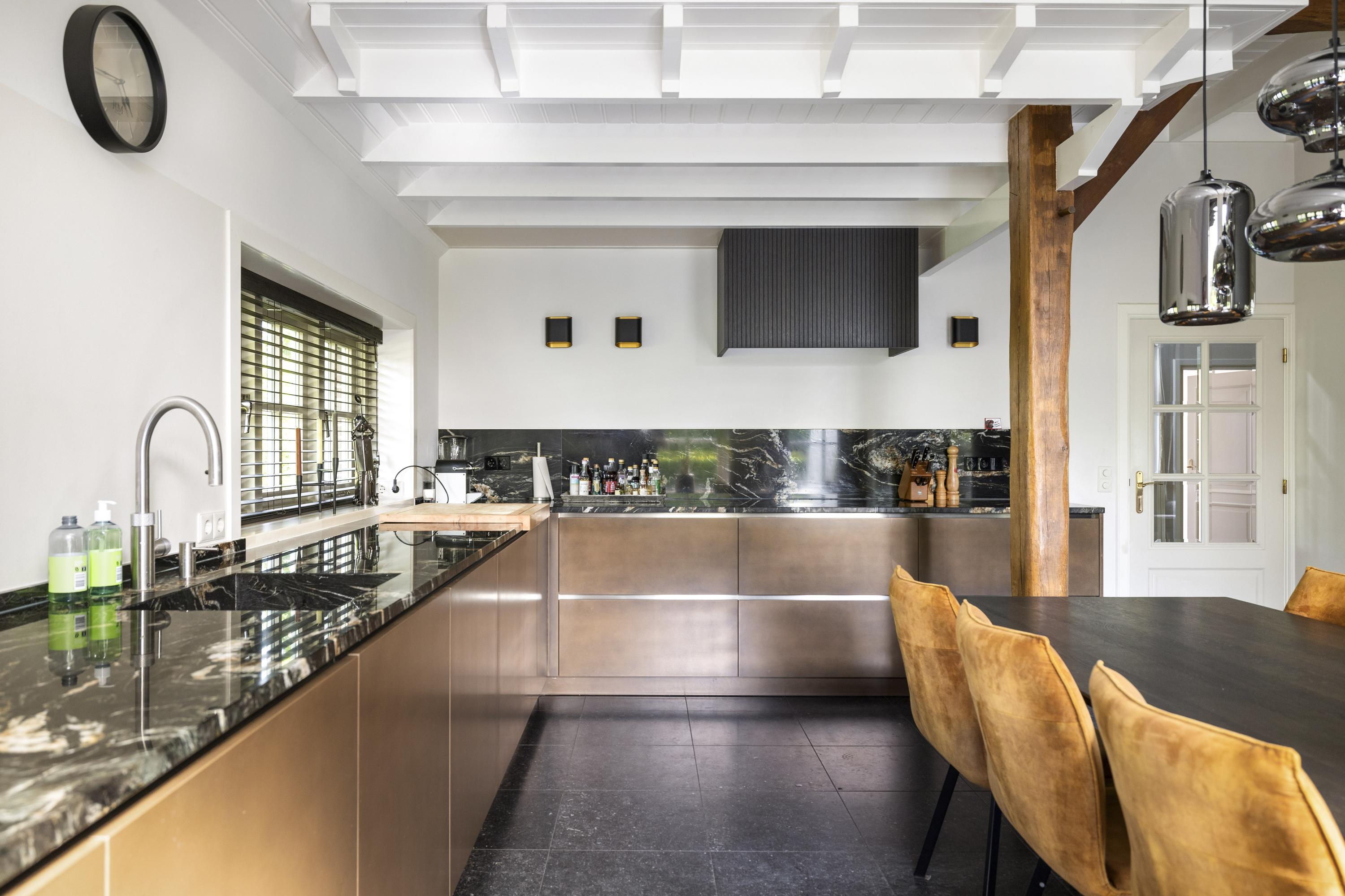 The fronts are copper-colored, which creates a beautiful interplay with the marble countertops and the sleek appliance wall. The kitchen is equipped with built-in appliances such as a dishwasher, refrigerator, and freezer. Furthermore, there is an induction hob (90 cm), a coffee machine (Gaggenau), a 4-in-1 boiling water tap (Quooker), and a generous wine climate cabinet (Liebherr).