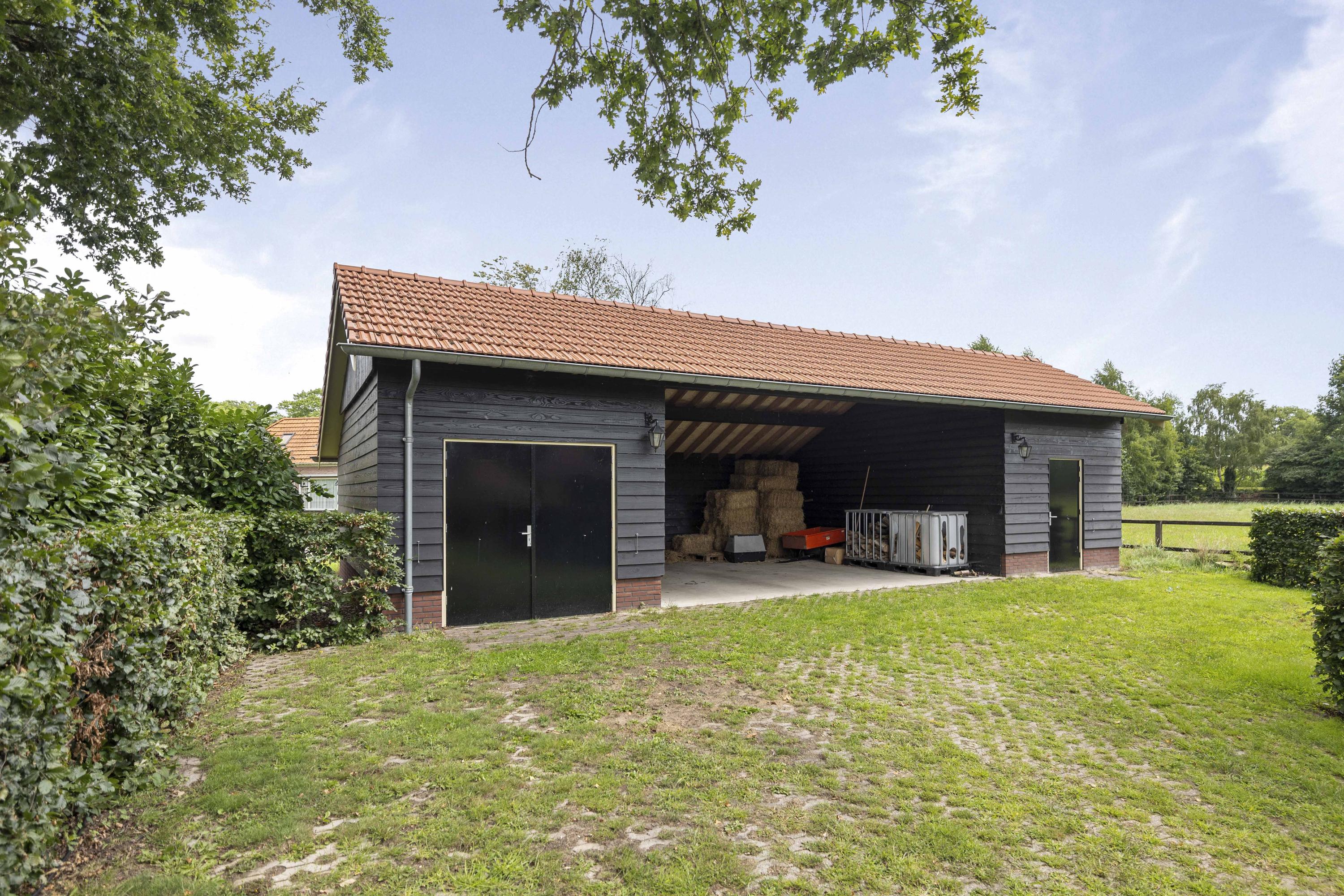 This country house is designed for keeping horses. The stable complex is therefore magnificent! At the front is the space for motorized horsepower: the large garage (56 m²) with double, electrically operated roller doors. From the garage, there is access to the spacious attic (30 m²).