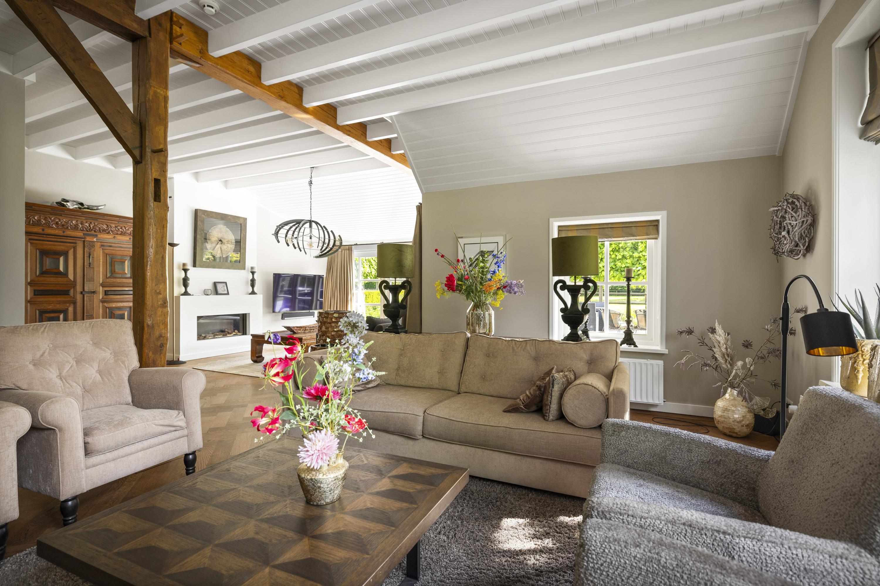 On the right is the kitchen, the beating heart of this house. The design is truly beautiful: traditional craftsmanship by Lodder Keukens from Barneveld, equipped with all modern conveniences. Every door, drawer, and function has been carefully considered. The kitchen has an L-shaped layout and is very spacious, so there is plenty of work space and room for all your guests at the large dining table.