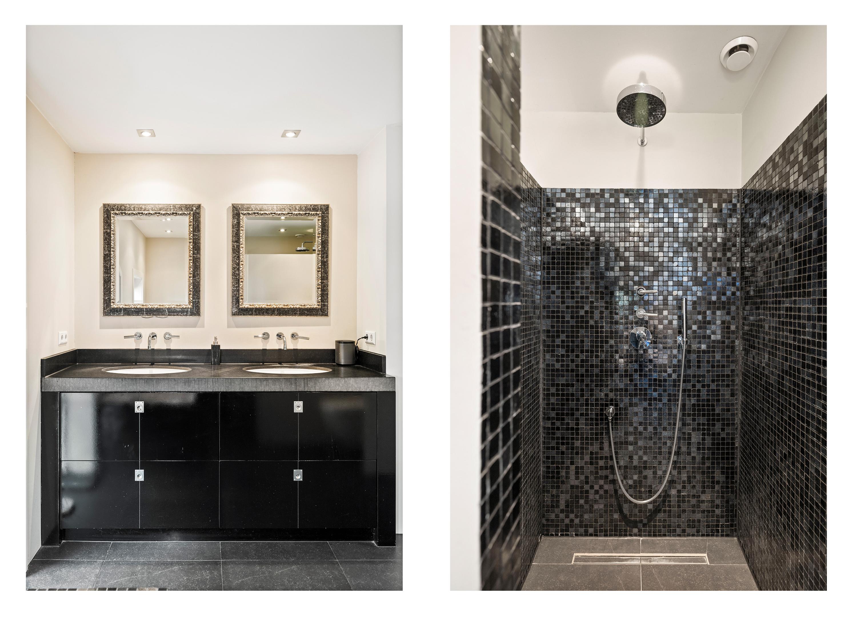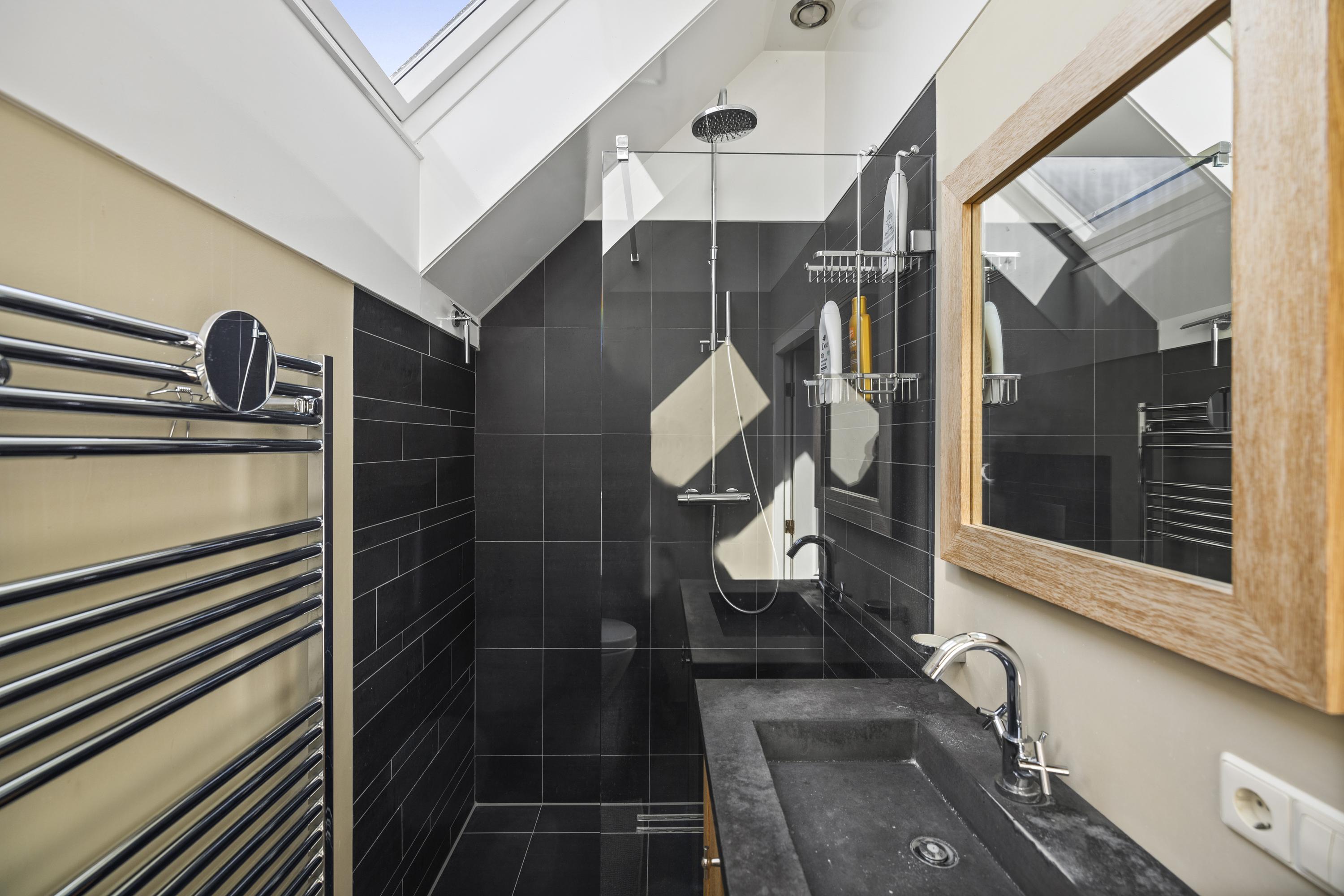 On the left side of the house is the bedroom with bathroom on the ground floor. The former barn doors have been filled with glass and offer a view of and access to the garden and stables. Adjacent is the beautiful bathroom, with a double bathtub, spacious walk-in shower with rain and hand shower, a toilet, and a beautiful double sink.