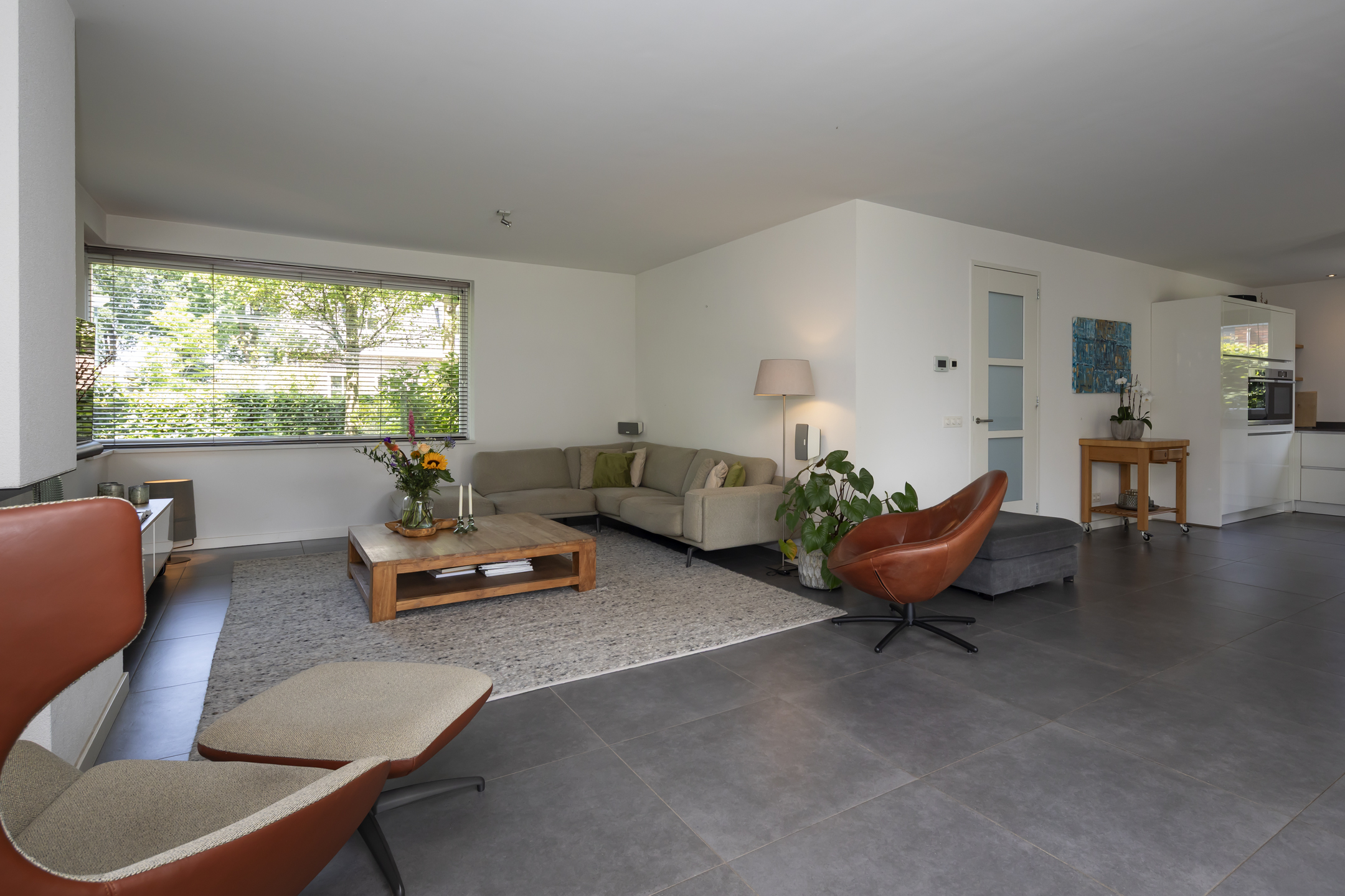 Cooking enthusiasts will be in their element here! This luxurious kitchen is equipped with a convenient Quooker, a steam oven and a convection oven, a refrigerator, and a dishwasher. The island has a 4-burner gas cooktop and a wok burner, and the extractor hood is integrated into the ceiling. The kitchen features a beautiful composite countertop and offers ample work and storage space thanks to the wide drawers and cabinets. It is handleless and finished in high-gloss white, which contrasts beautifully with the floor. While you're cooking, you can still enjoy the company of others at the table and not miss a thing.