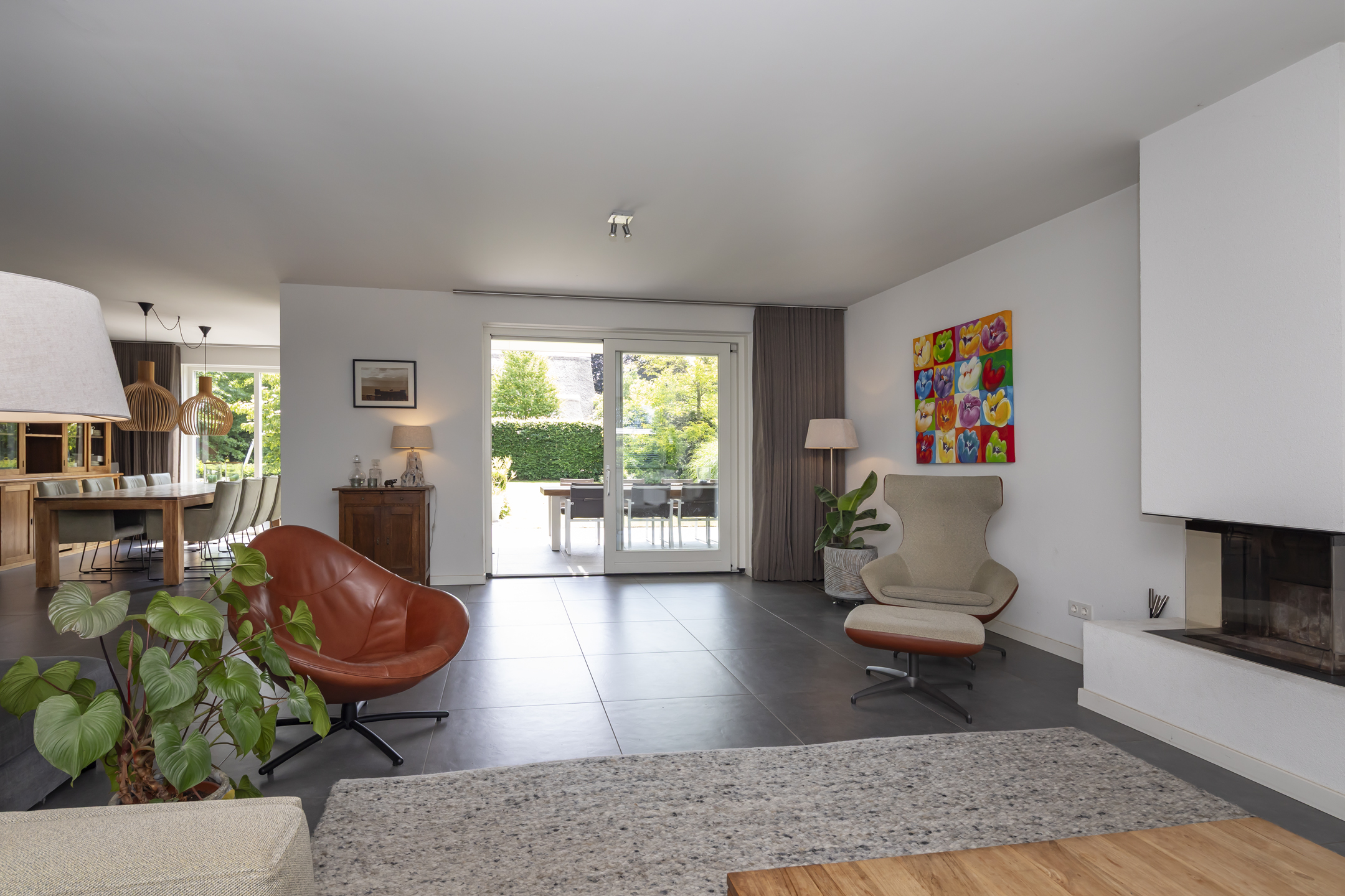 The dining area is also beautifully spacious. While seated at the table, you can enjoy the view of the beautiful garden. Double patio doors in the dining room open onto the generously sized covered terrace.