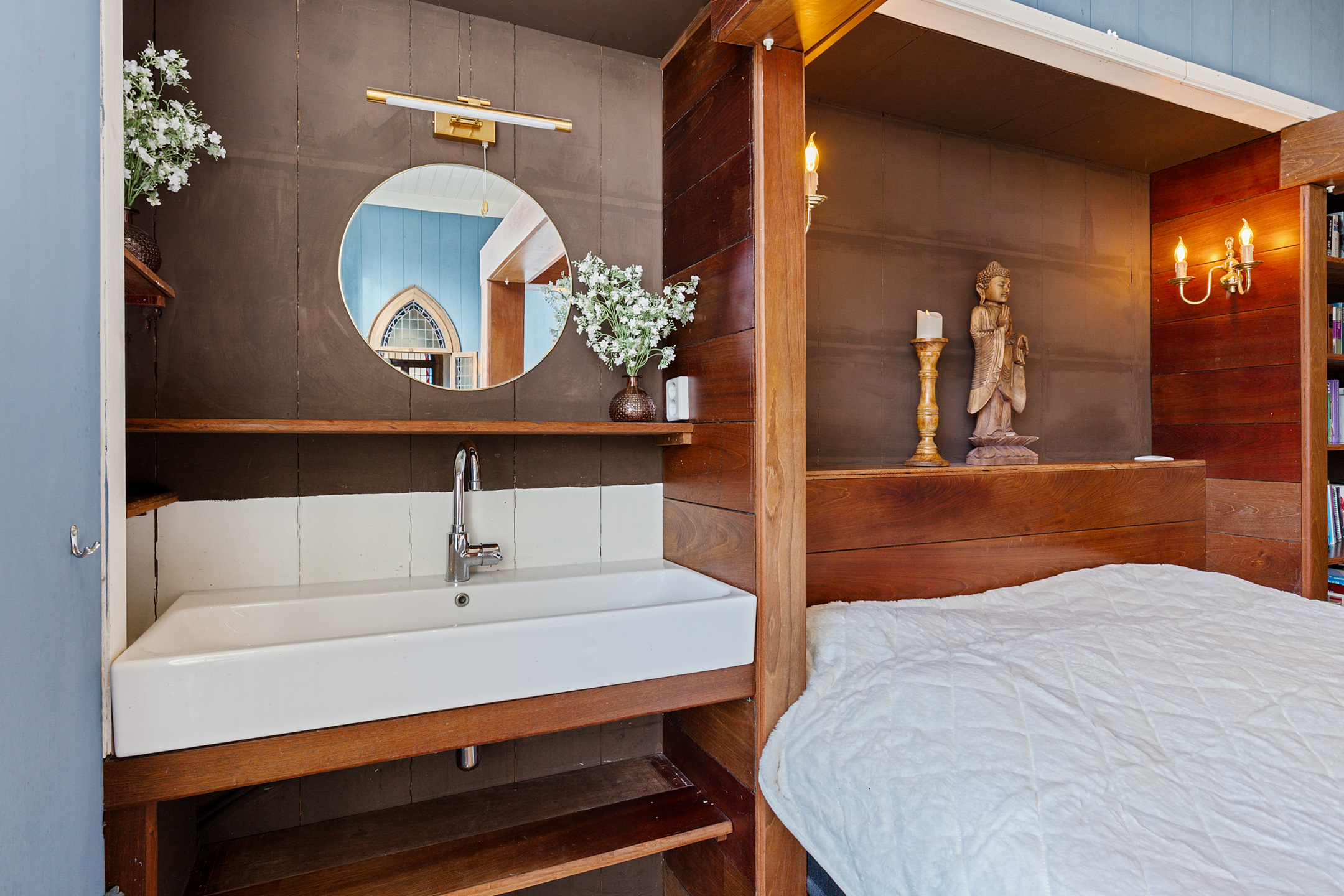 The rear room now a practice space is playfully arranged with a mezzanine and a treatment room below. From here there is access to the chapel, a transitional space with an original decorative niche in the side wall.