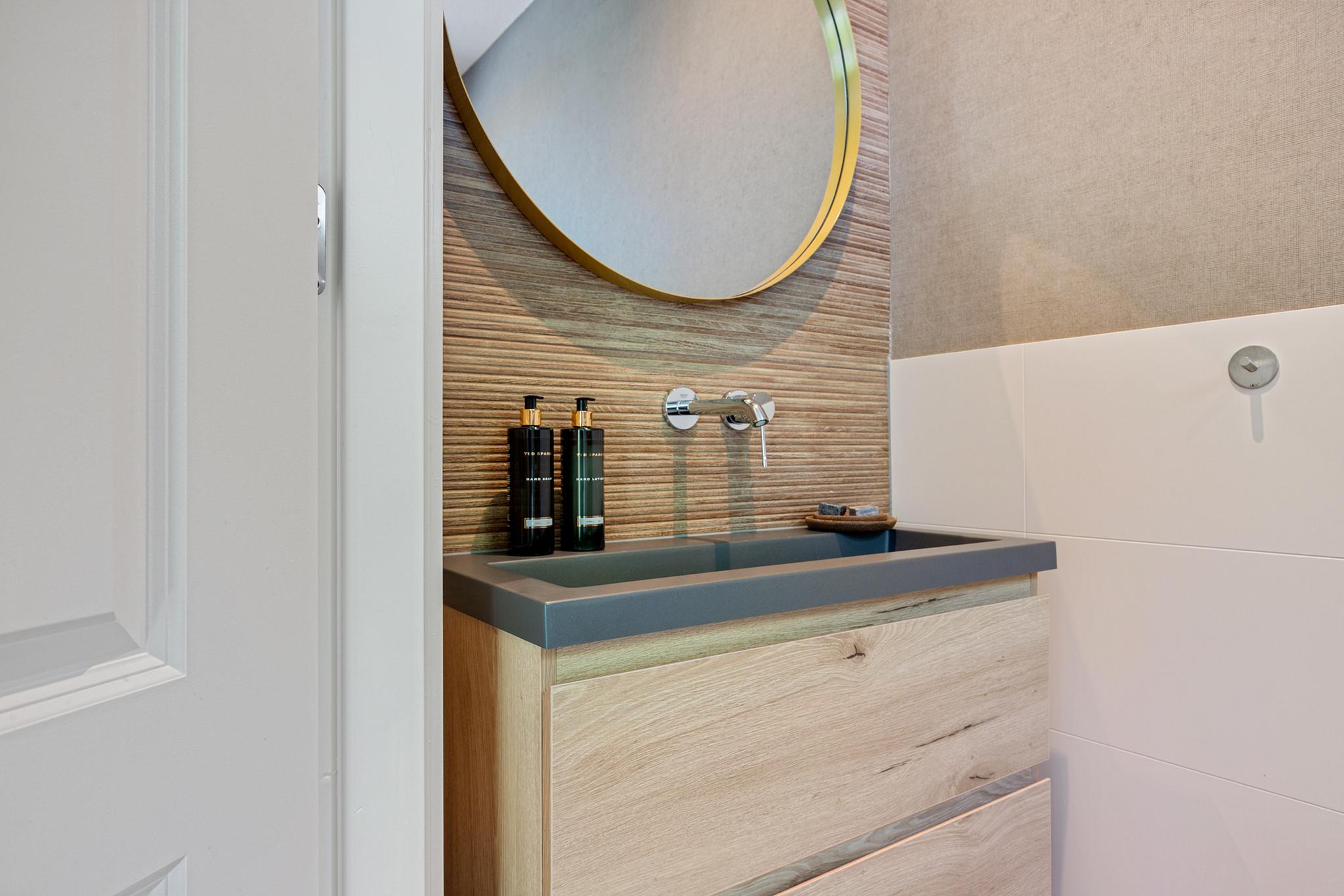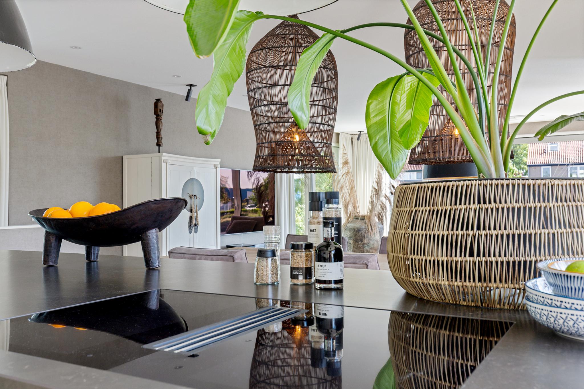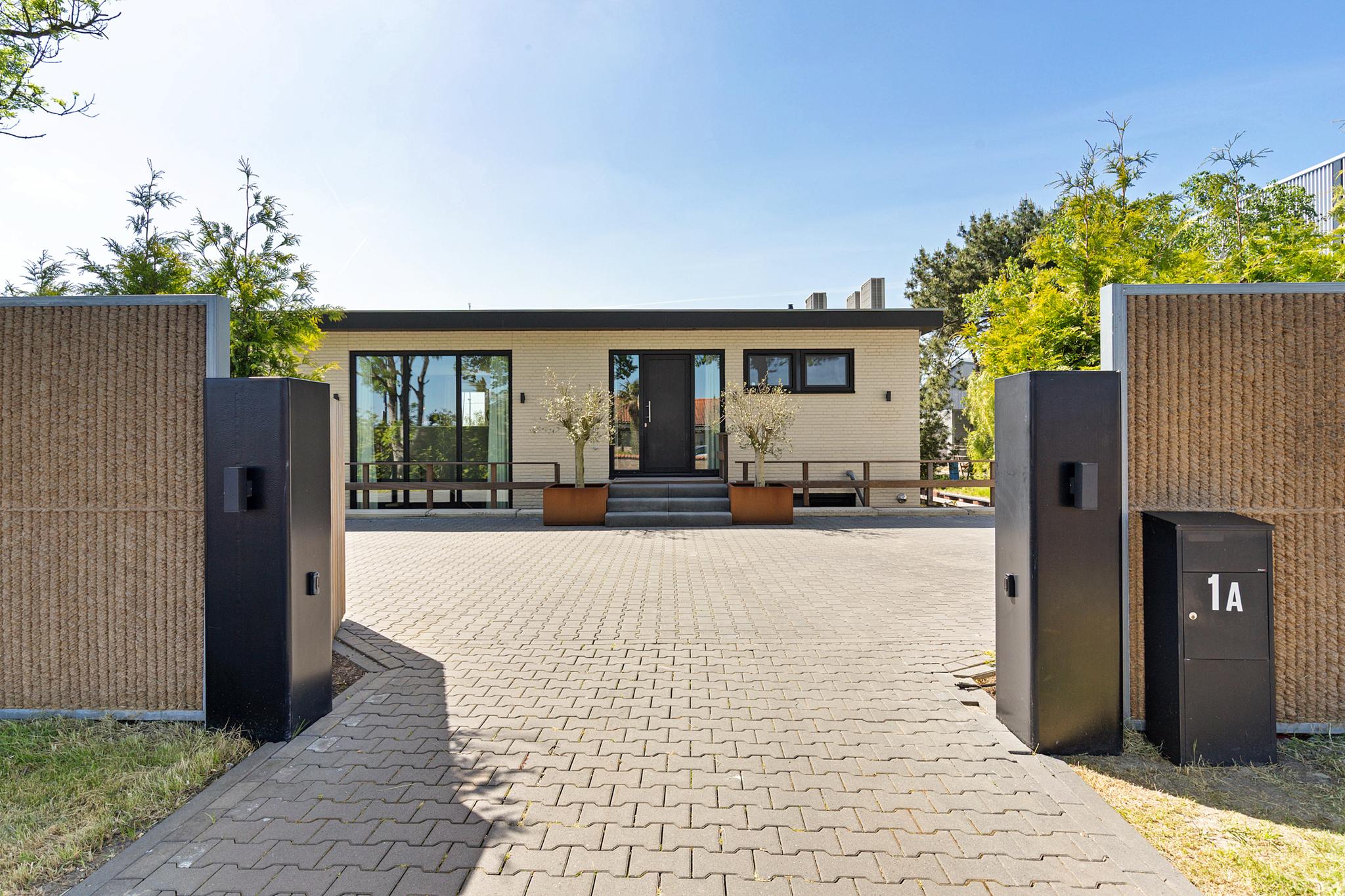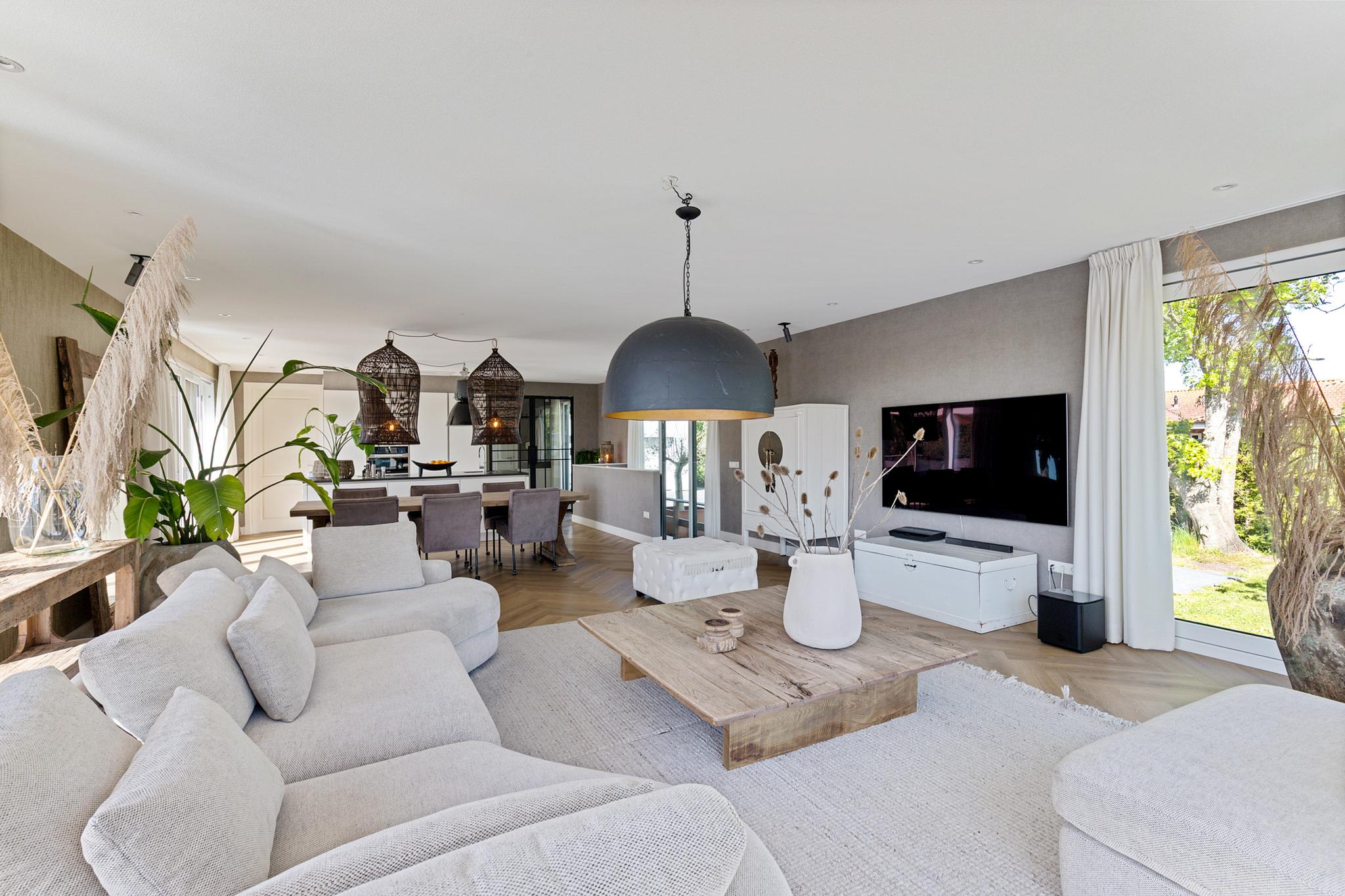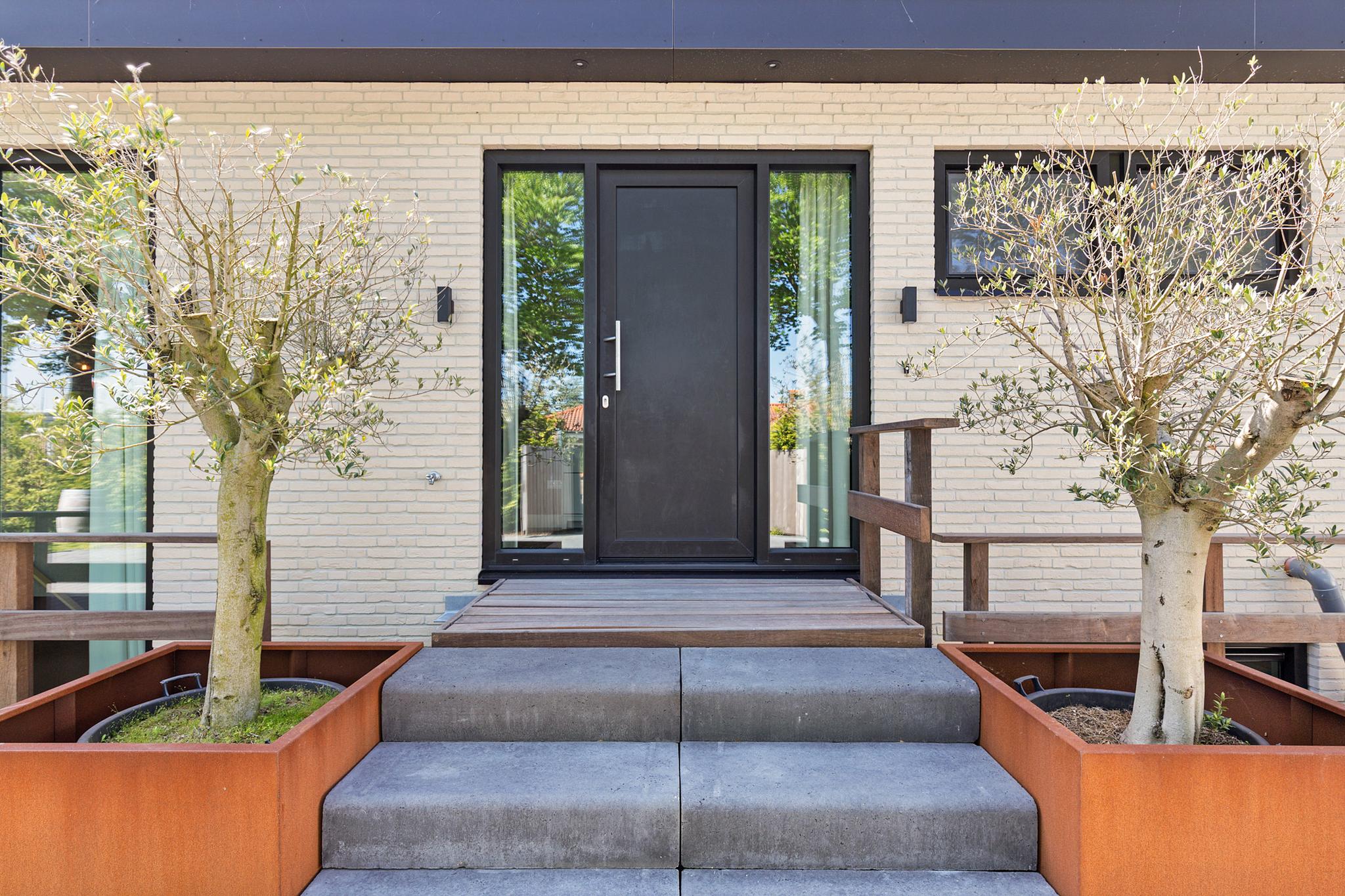 The entire plot is enclosed by a stylish maritime-themed fence and an electric gate. The southeast-facing garden is professionally landscaped with mature (fruit) trees, lush lawn, and vibrant flowering borders. It's a haven for birds, from snipe to jays—there’s even a duck nesting in one of the planters by the waterside terrace.