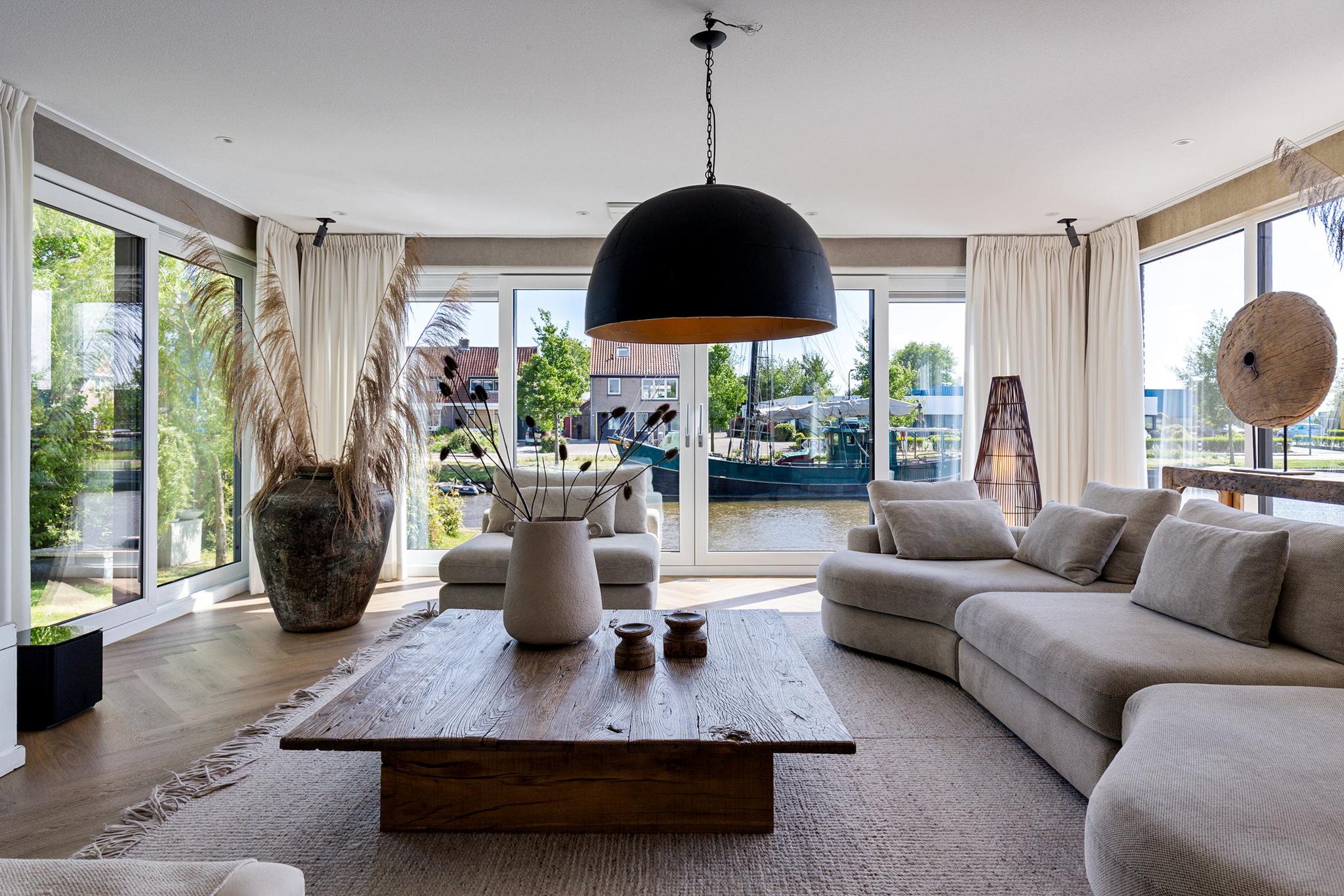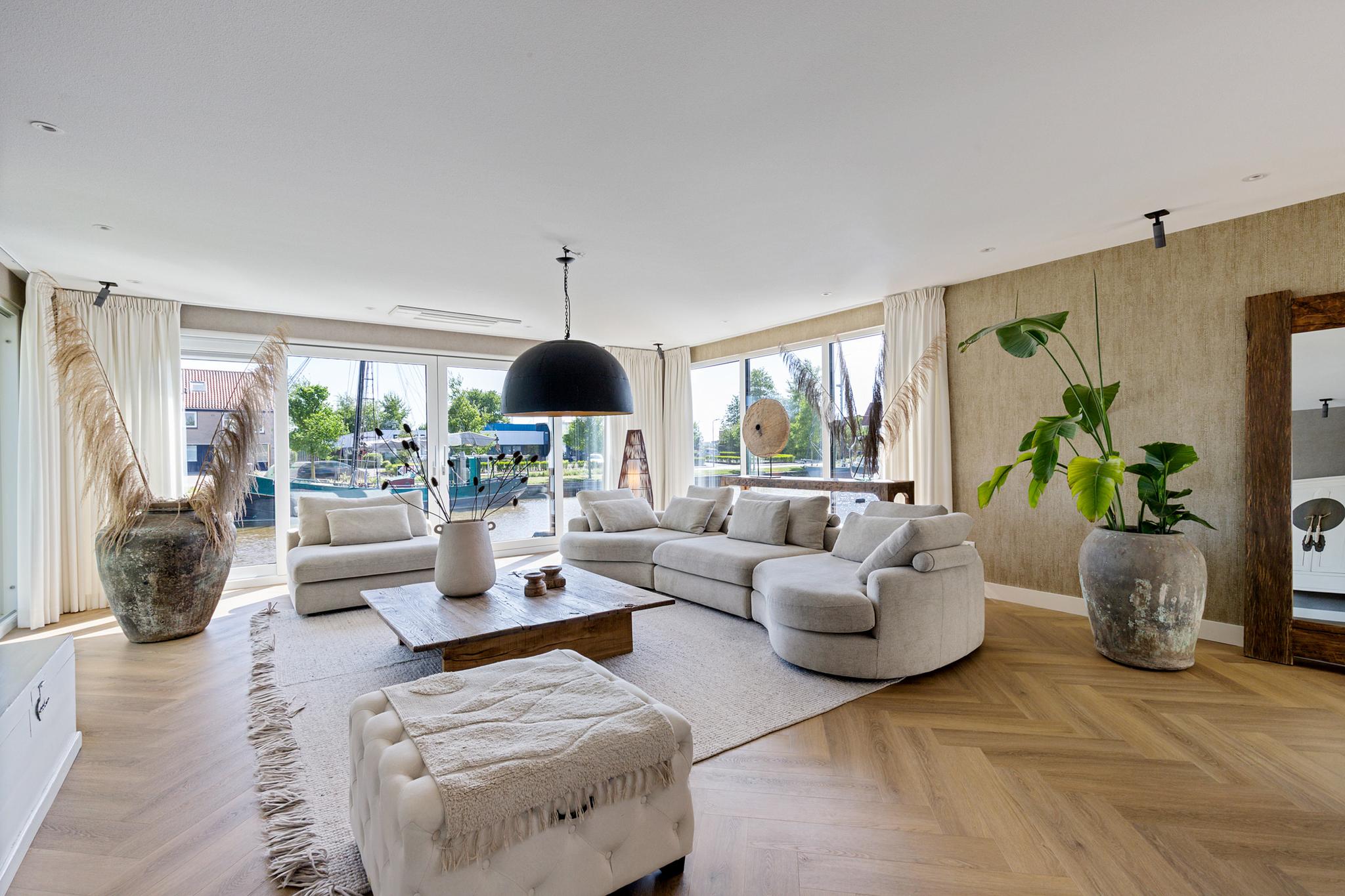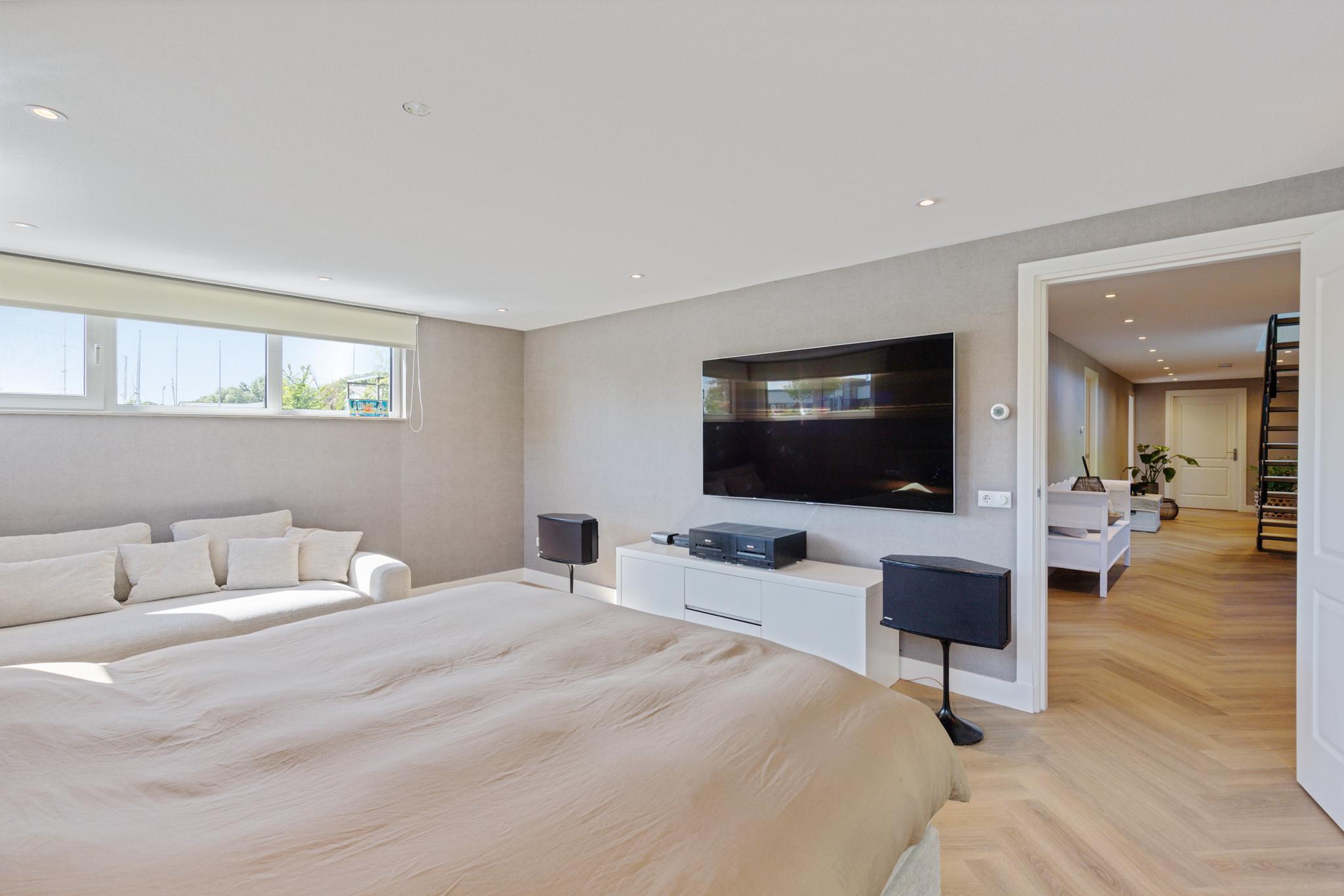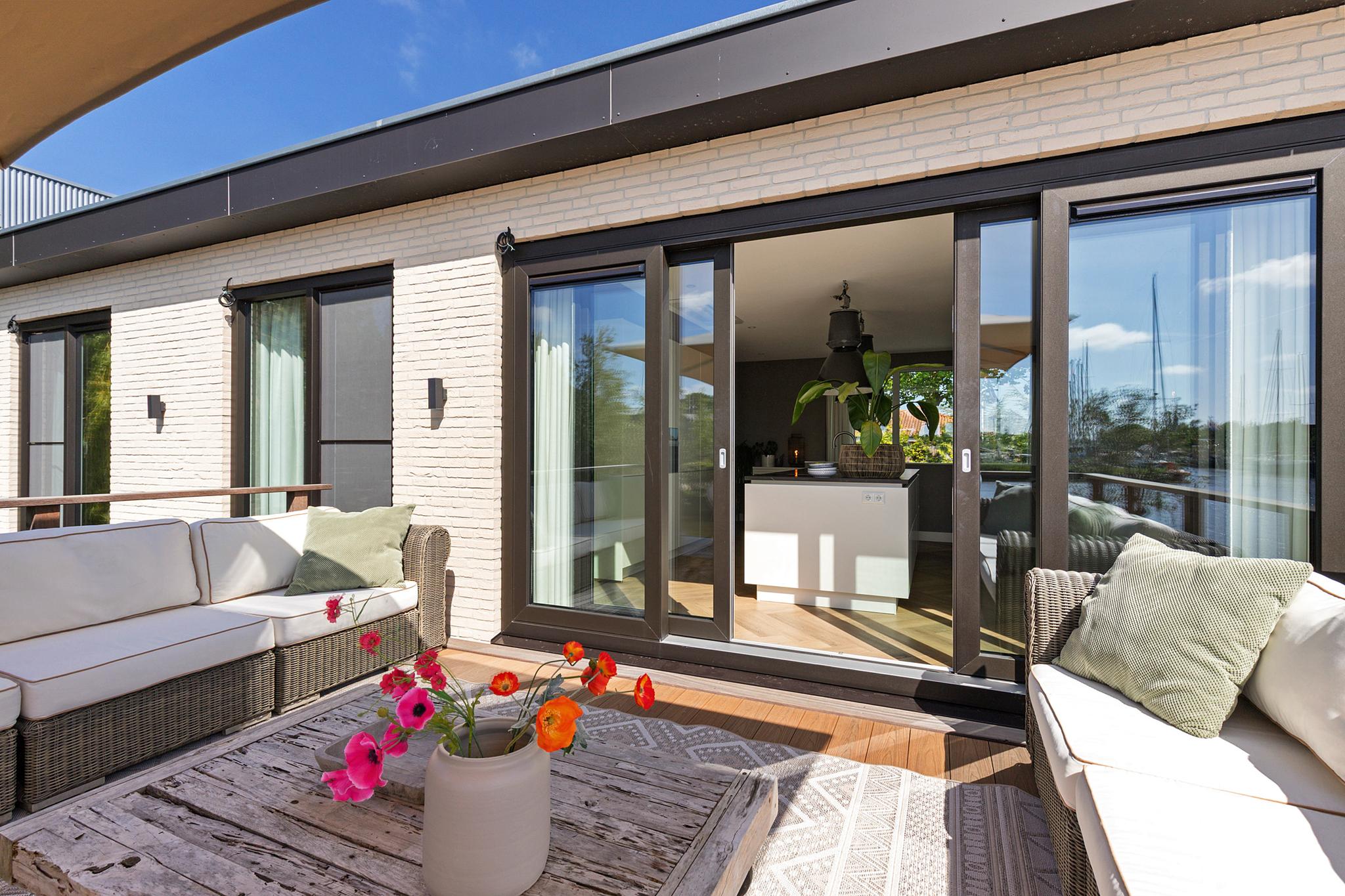 The west-facing sundeck, accessible from the open kitchen, provides a sheltered spot to enjoy life on the water. It’s the perfect place to sit back and watch boats pass by. A spacious private berth alongside the villa accommodates a sailing or motor yacht. The location lies directly on the Standing Mast Route, with access to the open sea and the Frisian Lakes.
