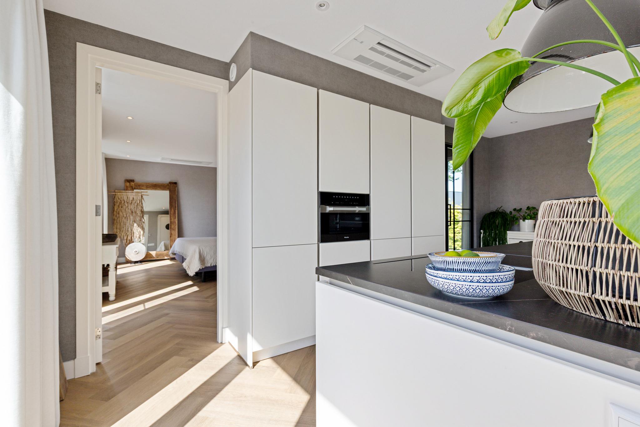 The kitchen is fully equipped with a high-end Miele appliance package: an induction cooktop with integrated extractor, combi-oven, dual fridge/freezer units, dishwasher, and Quooker. Adjacent to the kitchen, the 22 m² sundeck faces west and enjoys afternoon and evening sun with unobstructed views of the Franeker Canal. At water level, there's space to moor an additional boat alongside the main berth.