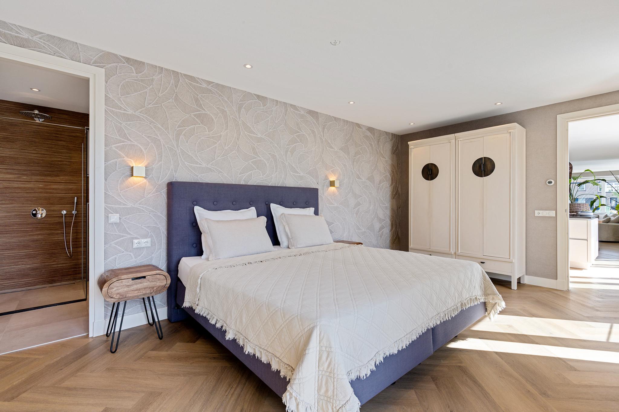 To the rear of the living space lies the primary suite, complete with en-suite bathroom featuring refined relief tiling, walk-in shower, stylish vanity, and a second toilet. This floor is finished with a herringbone PVC floor, underfloor heating, and air conditioning throughout.