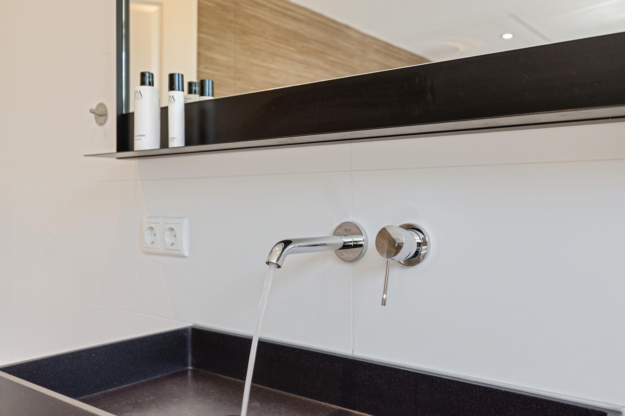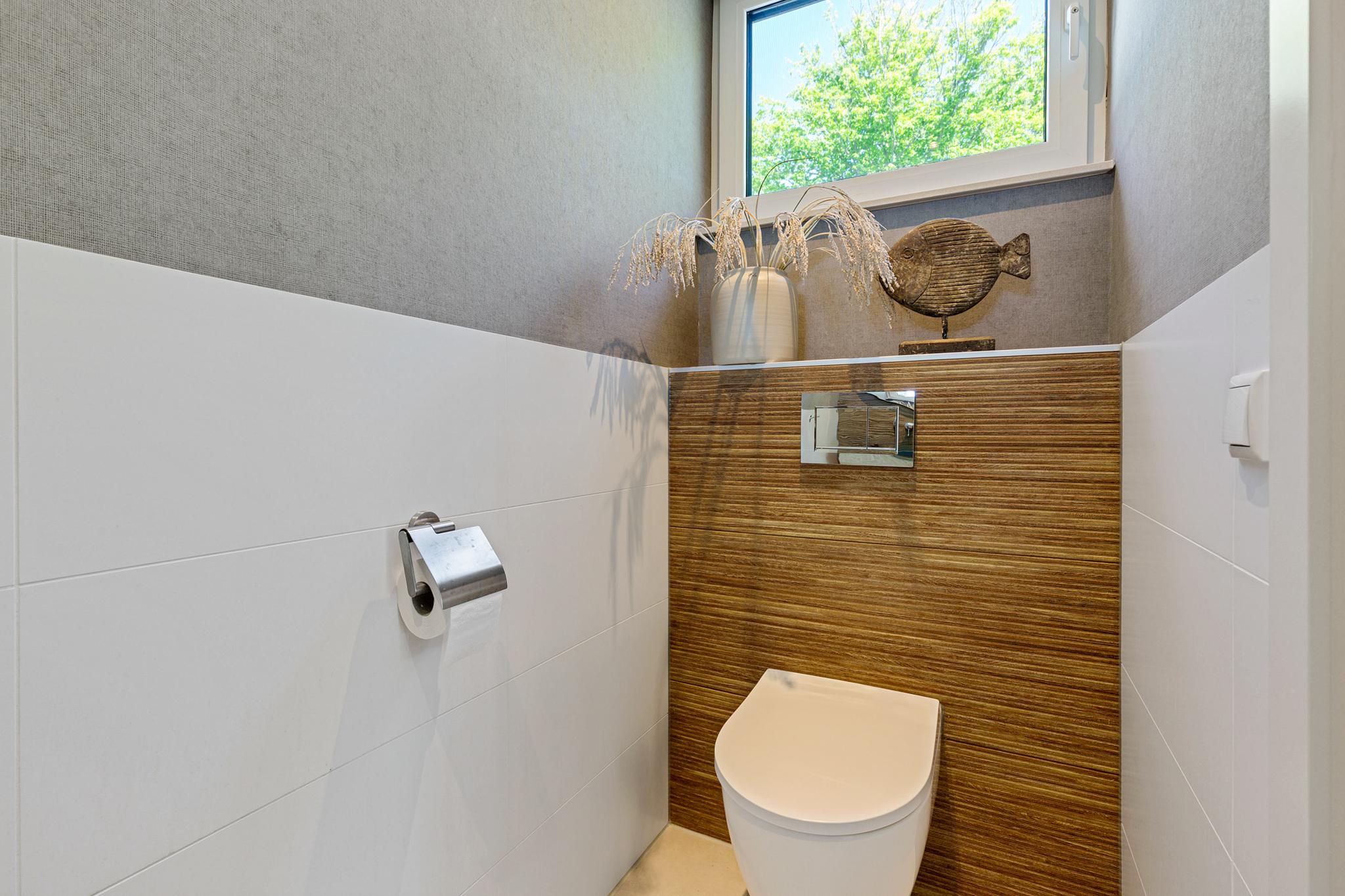 Upon entering, a hall with cloakroom and guest toilet welcomes you. Industrial-style glass doors open into the expansive living room—and the view is simply breathtaking. Thanks to three large sliding doors and floor-to-ceiling windows, the connection to the water is immediate. Elevated above the lower level, the open-plan kitchen and living area provide privacy as well as stunning vistas.